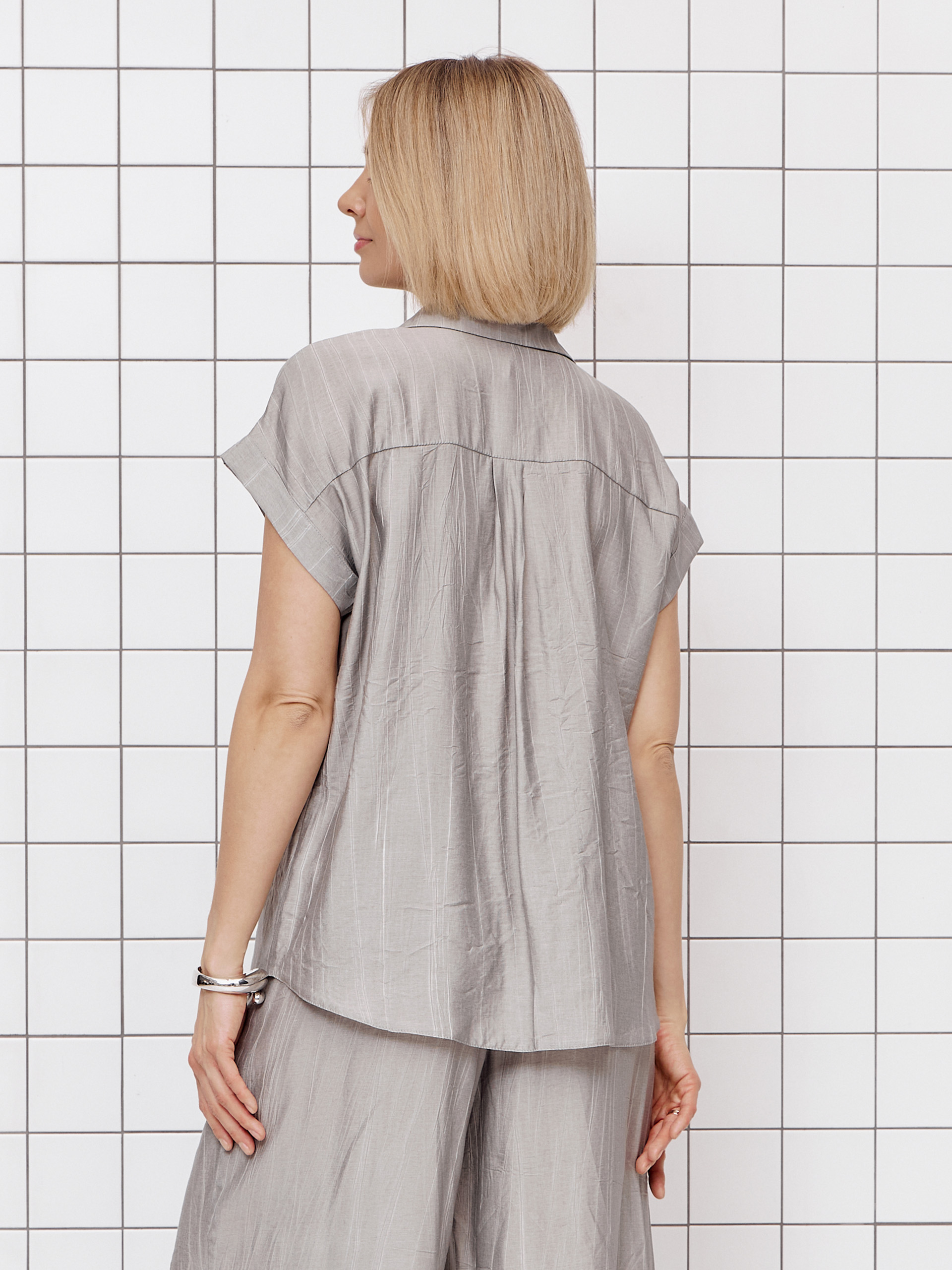 Рубашка из из фактурной смесовой ткани, с вискозой и льном в составе, с застиранным эффектом.