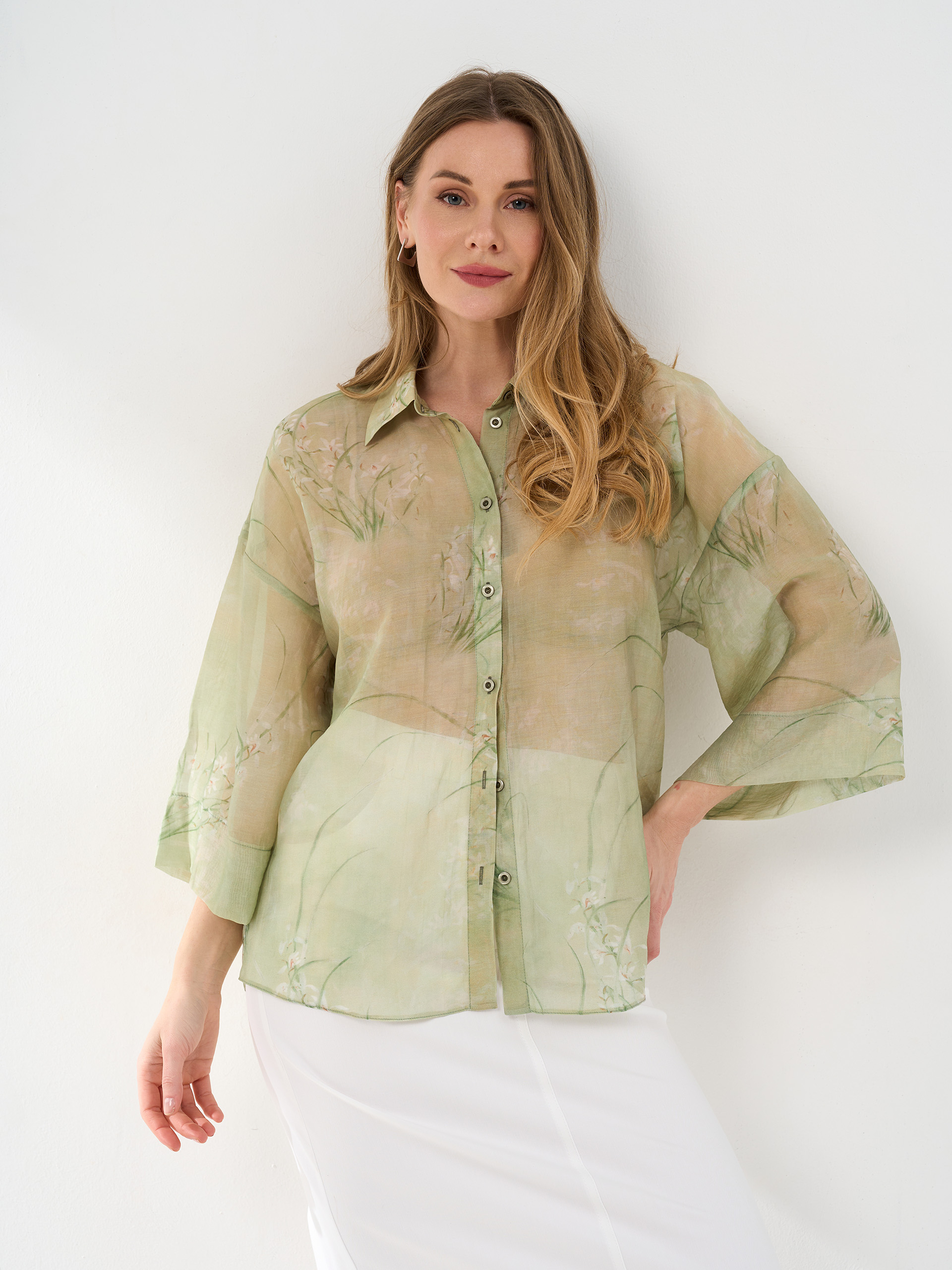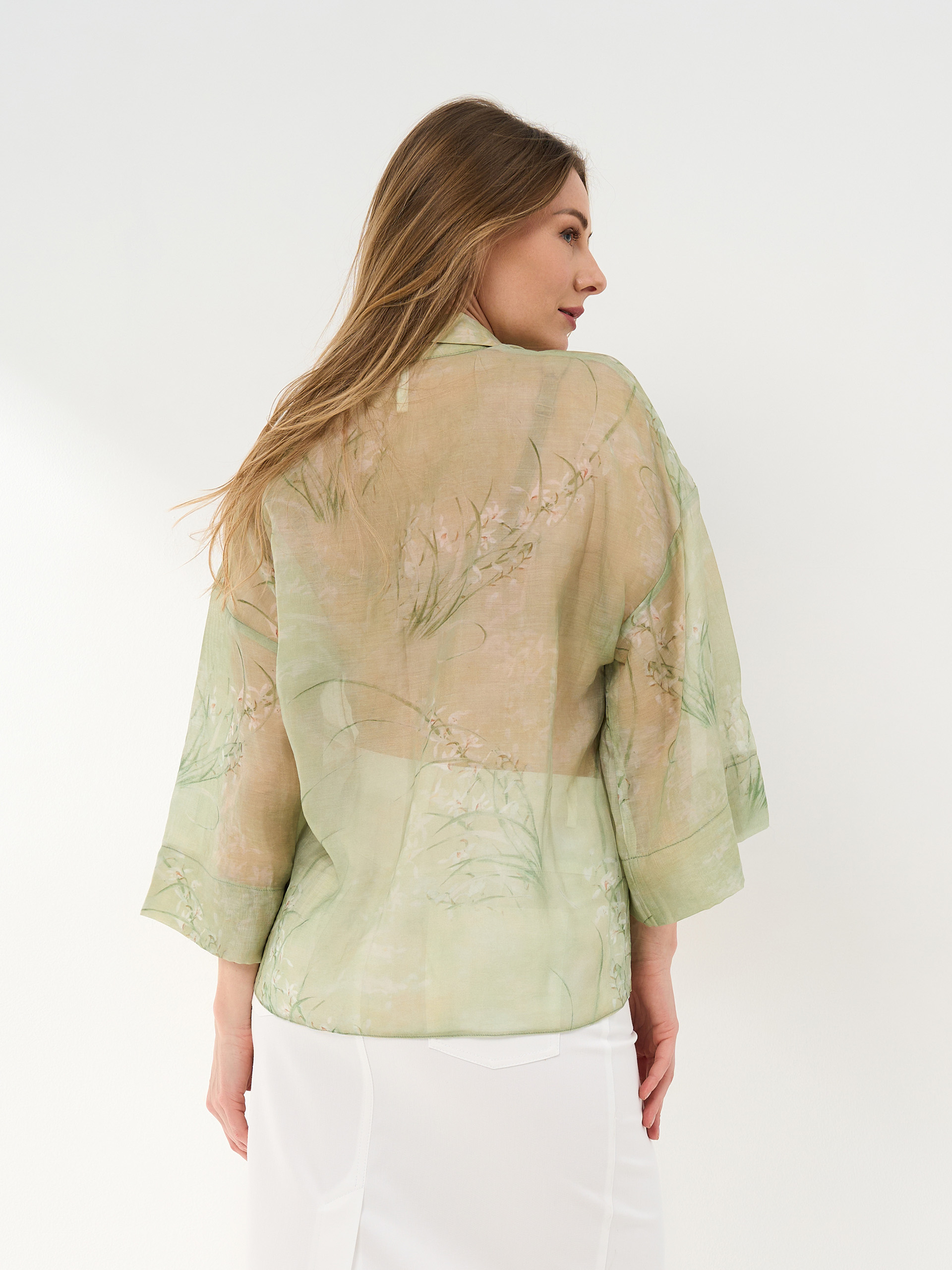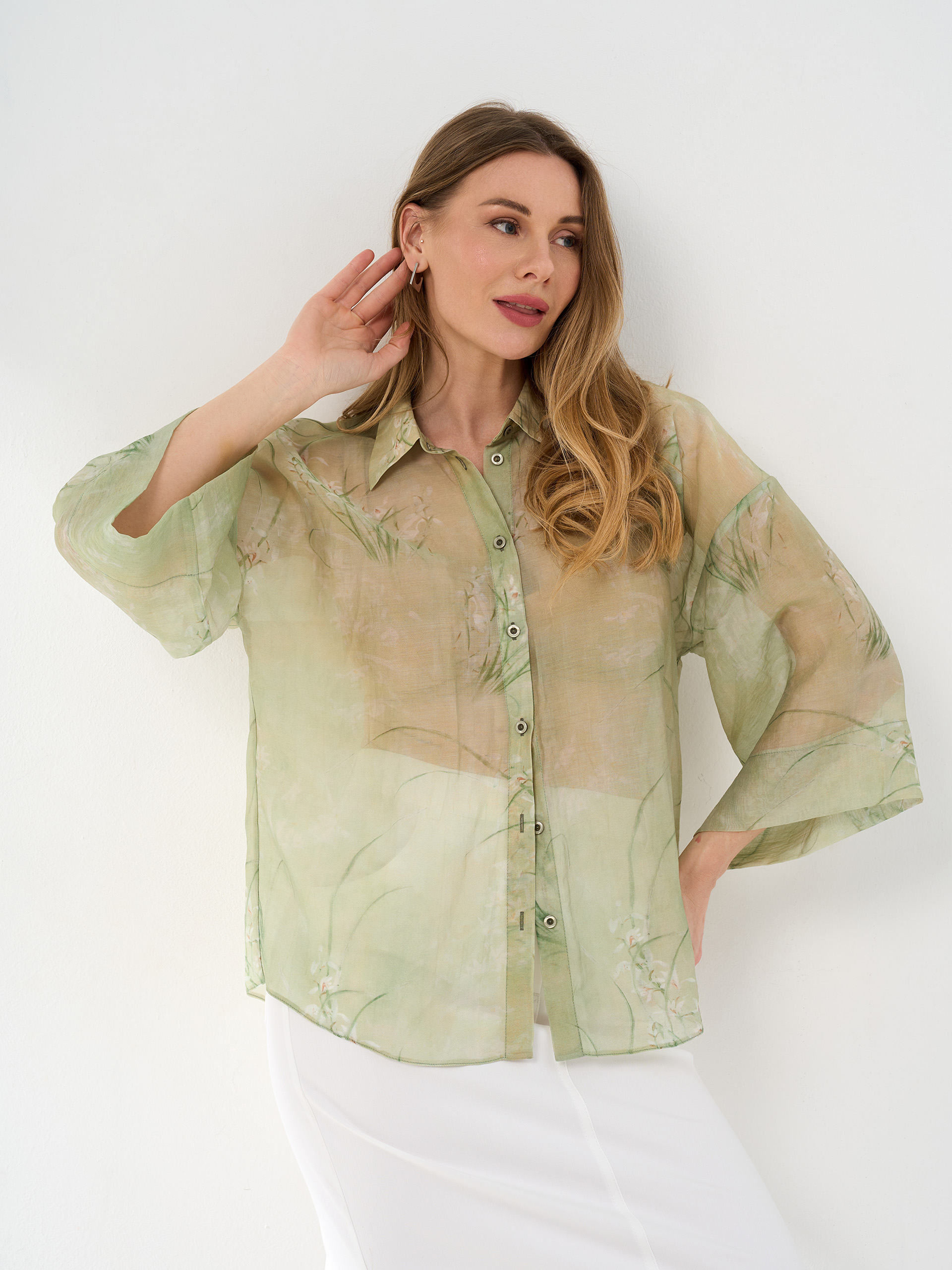 Блузка прямого силуэта, из легкой ткани зеленого цвета с принтом, воротник стояче-отложной, спущенная линия плеча, рукава 3/4.
