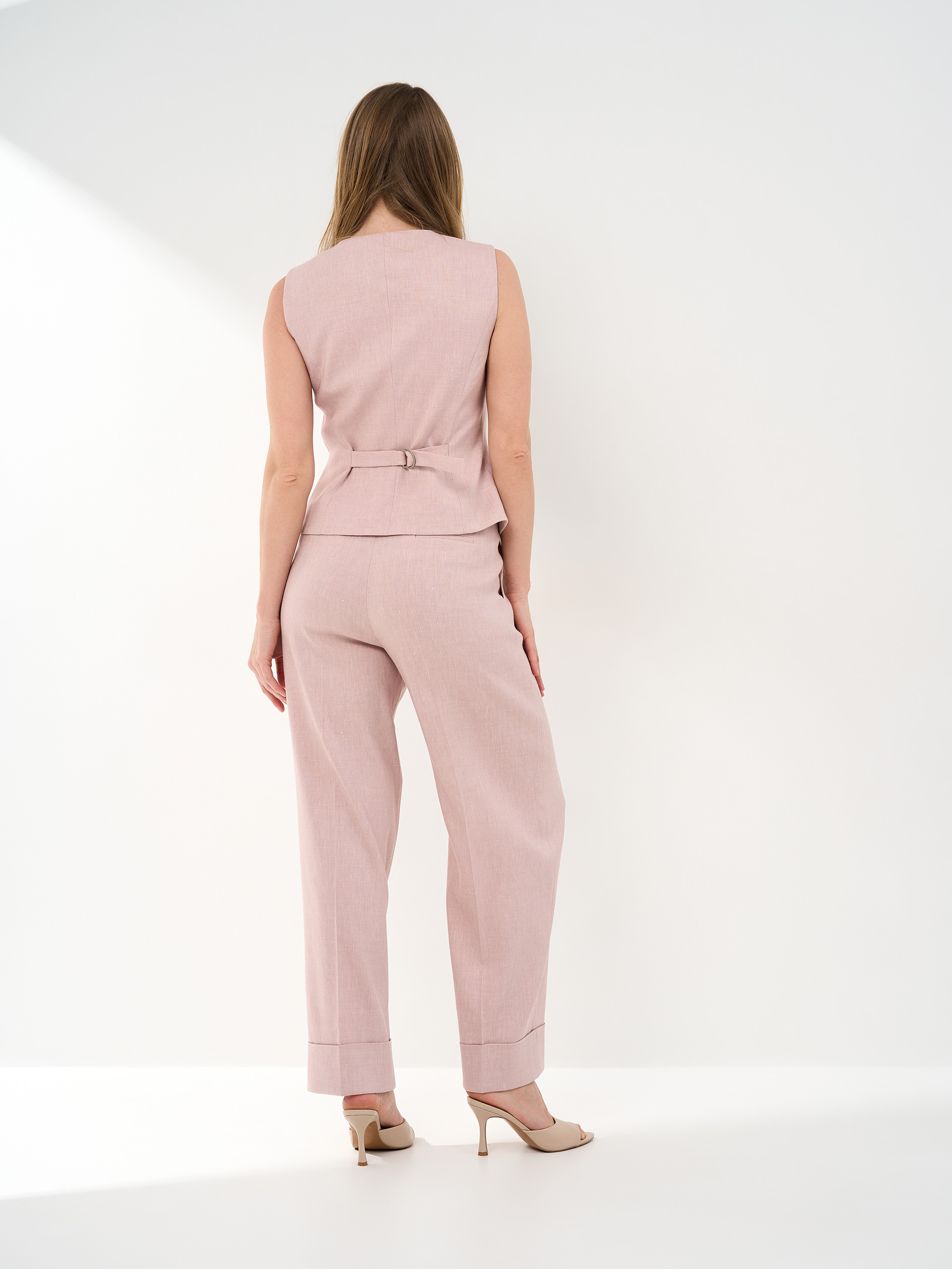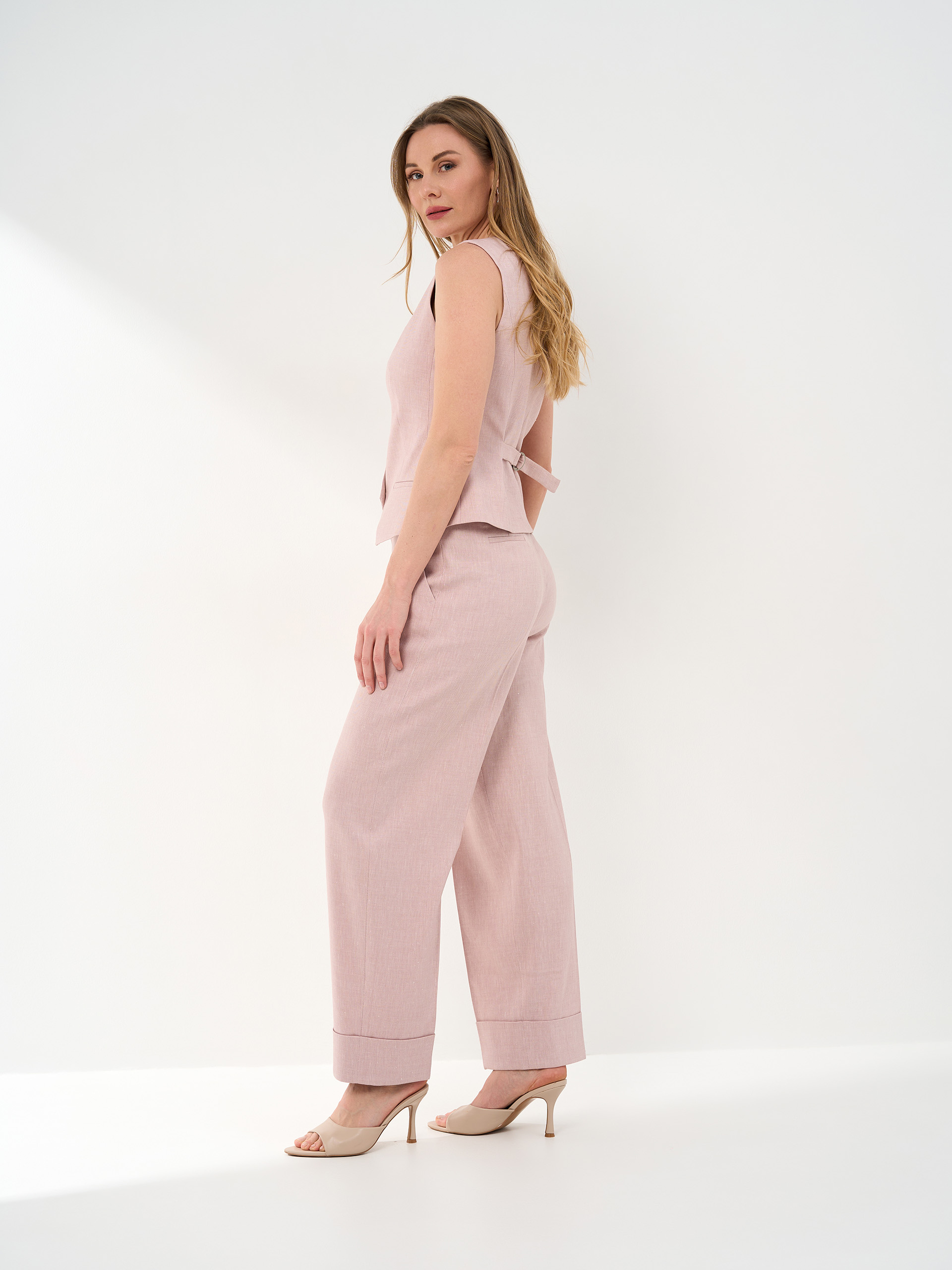 Брюки укороченные прямые, из льняной ткани пудрового цвета.