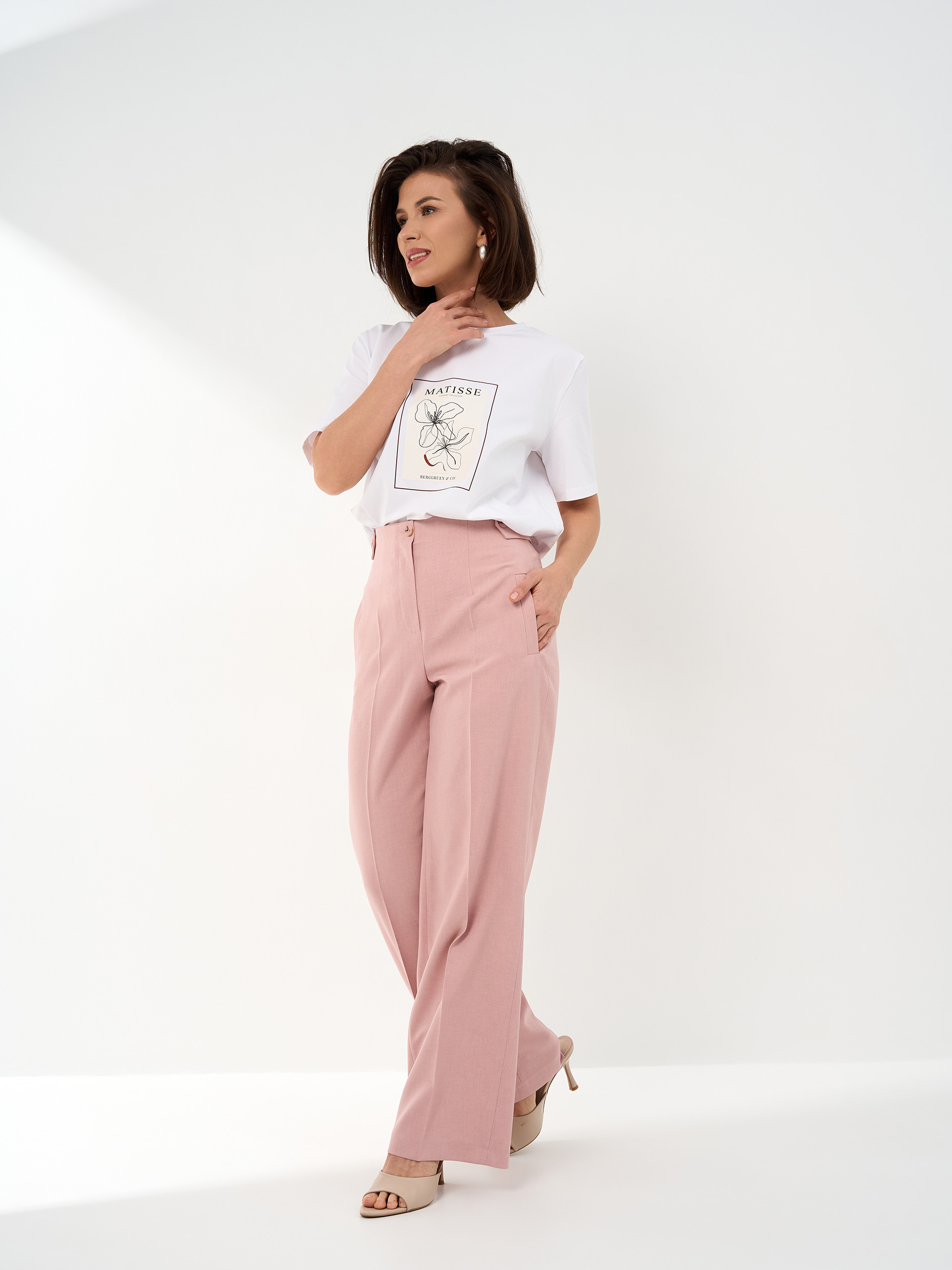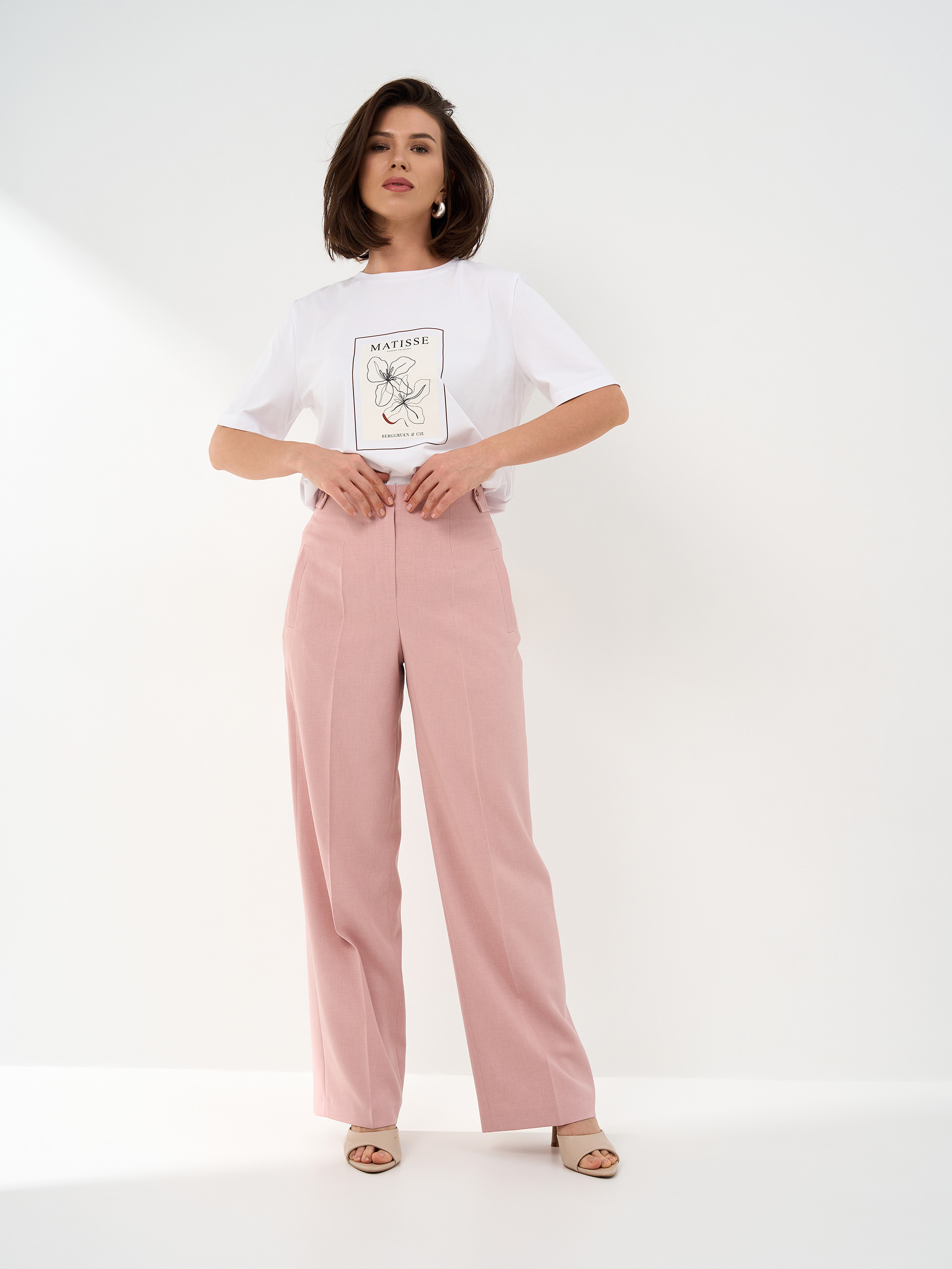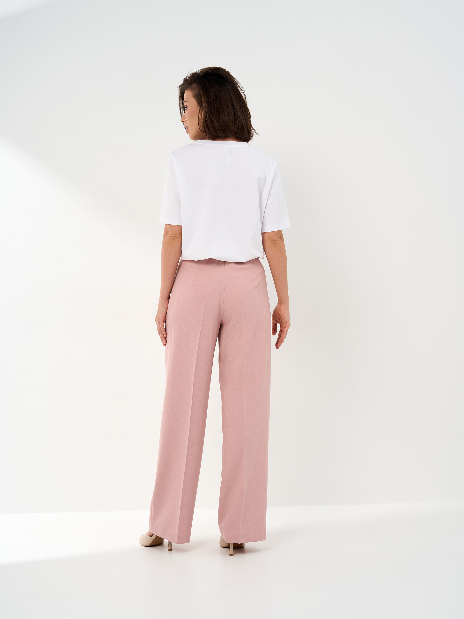 Брюки свободные, длинные со вставкой резинкой по задней половинке, декоративные паты у пояса, линия талии стандартной высоты. Из фактурной смесовой с хлопком сжатой ткани.