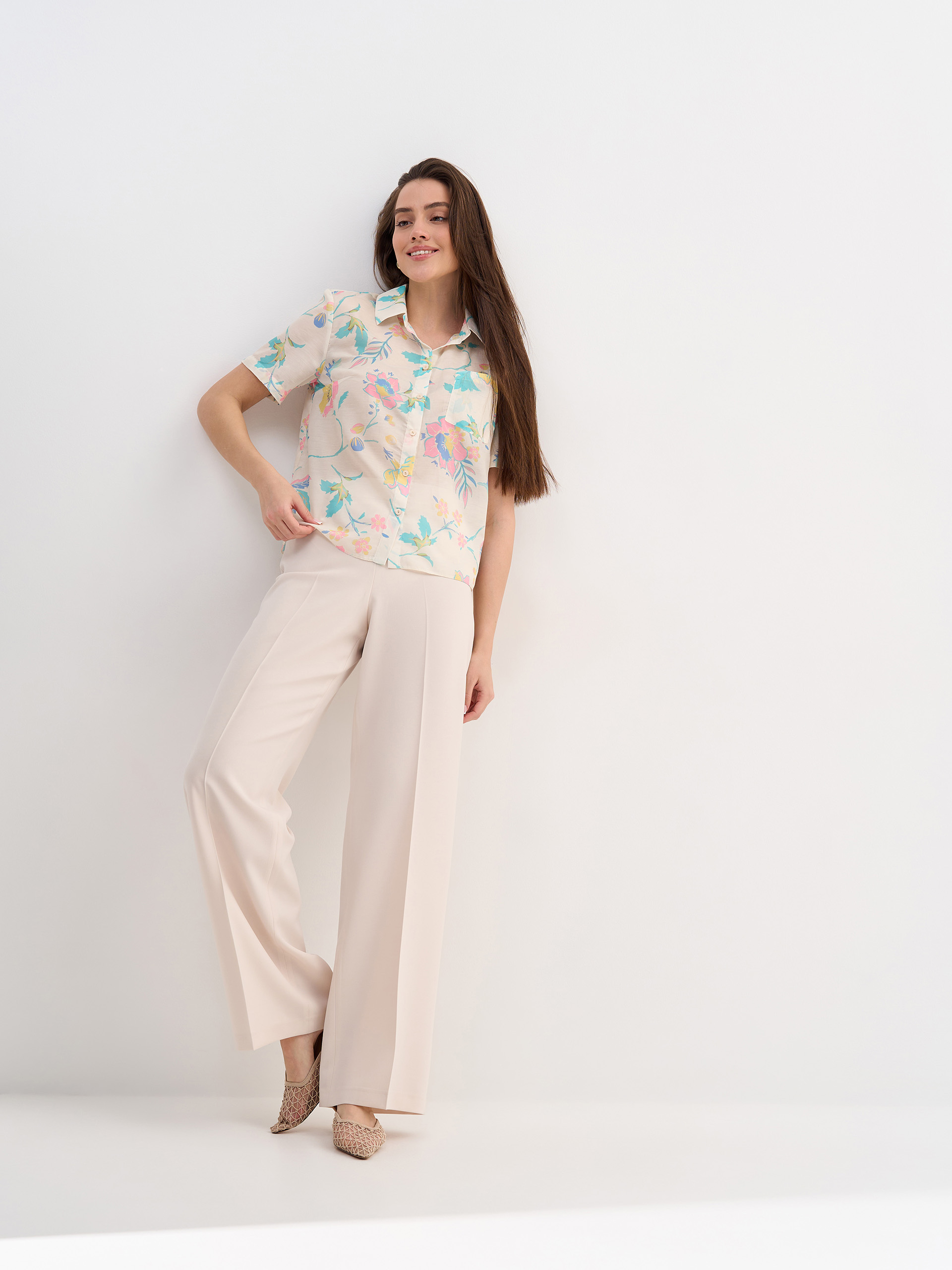 Брюки прямые со стрелками, завышенная линия талии, застежка на потайную молнию. Костюмная струящаяся ткань с вискозой в составе цвета топленого молока.
