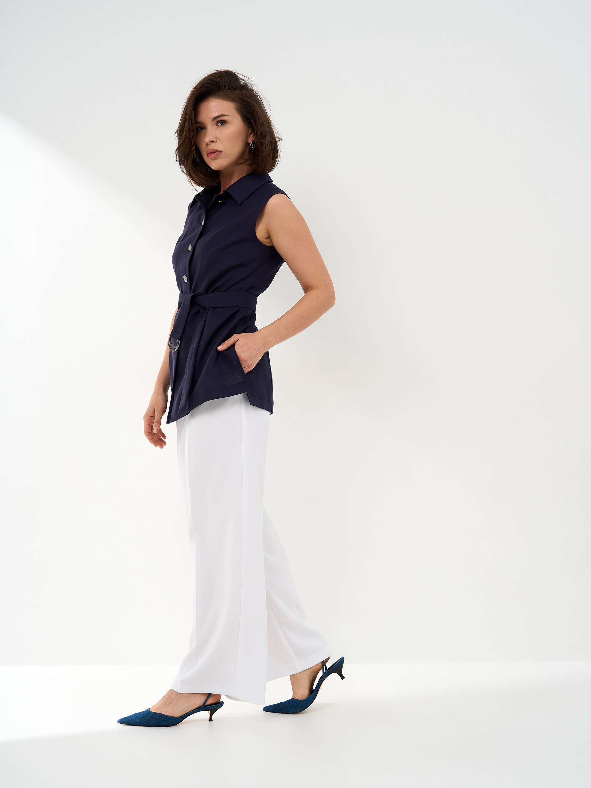 Брюки свободного прямого силуэта, с застроченными защипами, из смесовой с хлопком легкой немнущейся ткани.