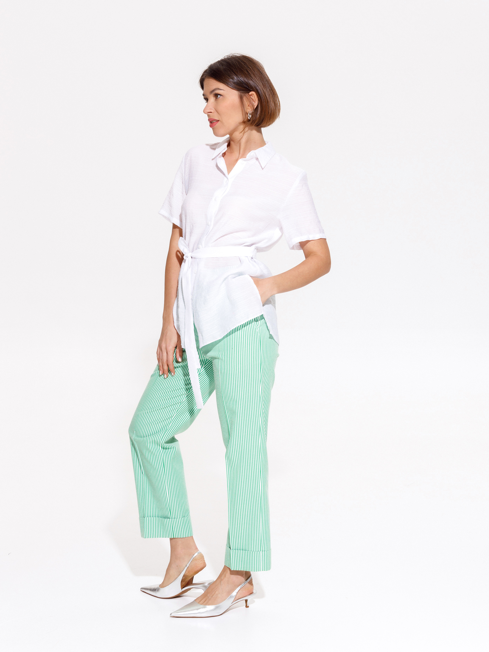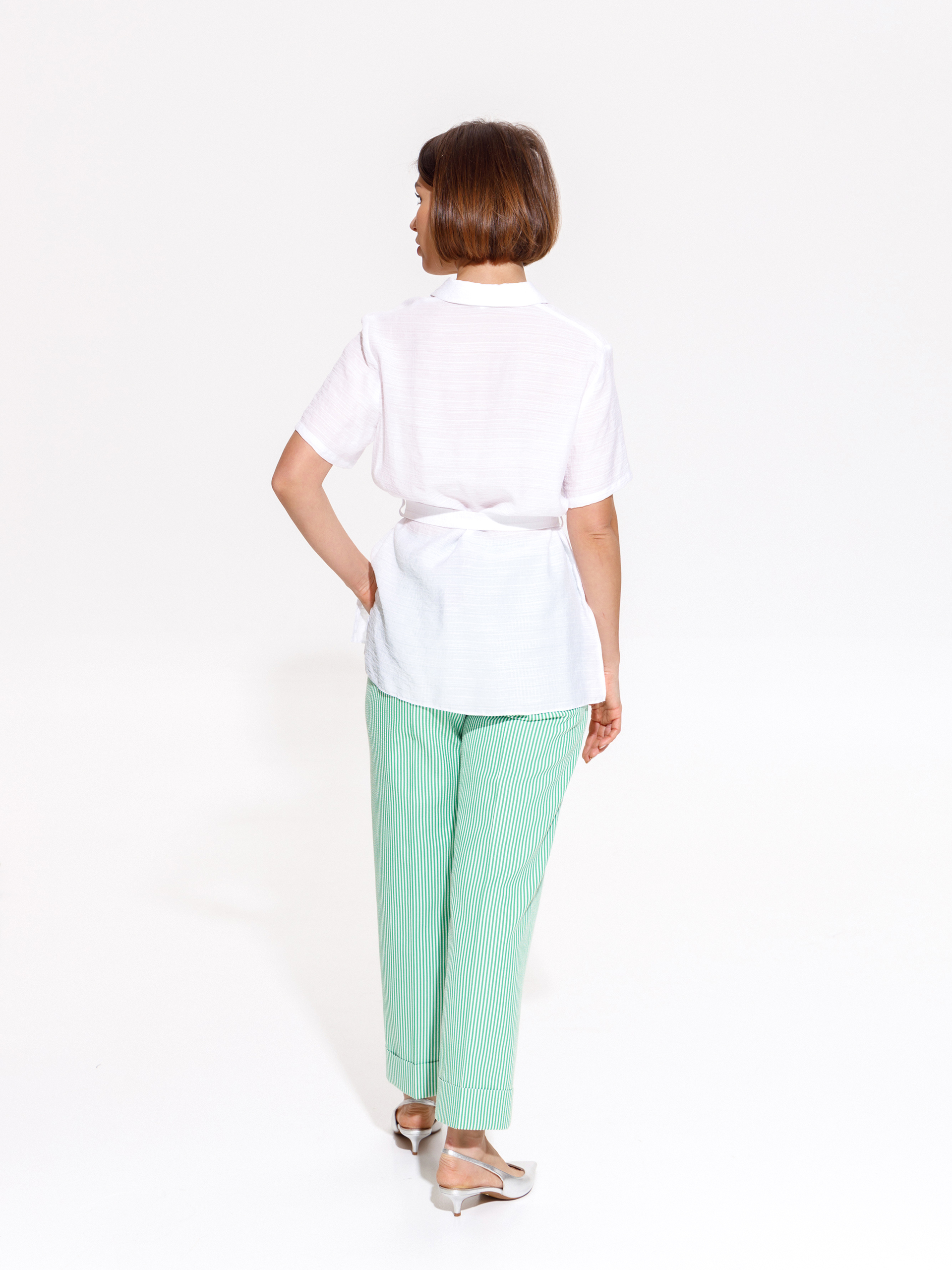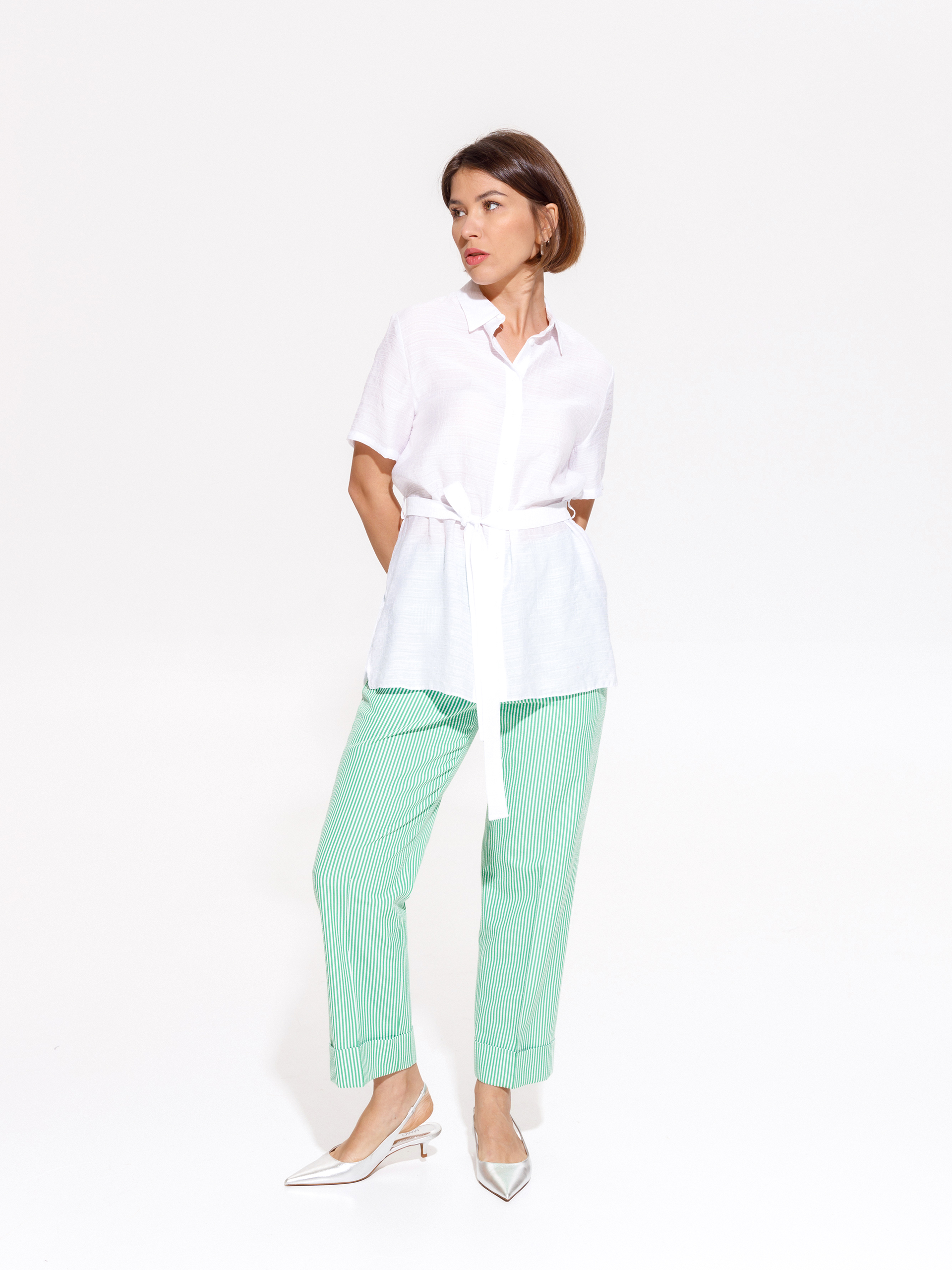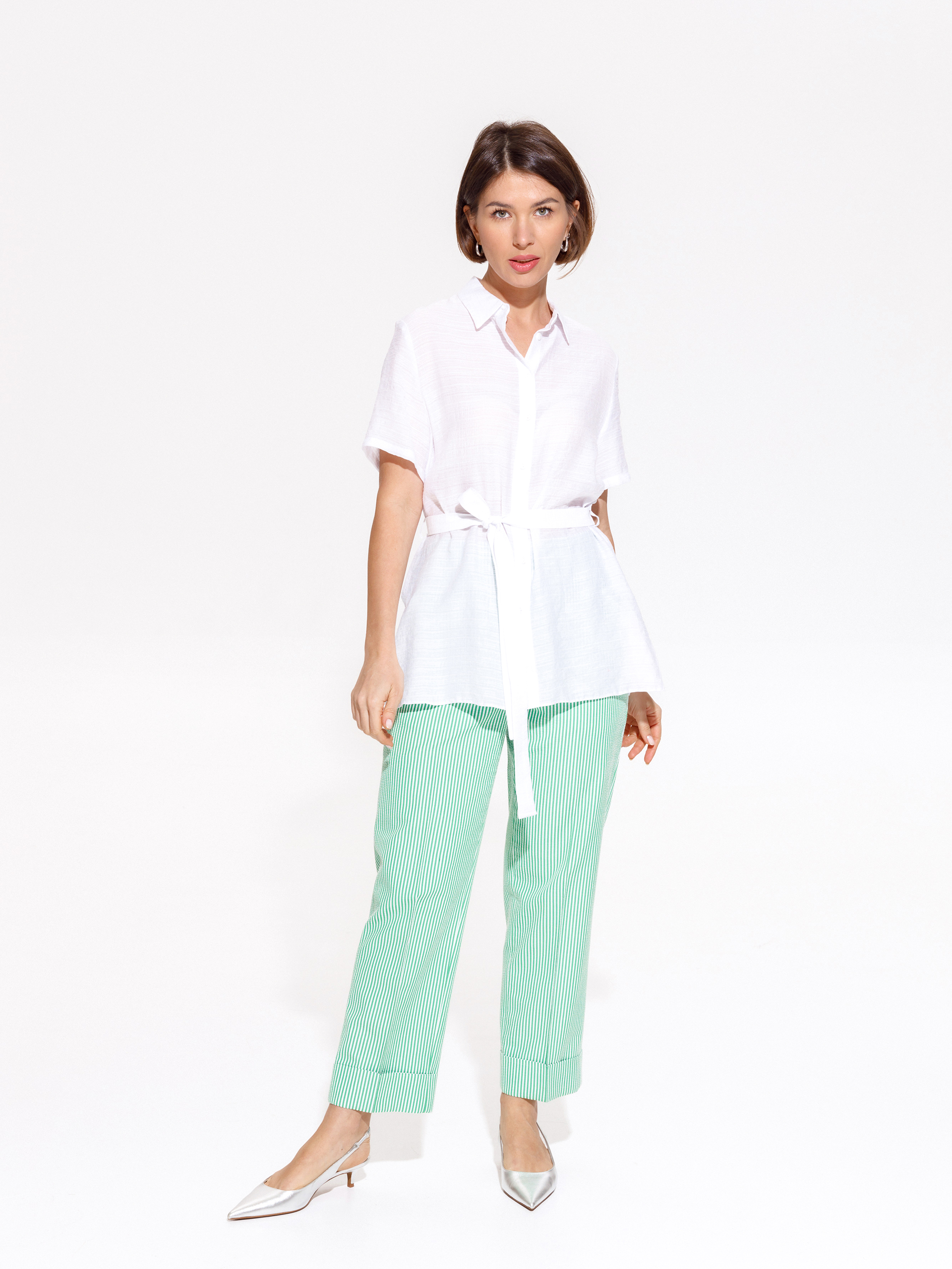 Блузка-рубашка с поясом, удлиненная, из белой тонкой фактурной