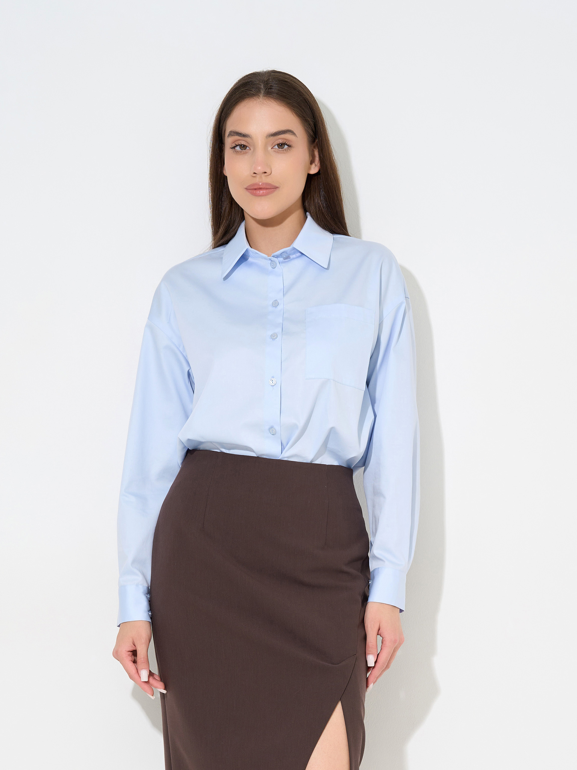 Хлопковая рубашка средней длины, накладной карман.