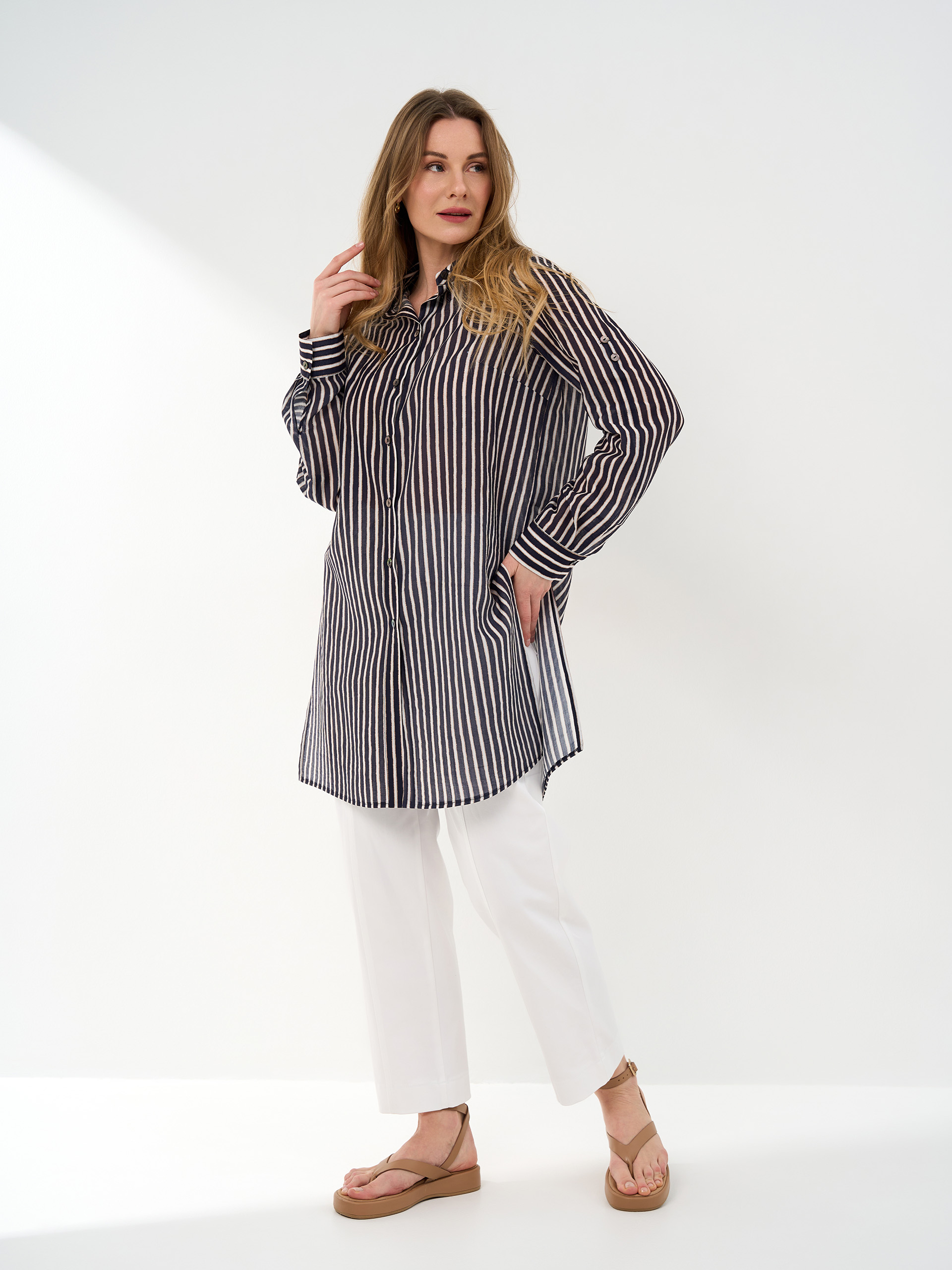 Рубашка удлиненная, из легкой ткани темно-сине-оранжево-белой полоски, разрезы в боковых швах.