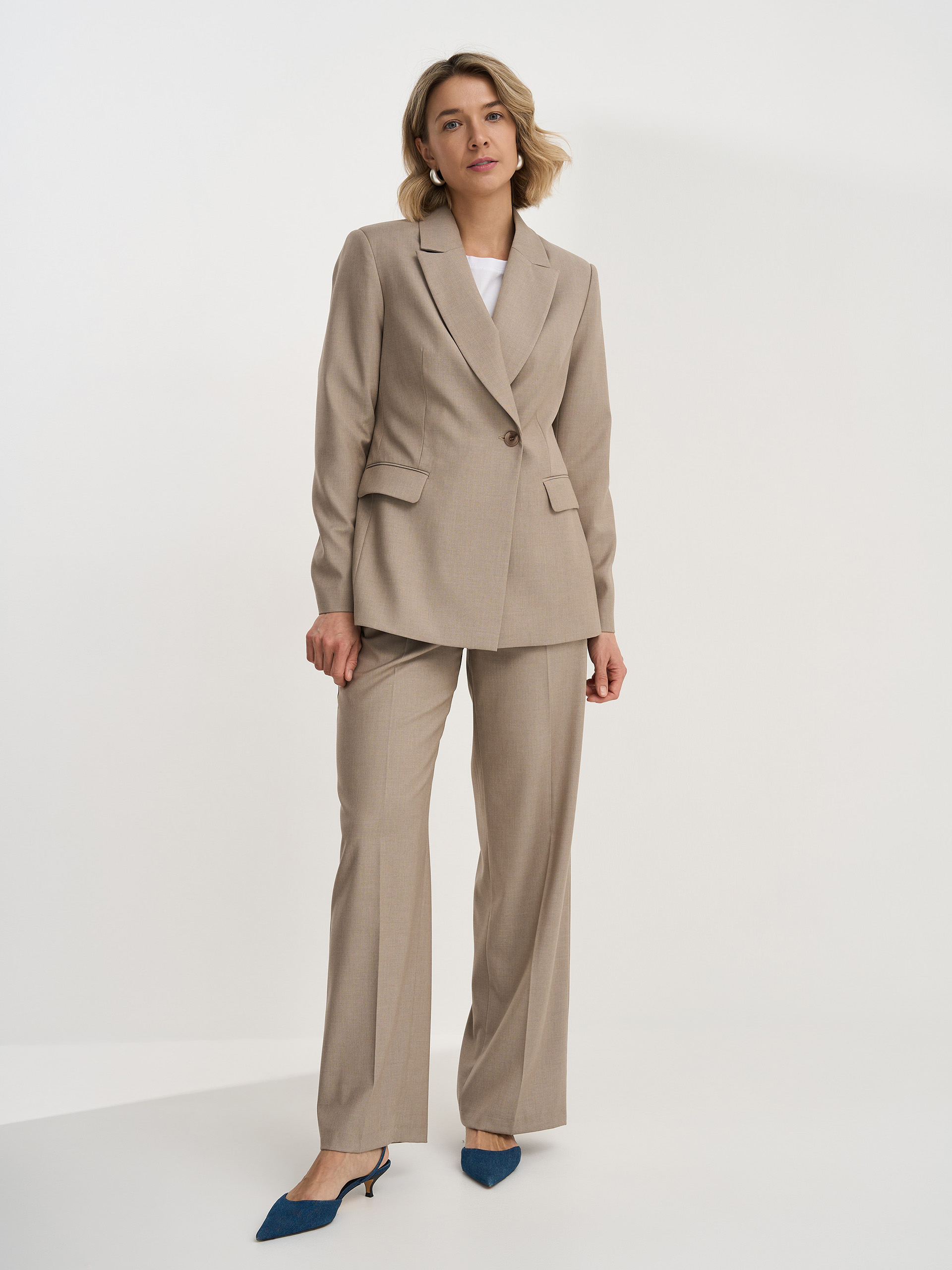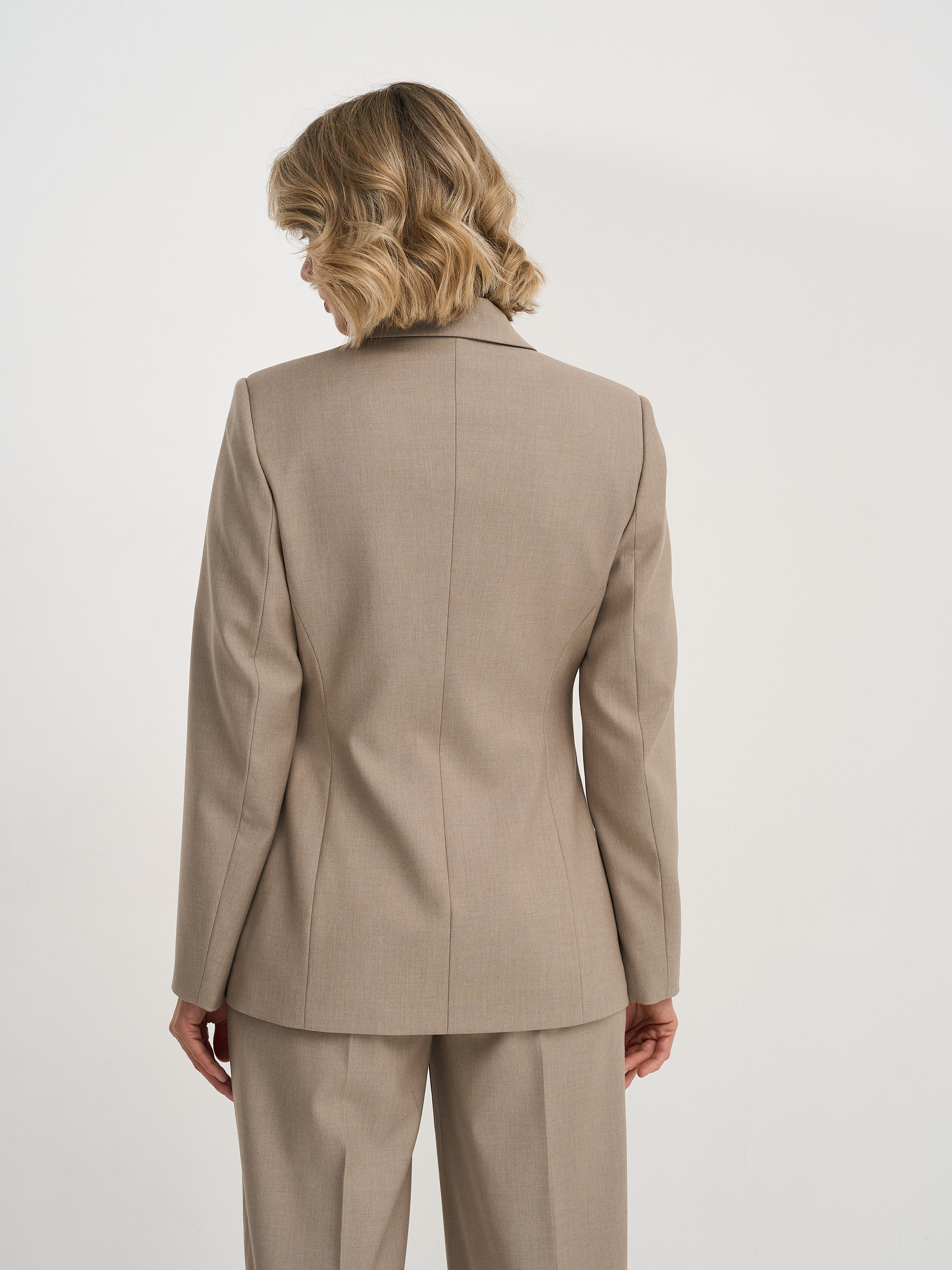 Жакет полуприлегающего силуэта, из гладкой костюмной ткани содержащей шерсть бежевого цвета, английский воротник, двубортный с застежкой на одну пуговицу, на подкладе.