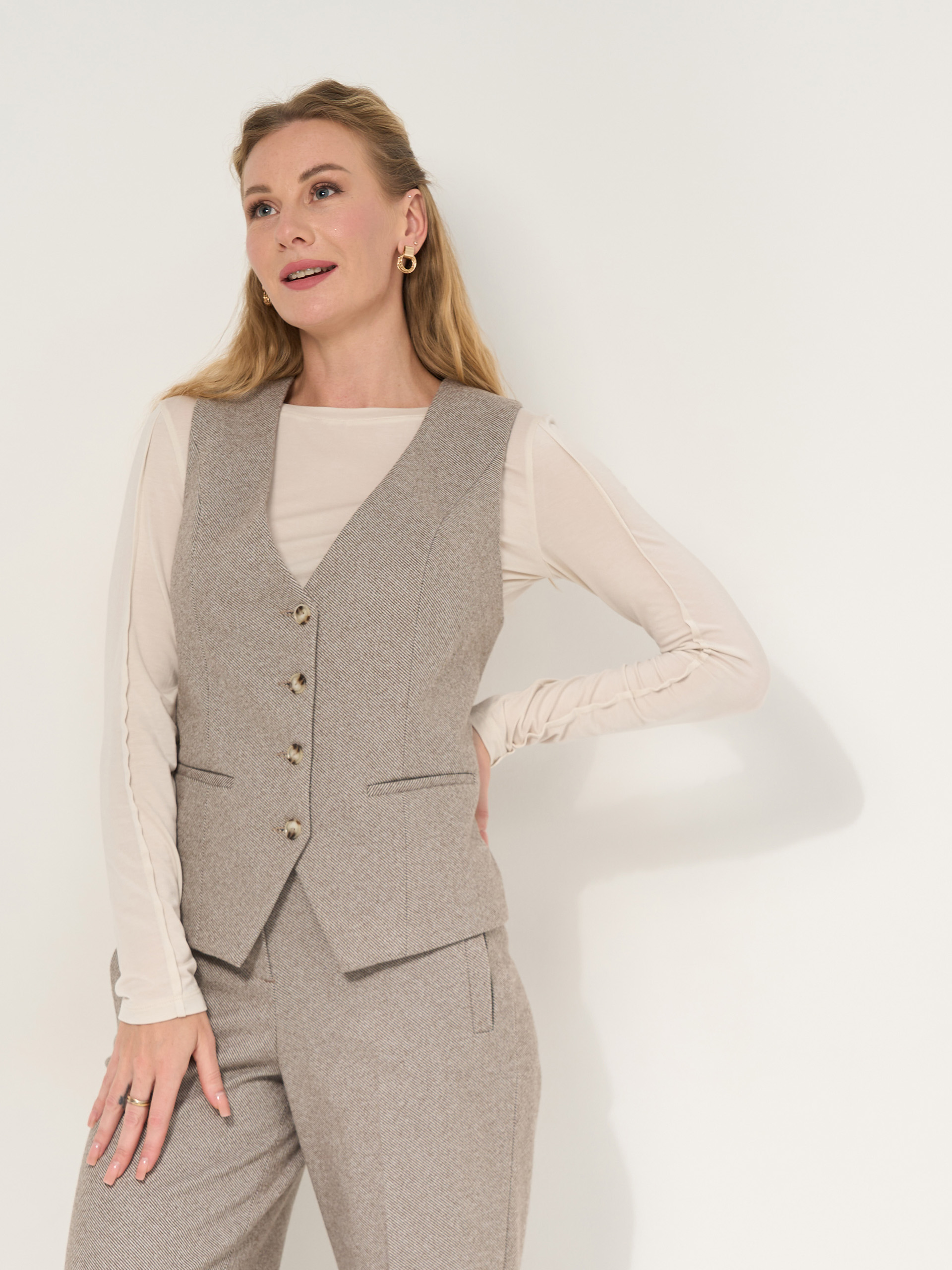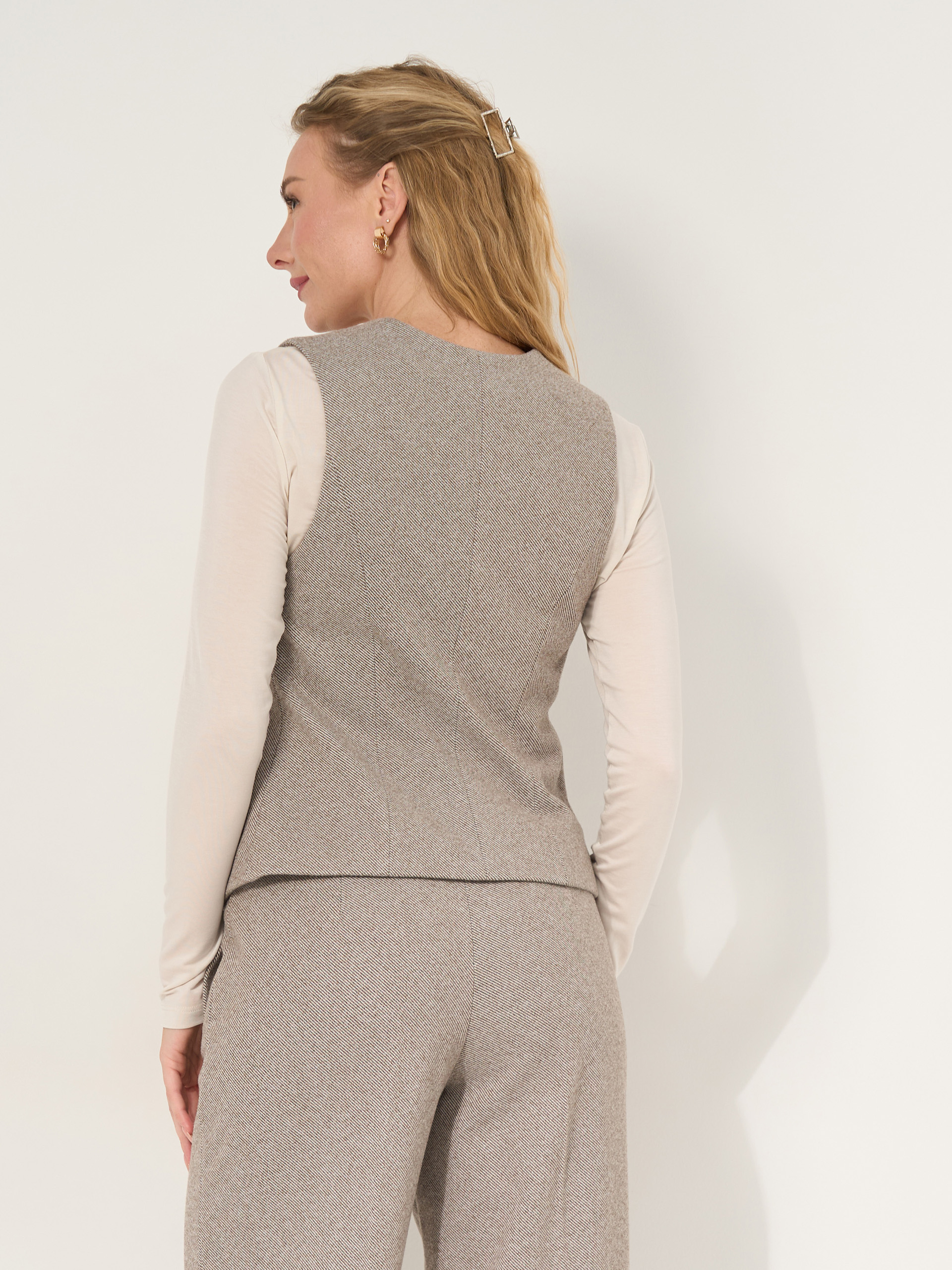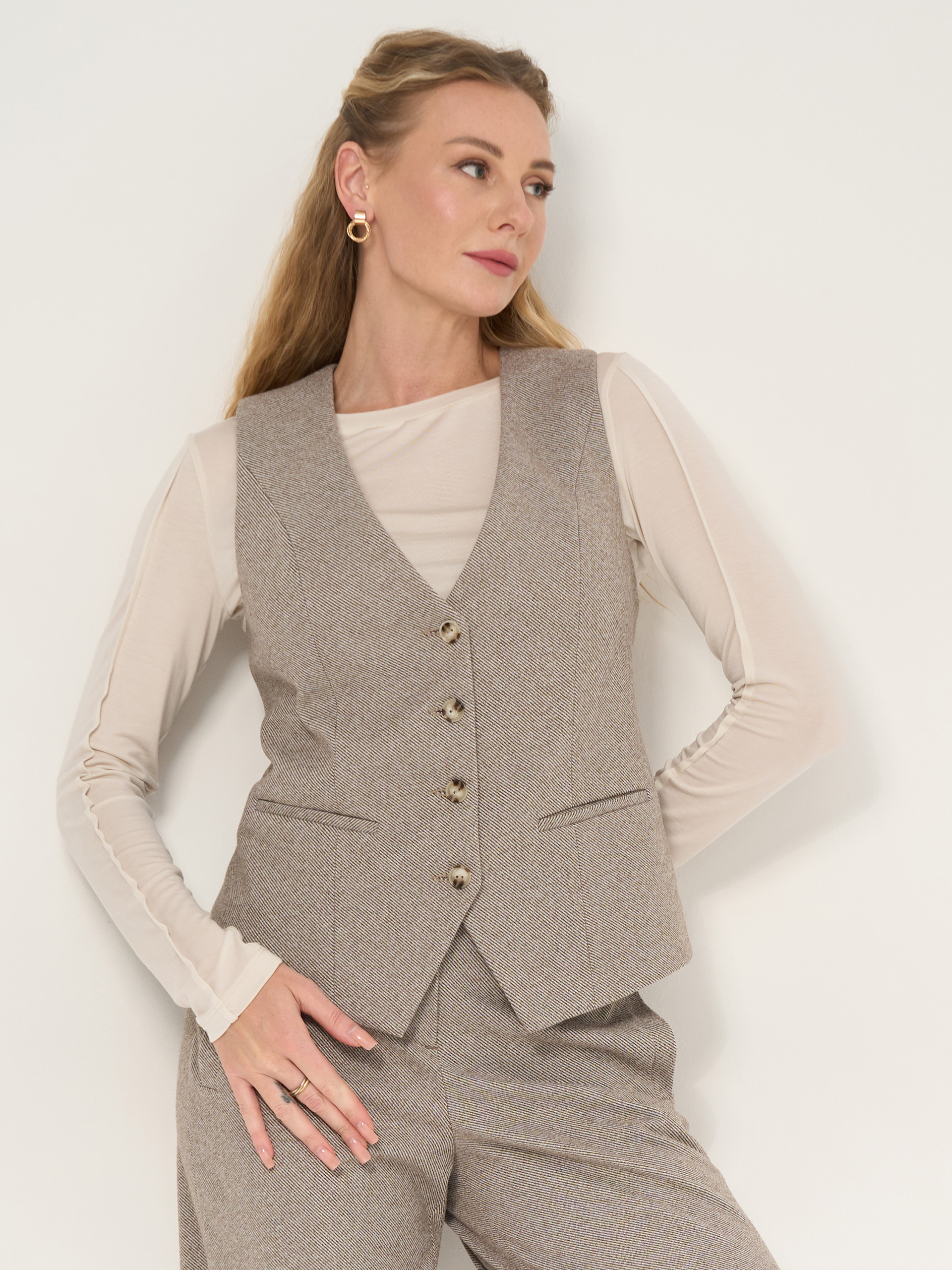 Жилет приталенный,  из плотной мягкой вискозной костюмной ткани бежевого меланжевого цвета.