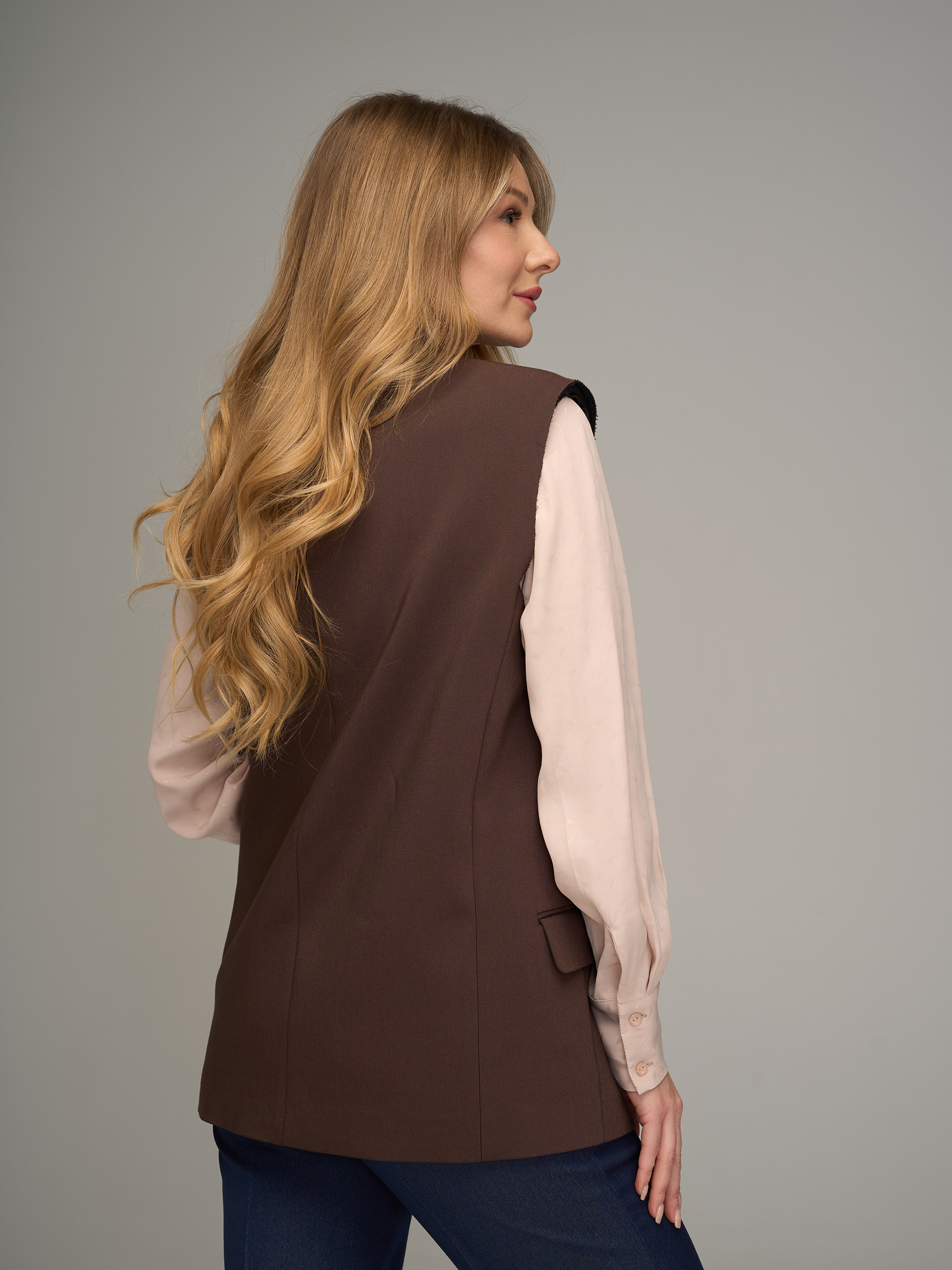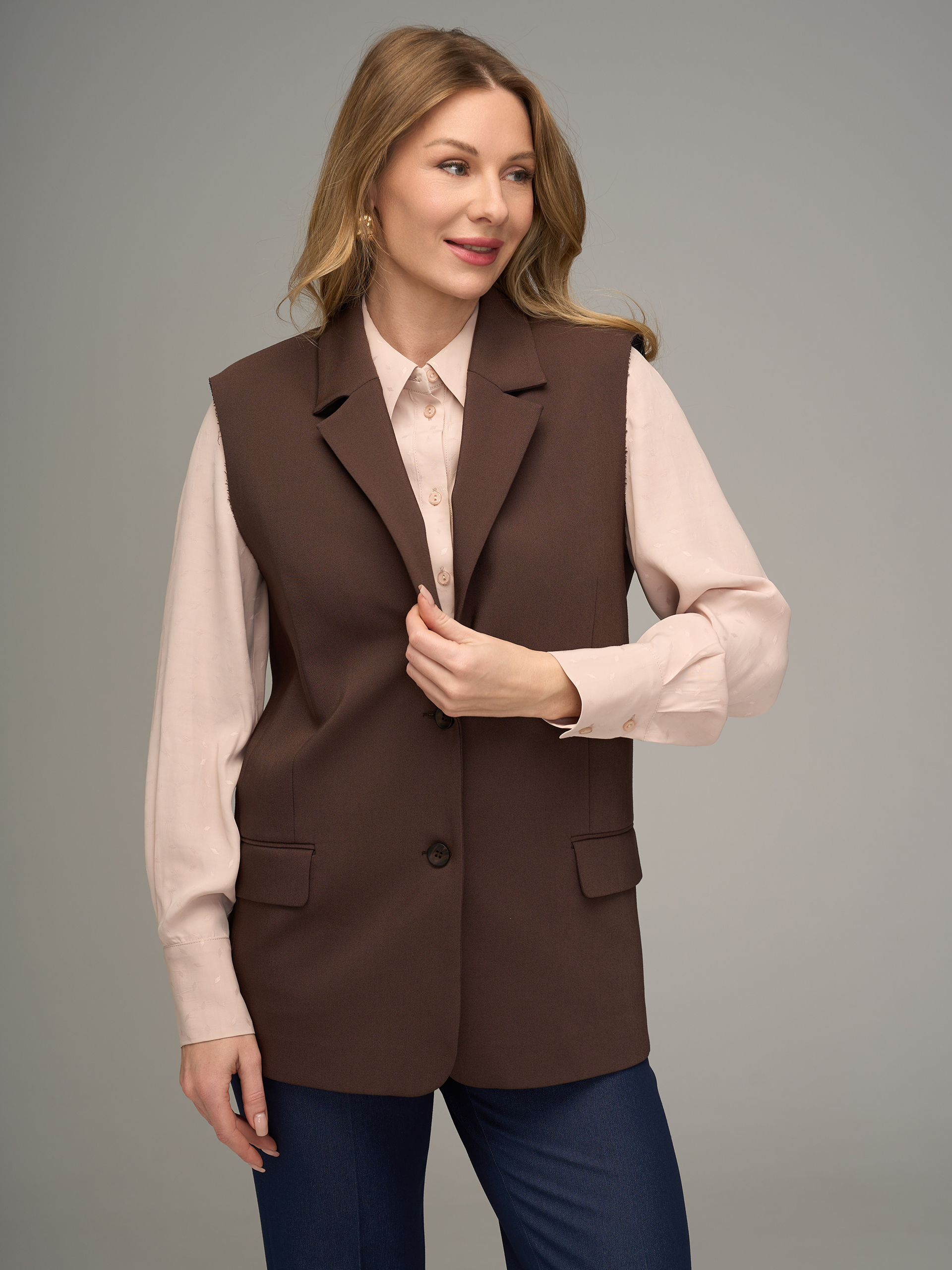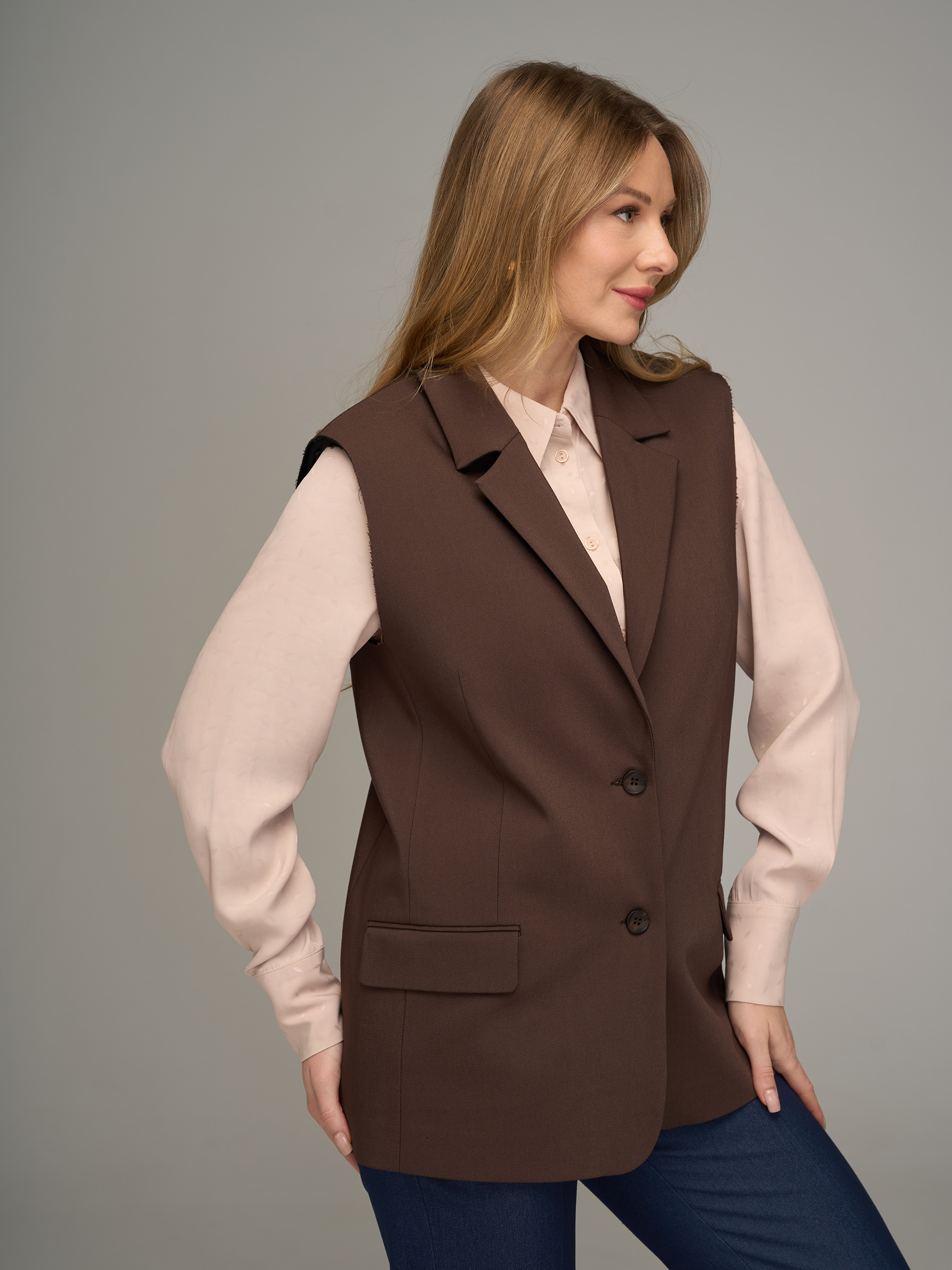 Жилет в стиле деконструктивизм, необработанная линия плеча, подклад, прямой силуэт, из смесовой с вискозой и хлопком костюмной ткани цвета шоколадная пудра.