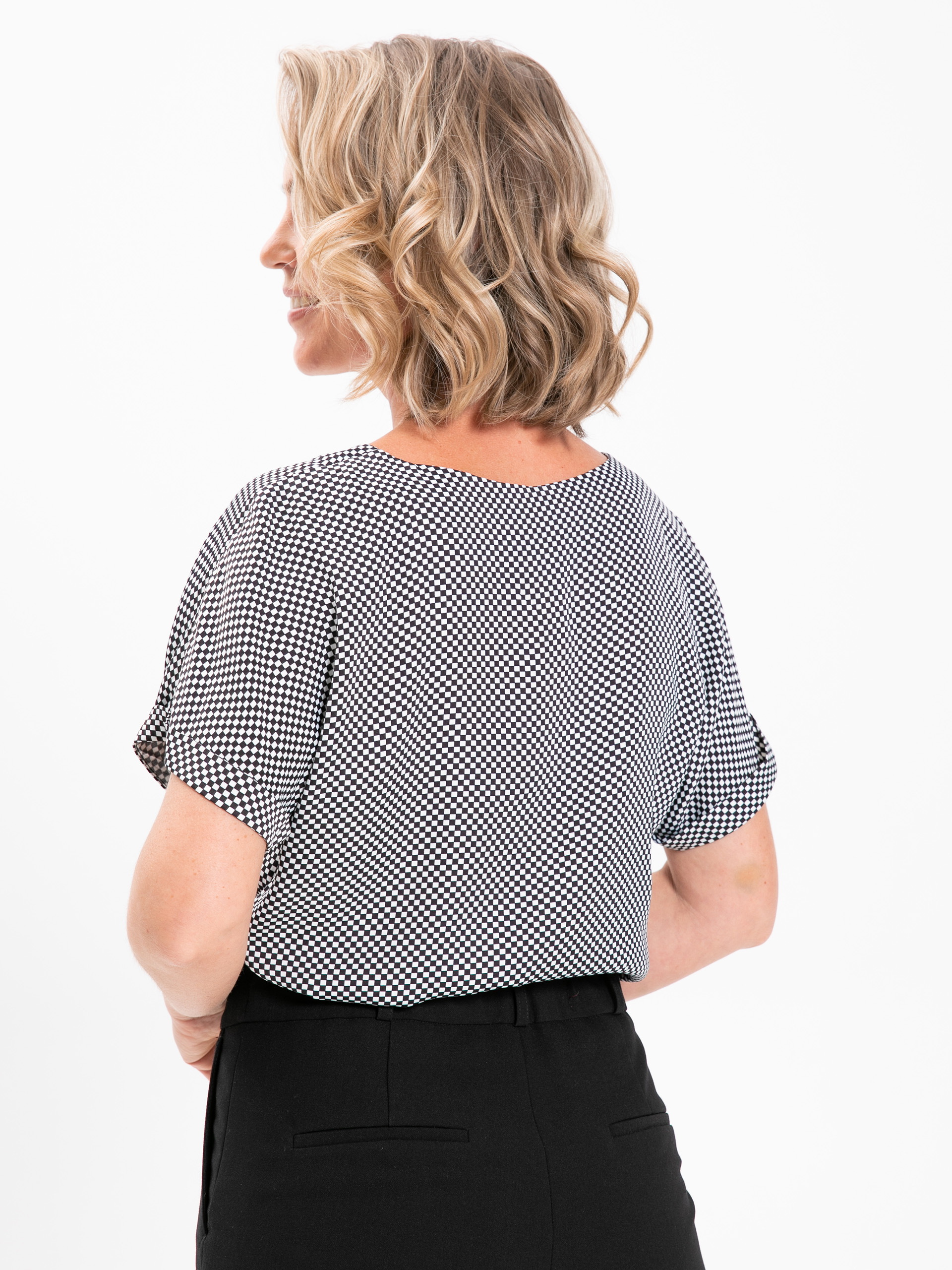 Блузка со спущенным рукавом, из шелковистой вискозной ткани с черно-белым принтом.