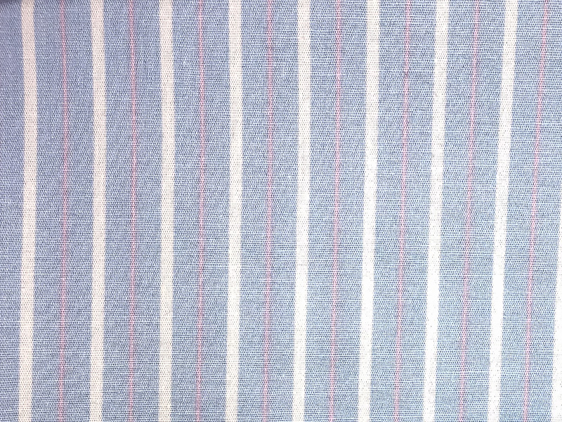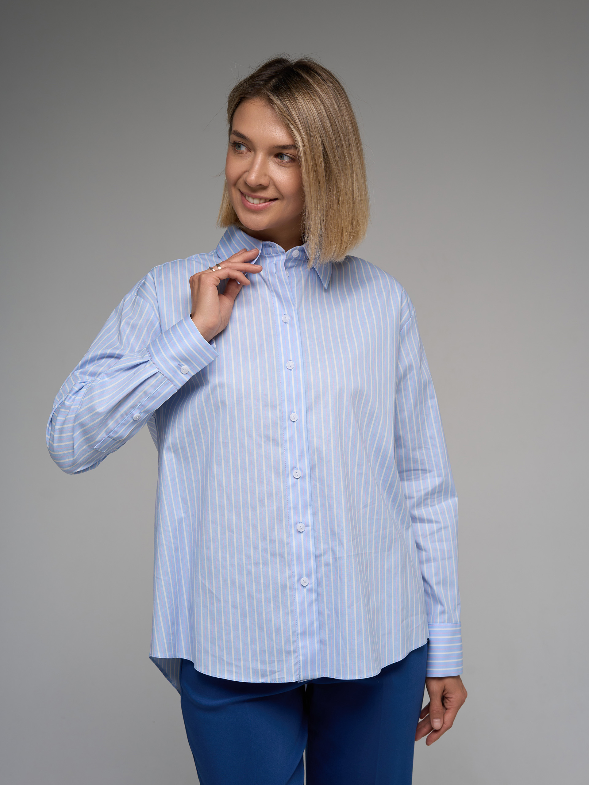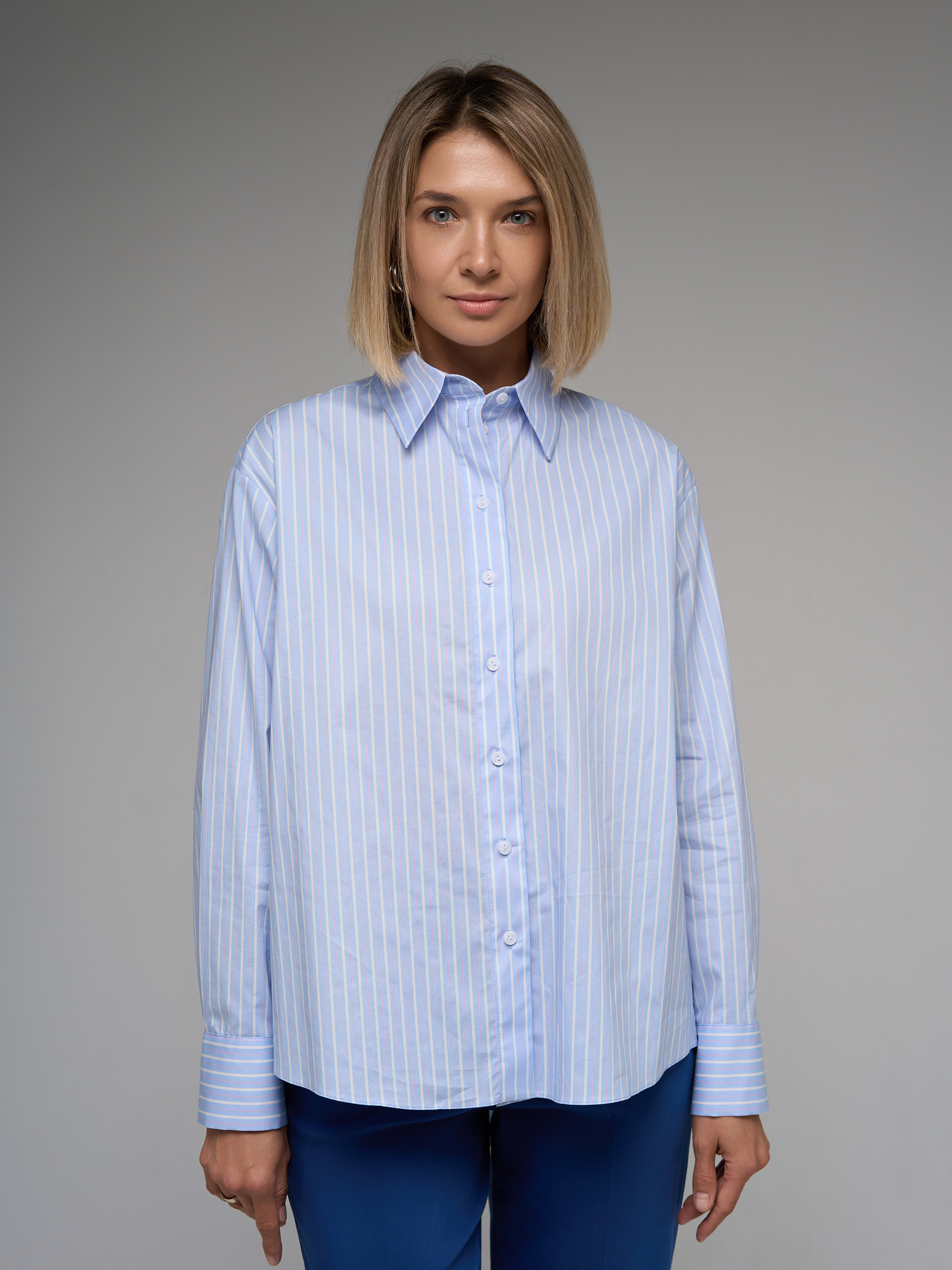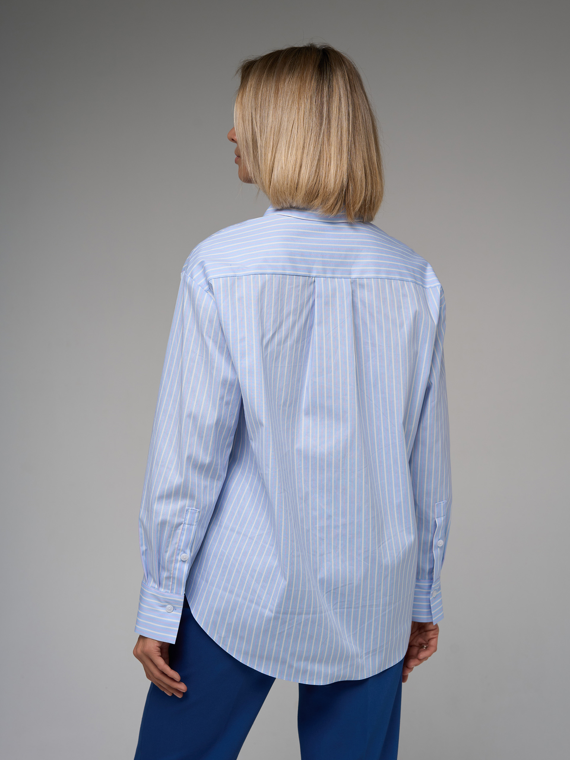 Рубашка прямого силуэта, из хлопковой ткани голубого цвета с бело-розовой полоской, слегка оверсайз.