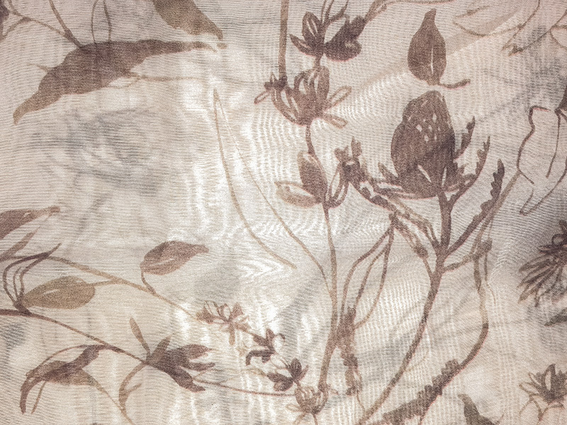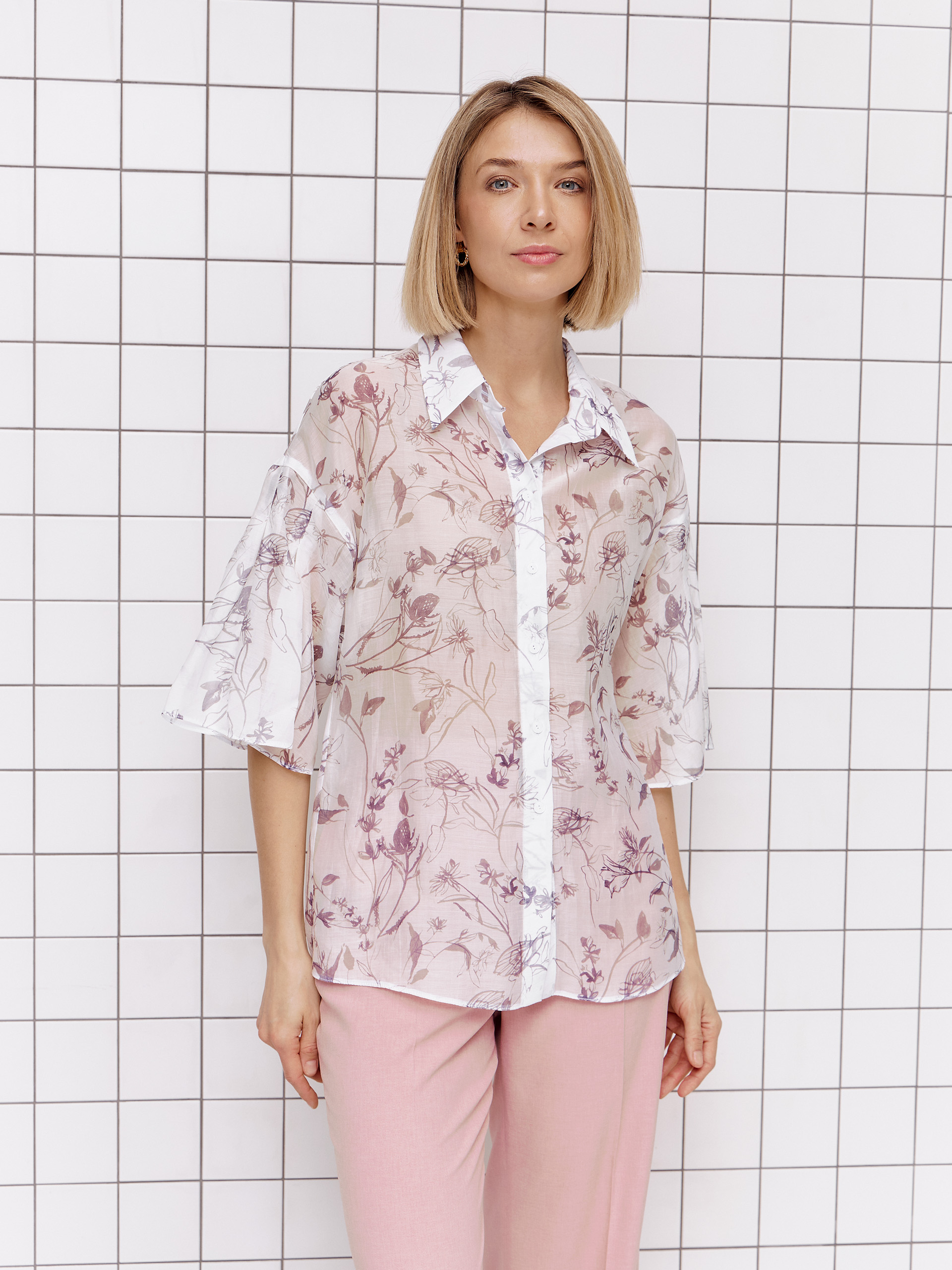 Блузка с воздушными рукавами, из легкой тенсельной ткани белого цвета с графитовыми цветами, воротник стояче-отложной, прямого силуэта, короткие рукава с недоконца застроченными складками.