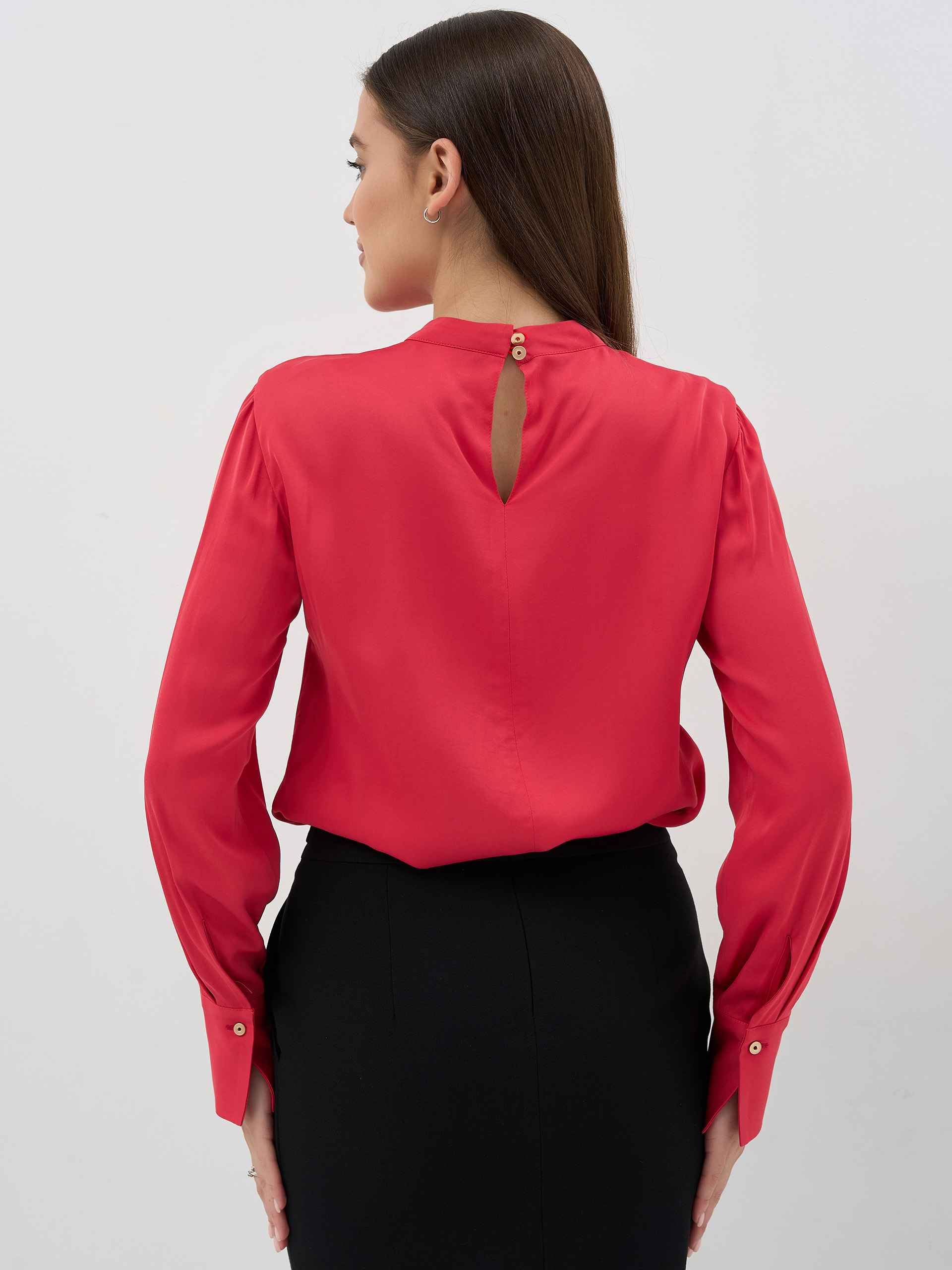 Блузка с воротом-стойкой, застежка на пуговицу сзади, в рельефе разрез, из струящейся плотной вискозной ткани с эффектом "флеш", цвет "брусника".