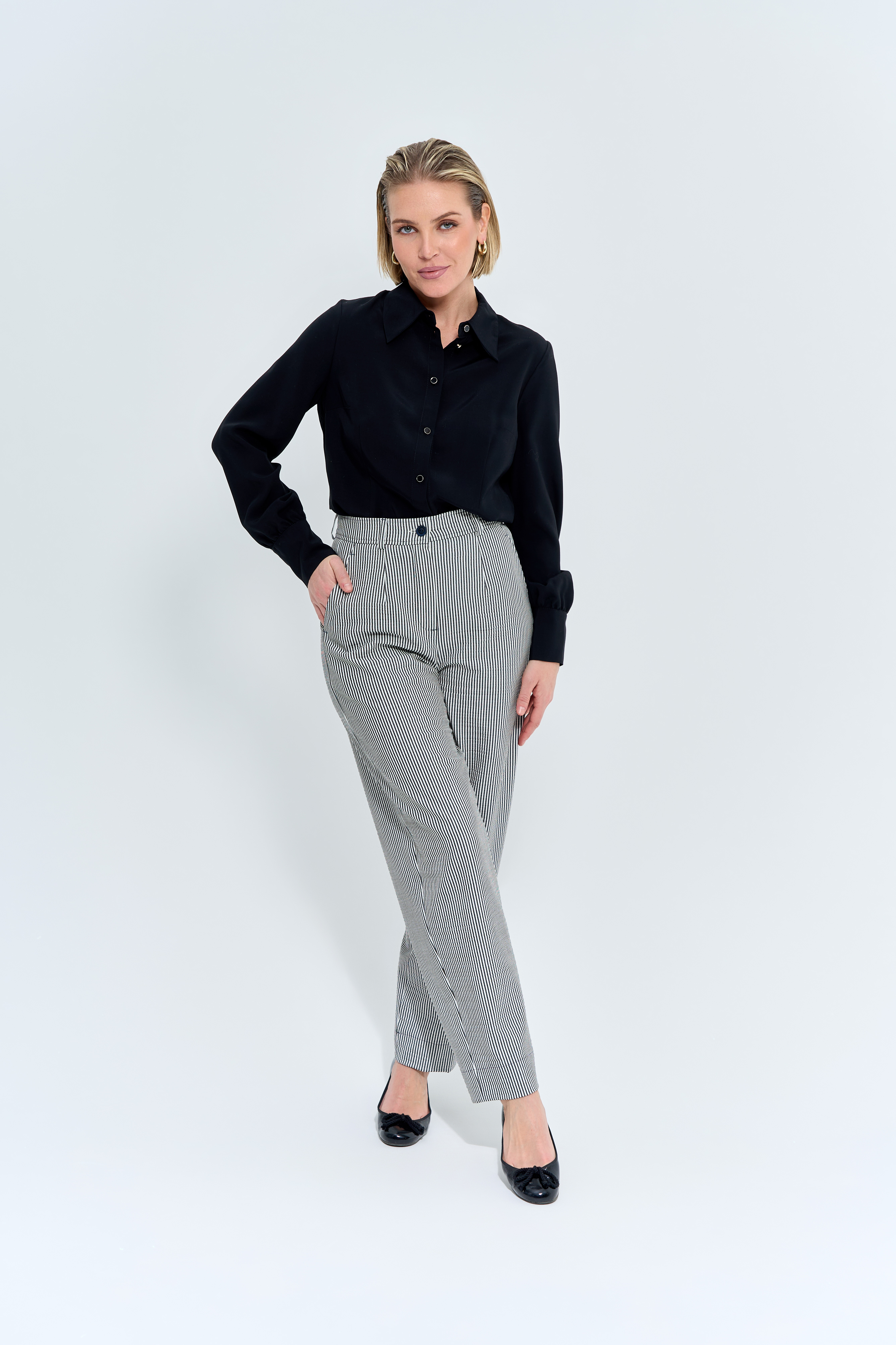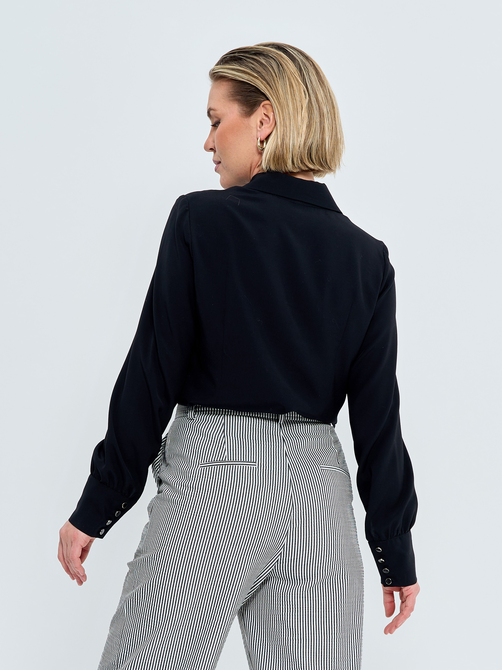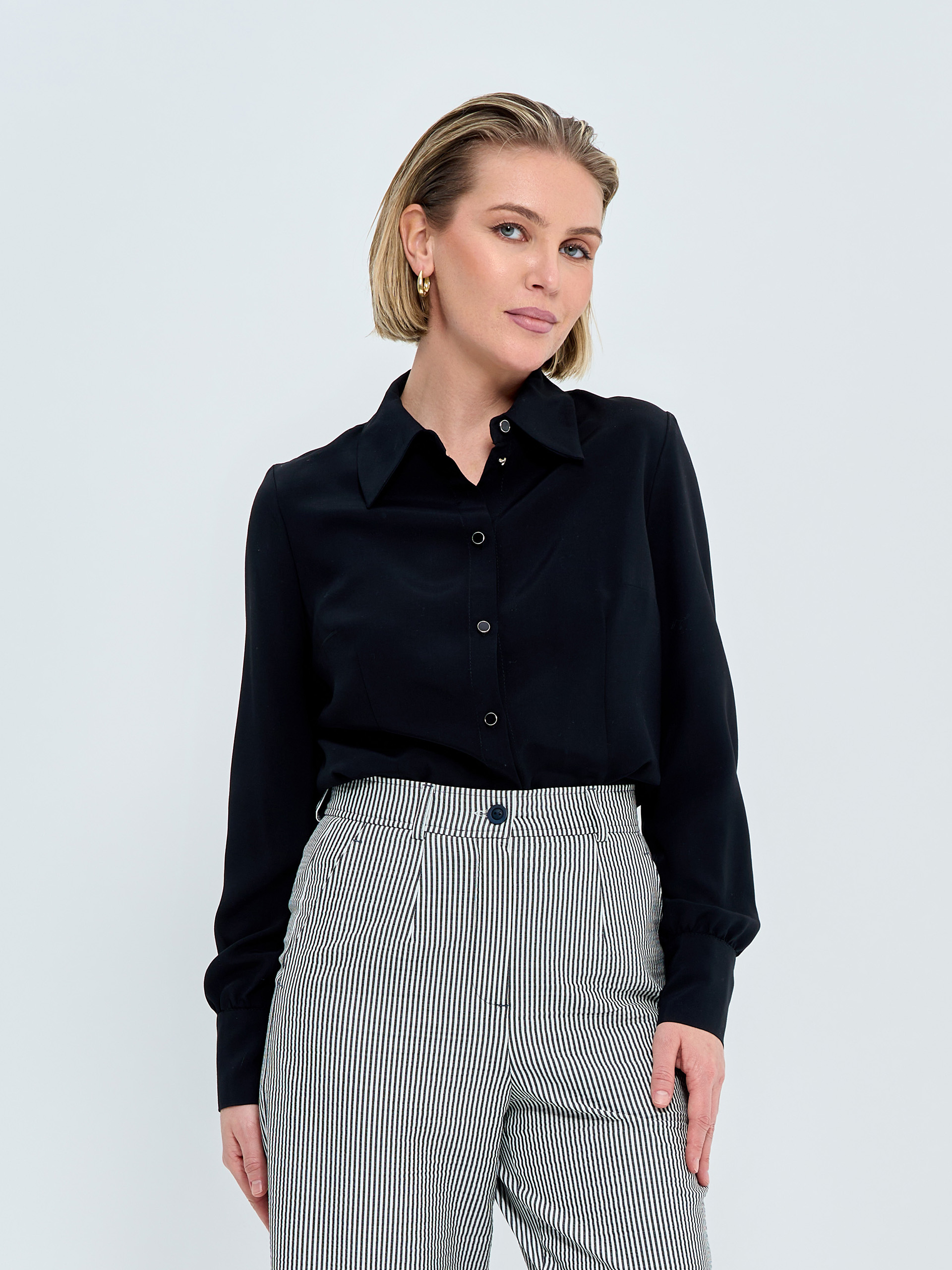 Блуза приталенная, с отложным воротником из струящейся вискозной ткани.