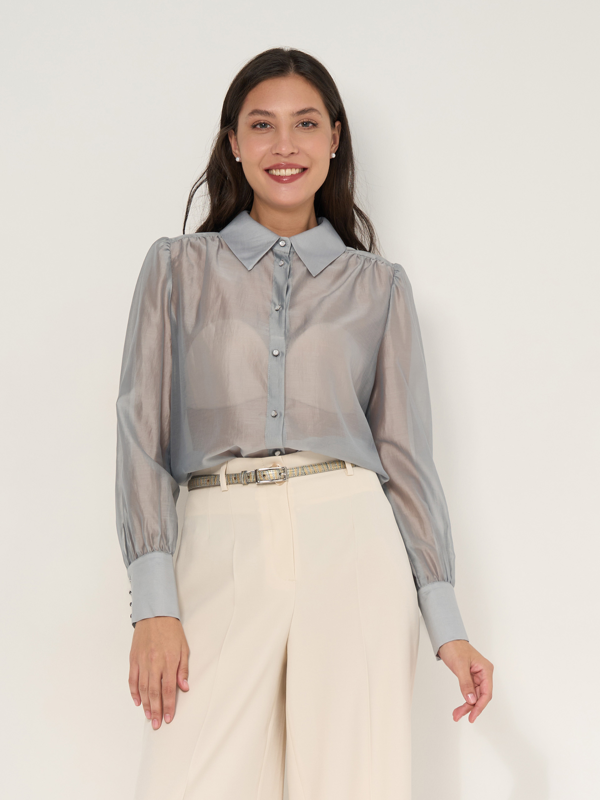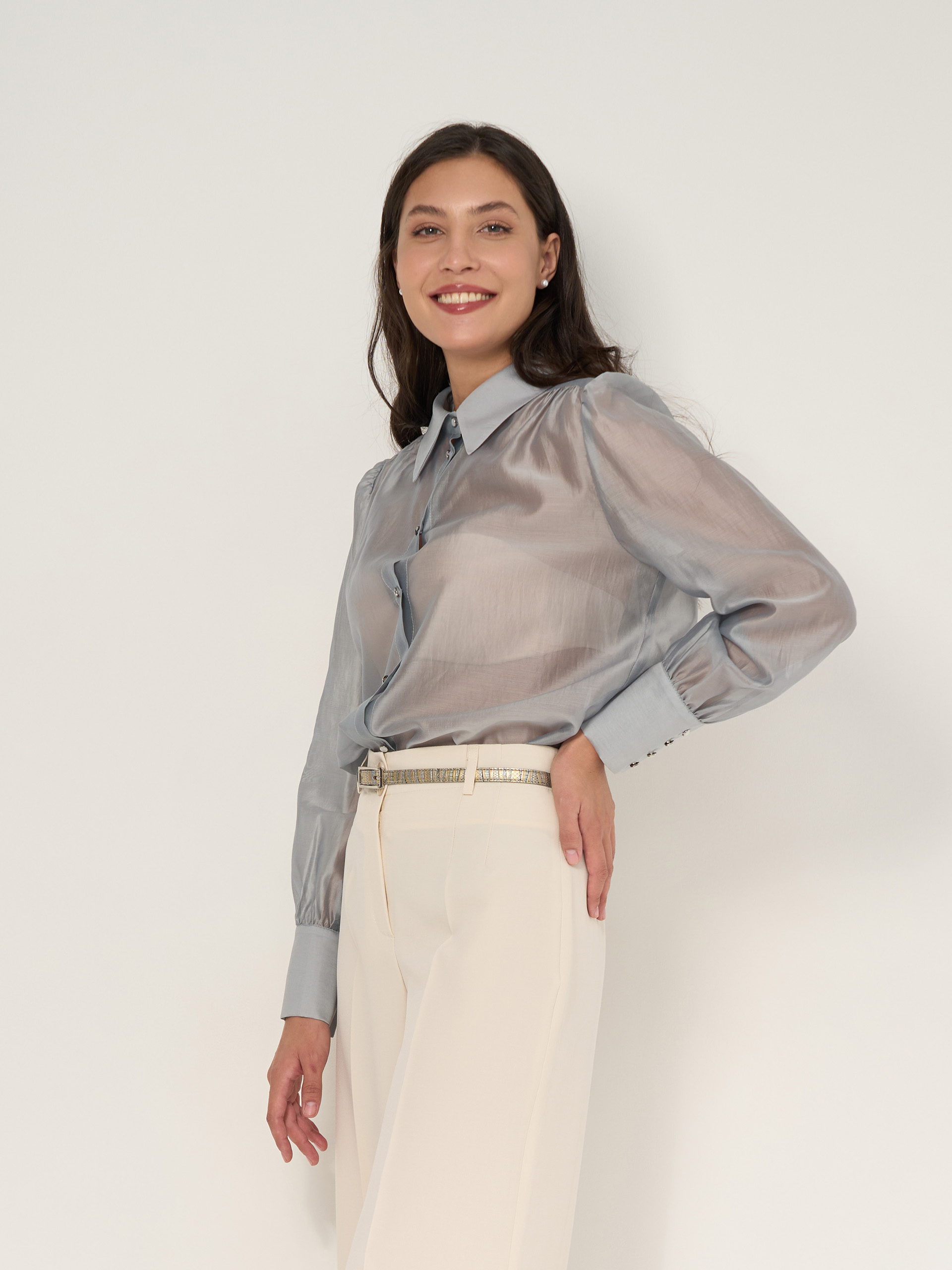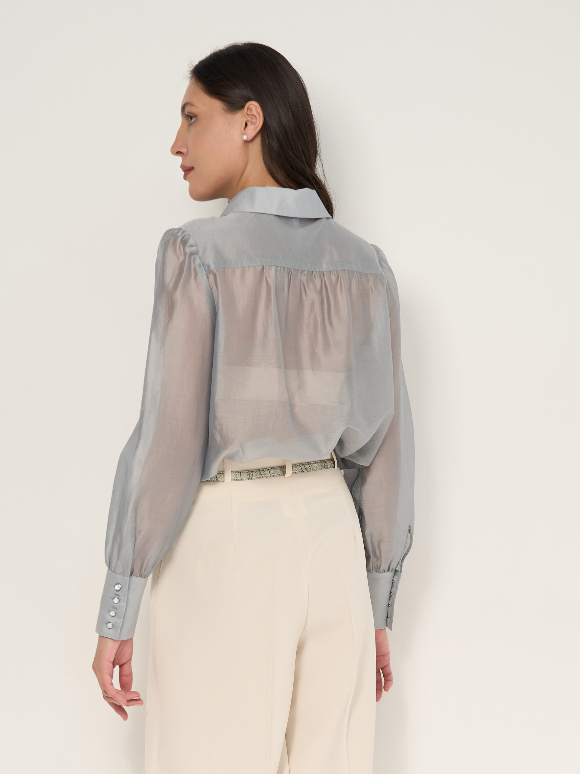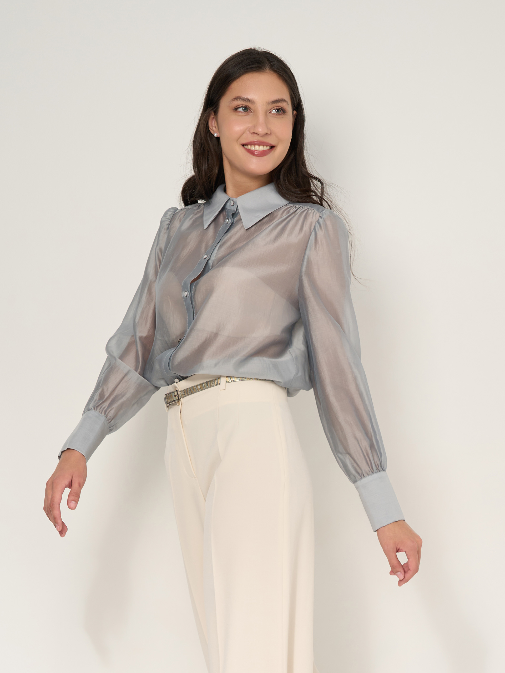 Блузка из нежного дымчато-прозрачного шифонового тенсела, сборка по окату рукава, рубашечная застежка.