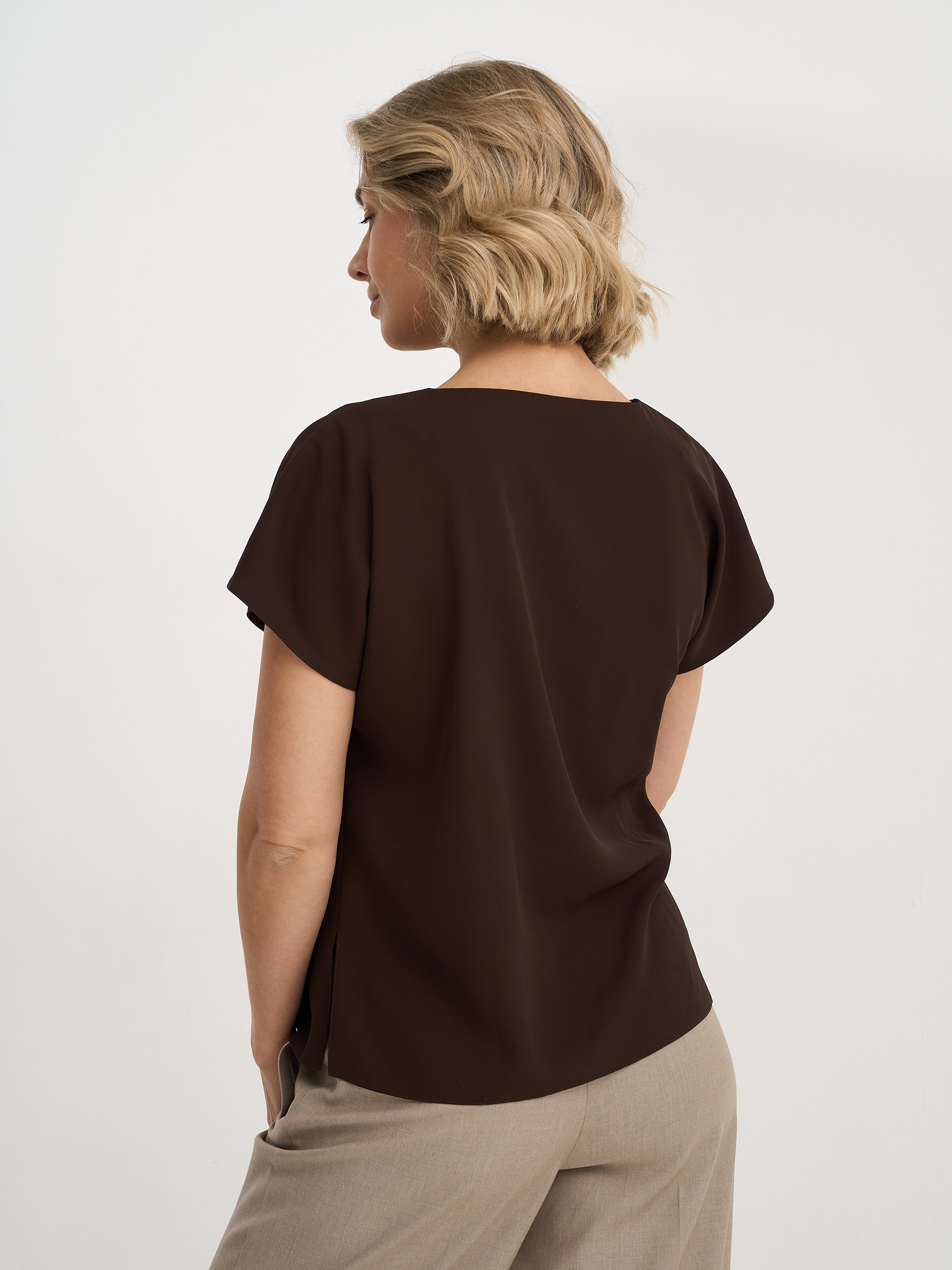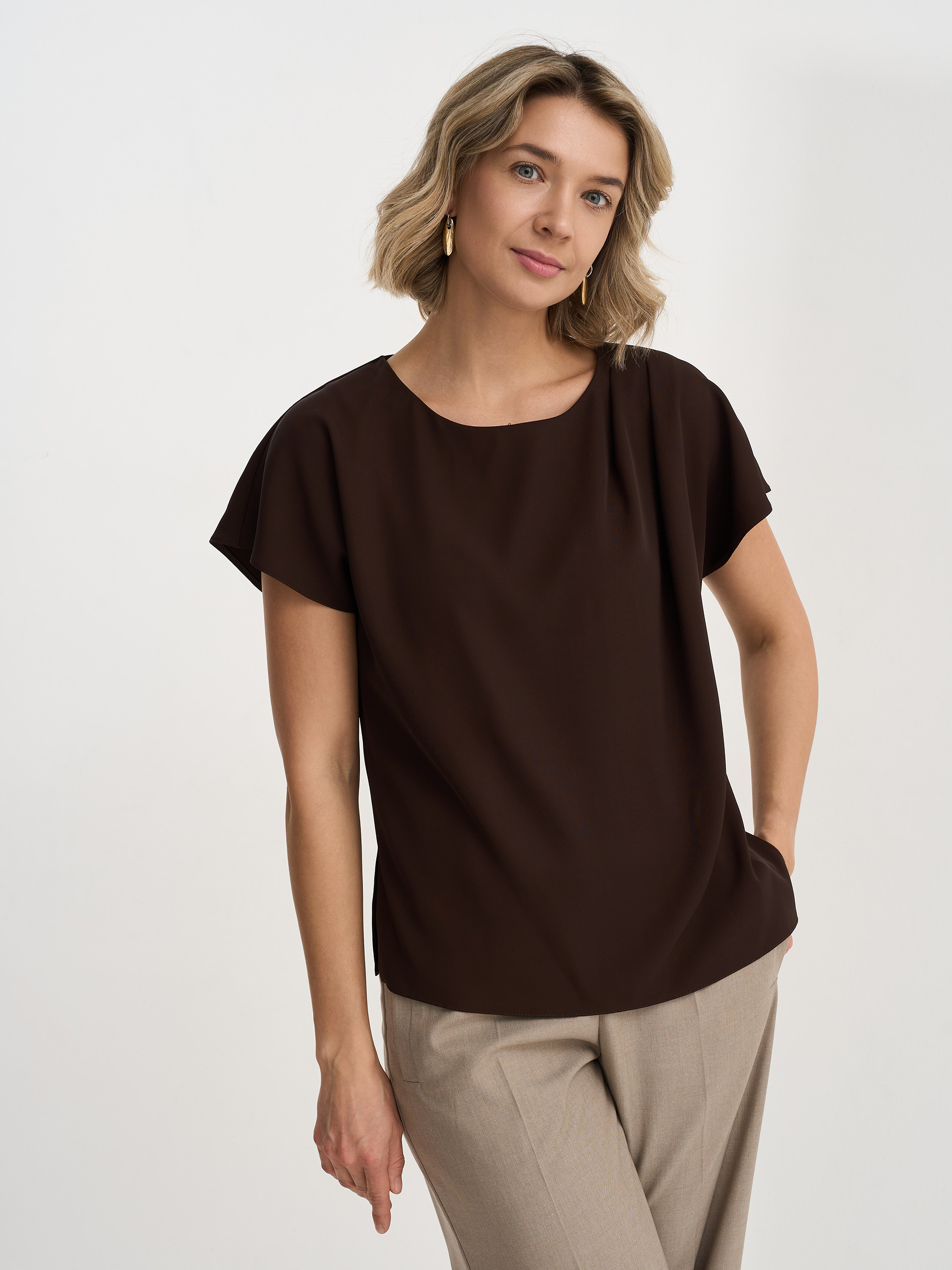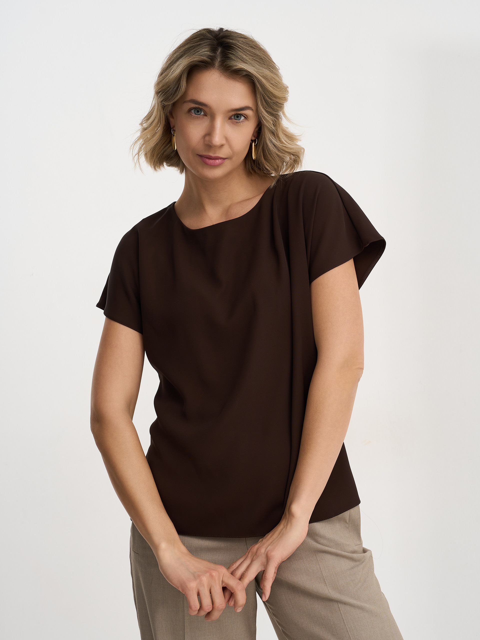 Топ с декоративными ассиметричными складками, прямой, свободного силуэта, из утяжеленной струящейся гладкокрашенной ткани, цвет шоколад.