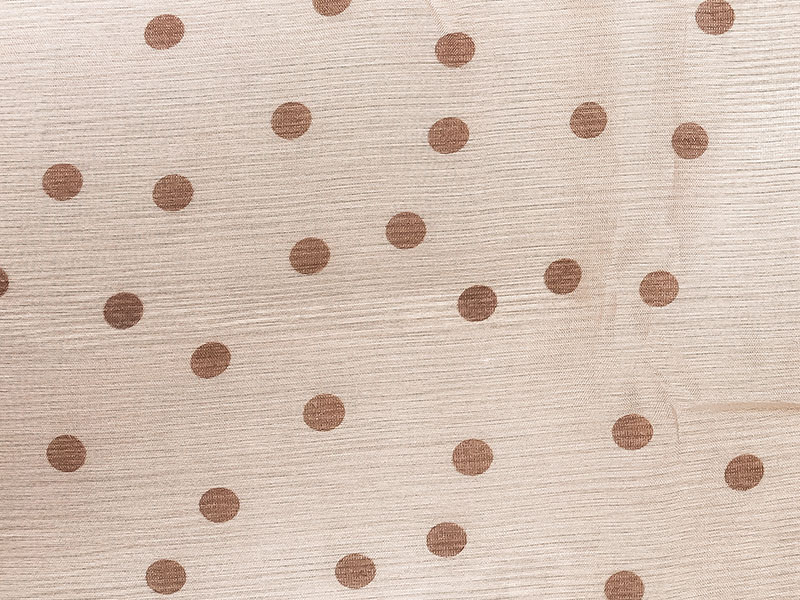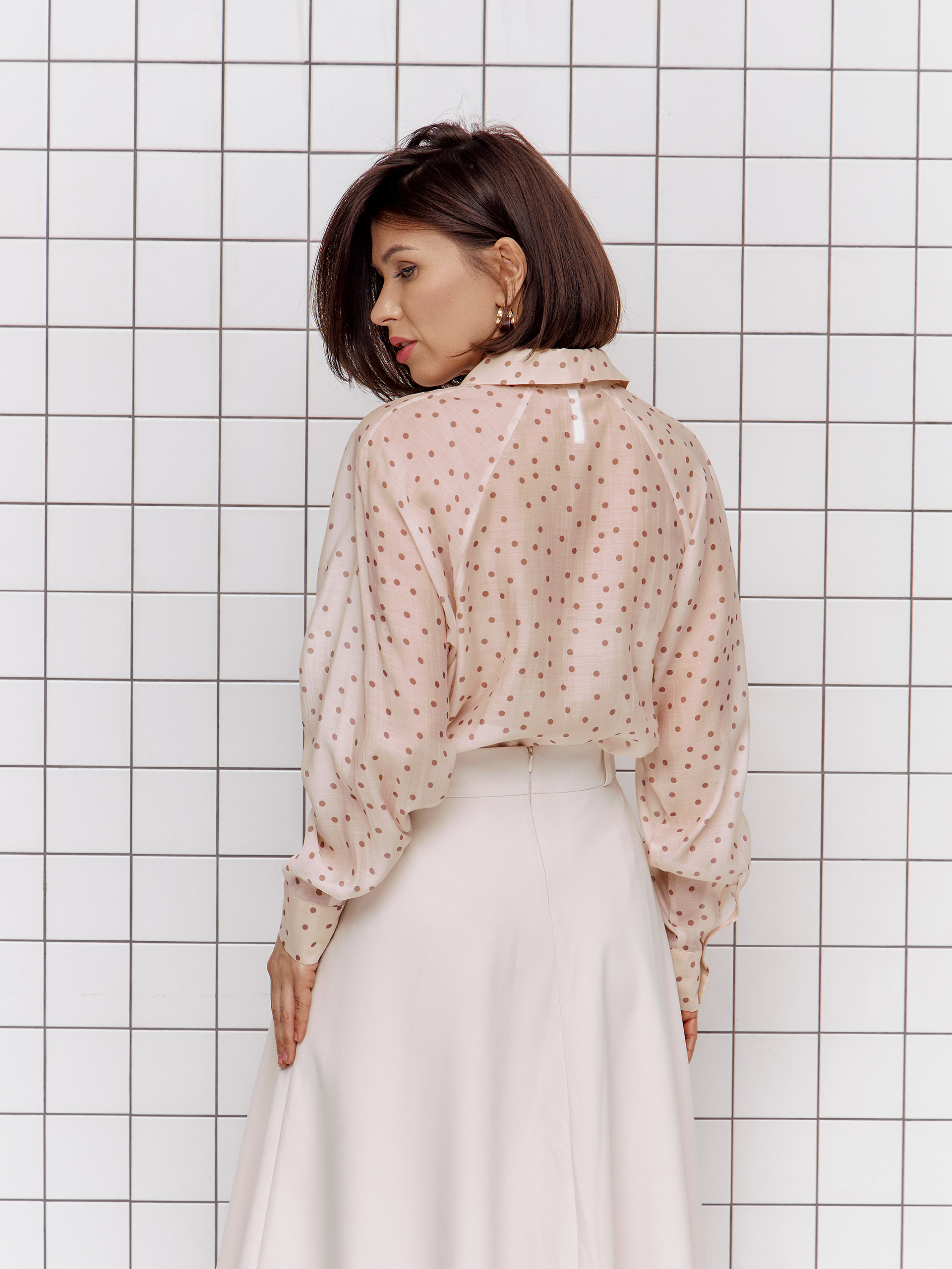 Блузка прямого силуэта, из вискозной ткани молочного цвета в шоколадный горошек, рукава реглан полной длины с манжетой.
