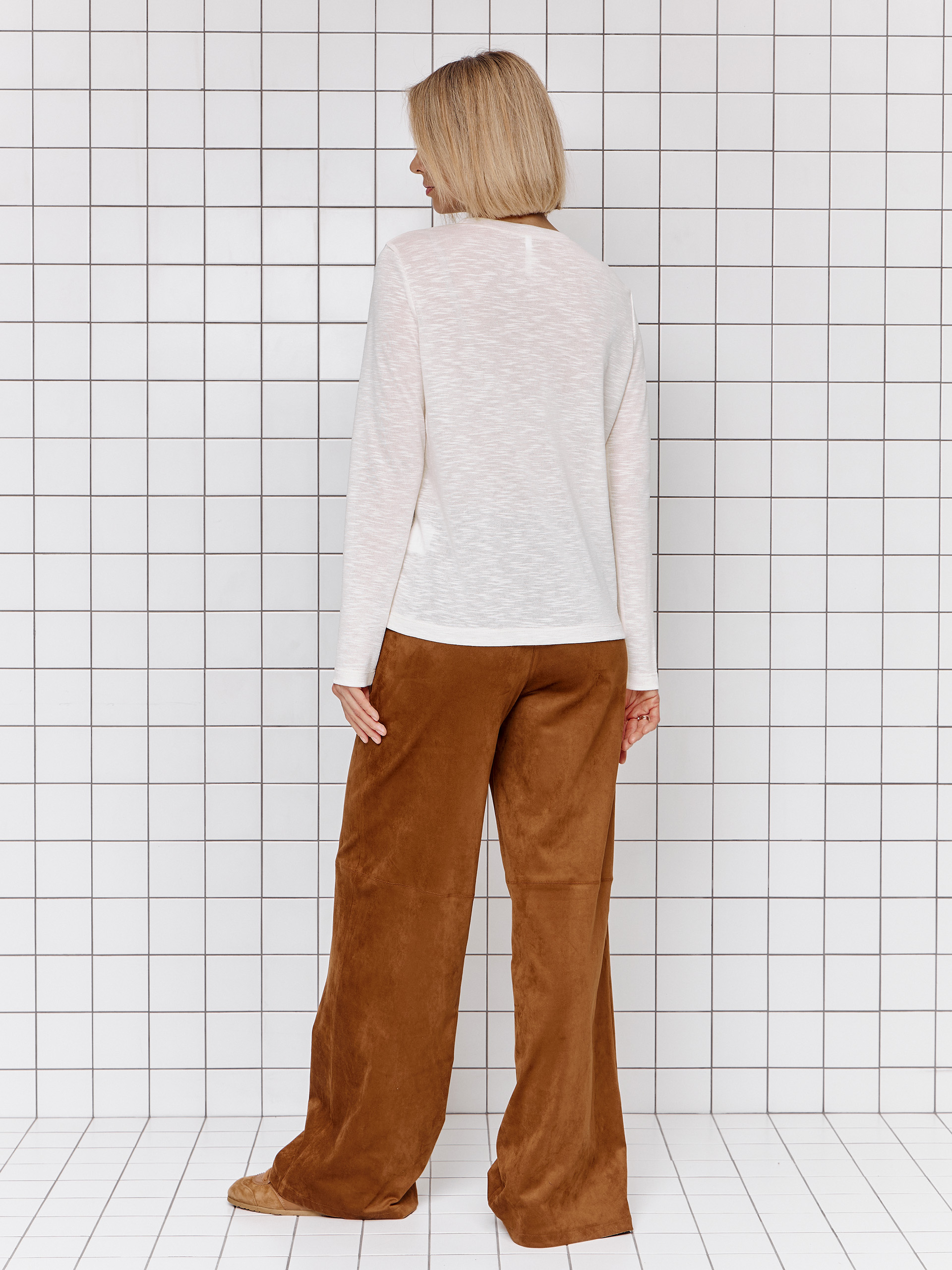 Брюки прямого силуэта, с подрезом по линии колена, свободные, аккуратный защип у пояса, кнопка, из пластичной ткани с эффектом замши.