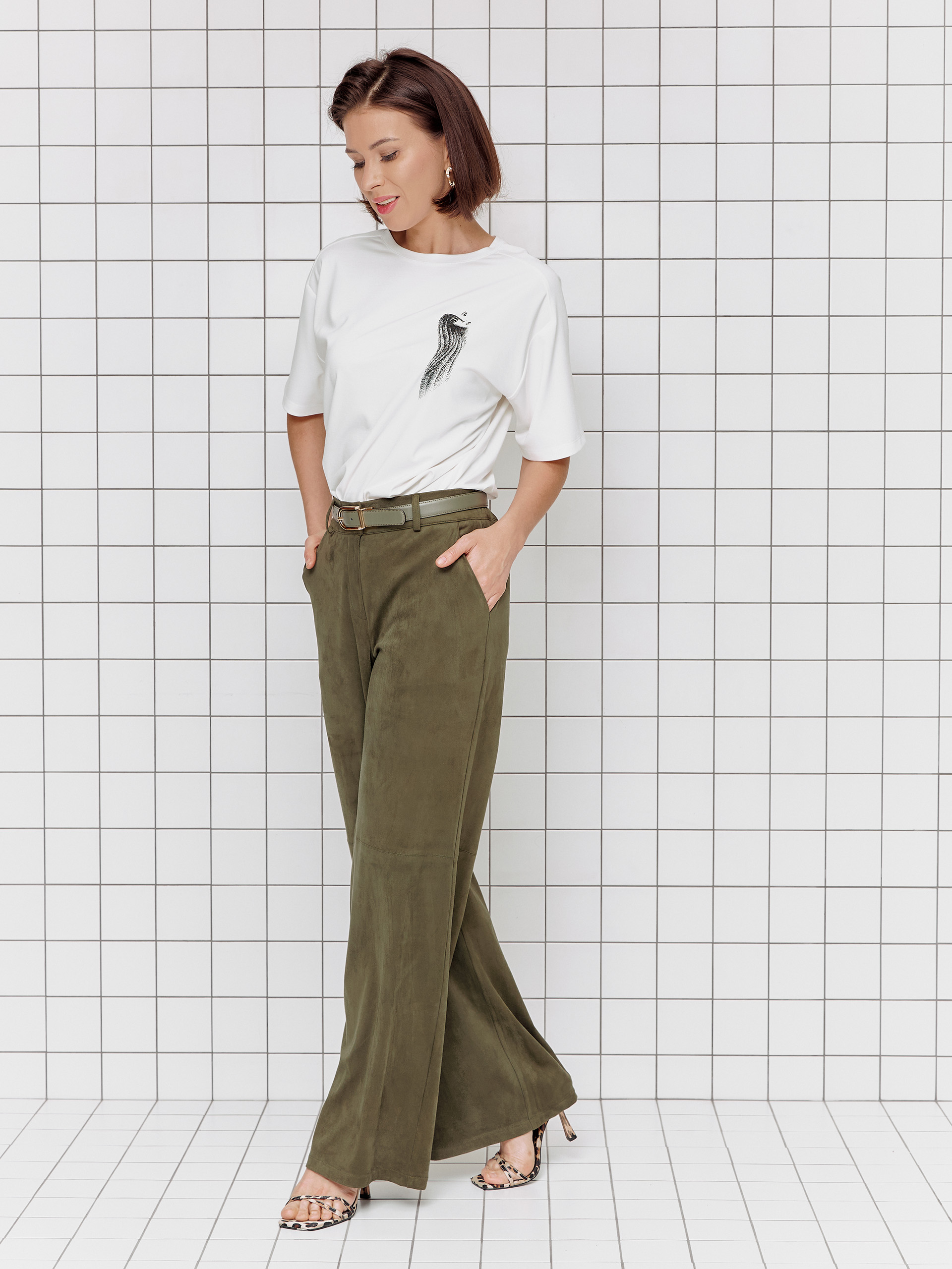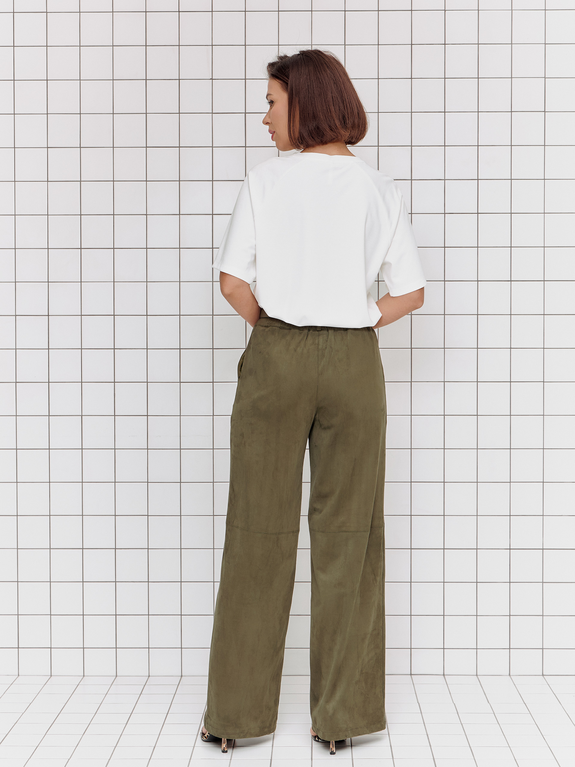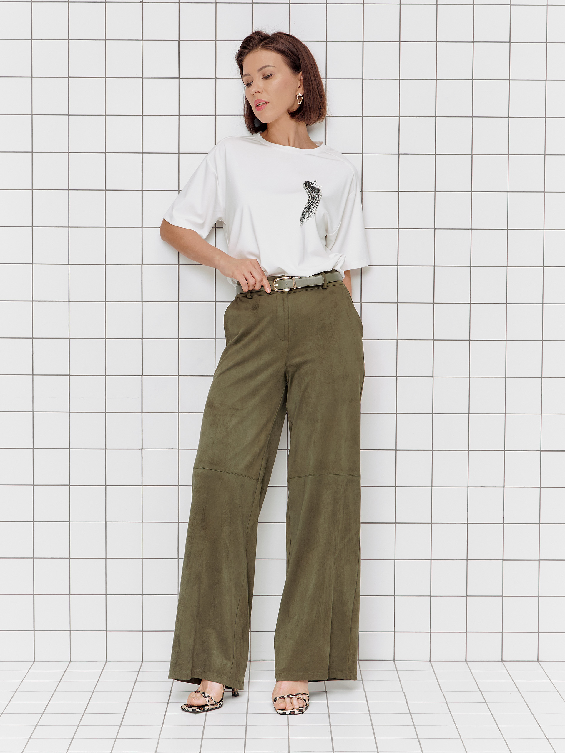 Брюки прямого силуэта, с подрезом по линии колена, свободные, аккуратный защип у пояса, кнопка, из пластичной ткани с эффектом замши.
