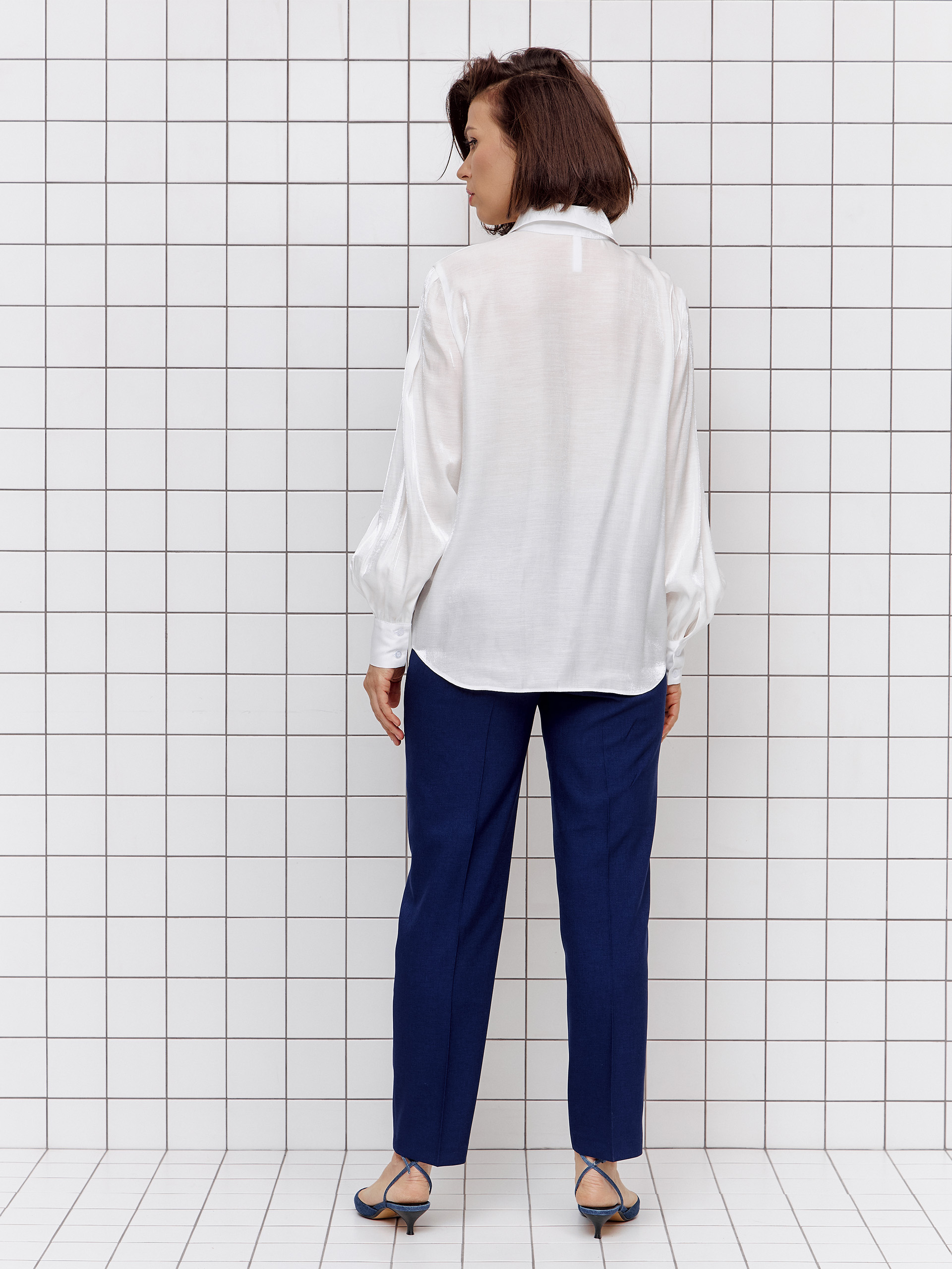 Брюки узкого объема, слегка зауженые книзу, укороченные, костюмная легкая ткань, смесовая с хлопком.