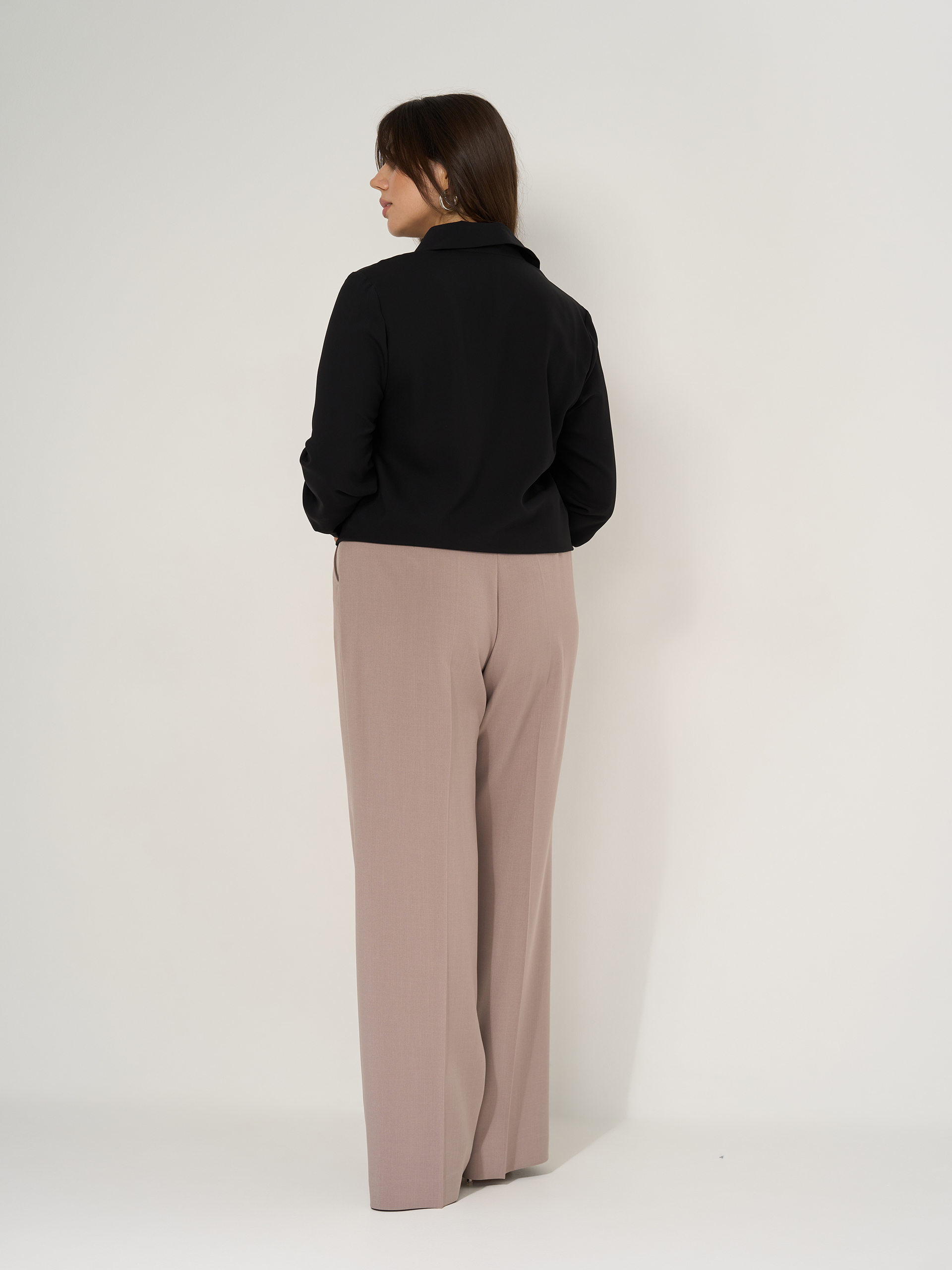 Брюки свободного кроя на резинке. Из смесовой костюмной ткани.