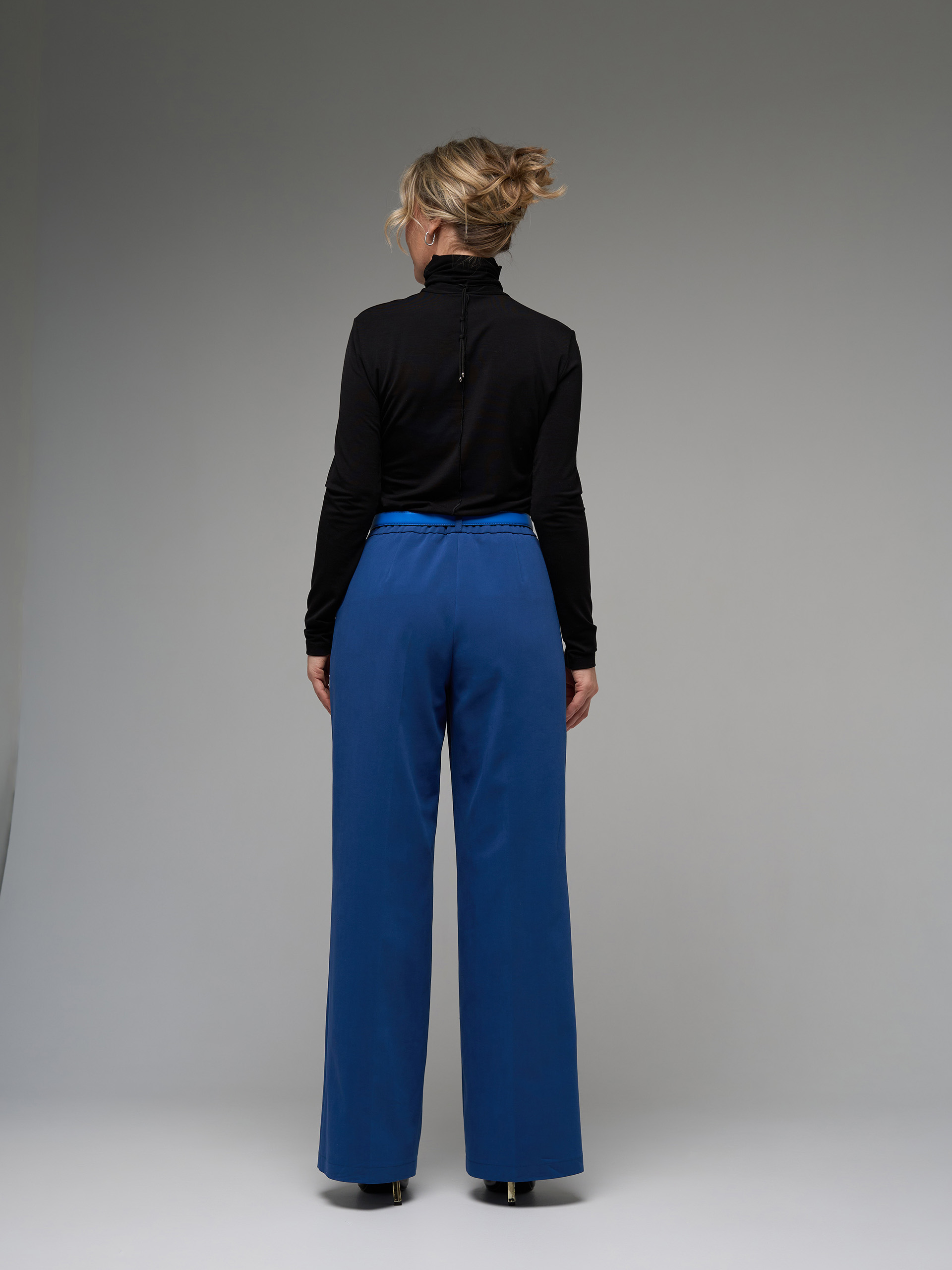 Брюки-палаццо, расклешенные от бедра. В поясе резинка. Из гладкой хорошо держащей форму костюмной ткани с хлопком.