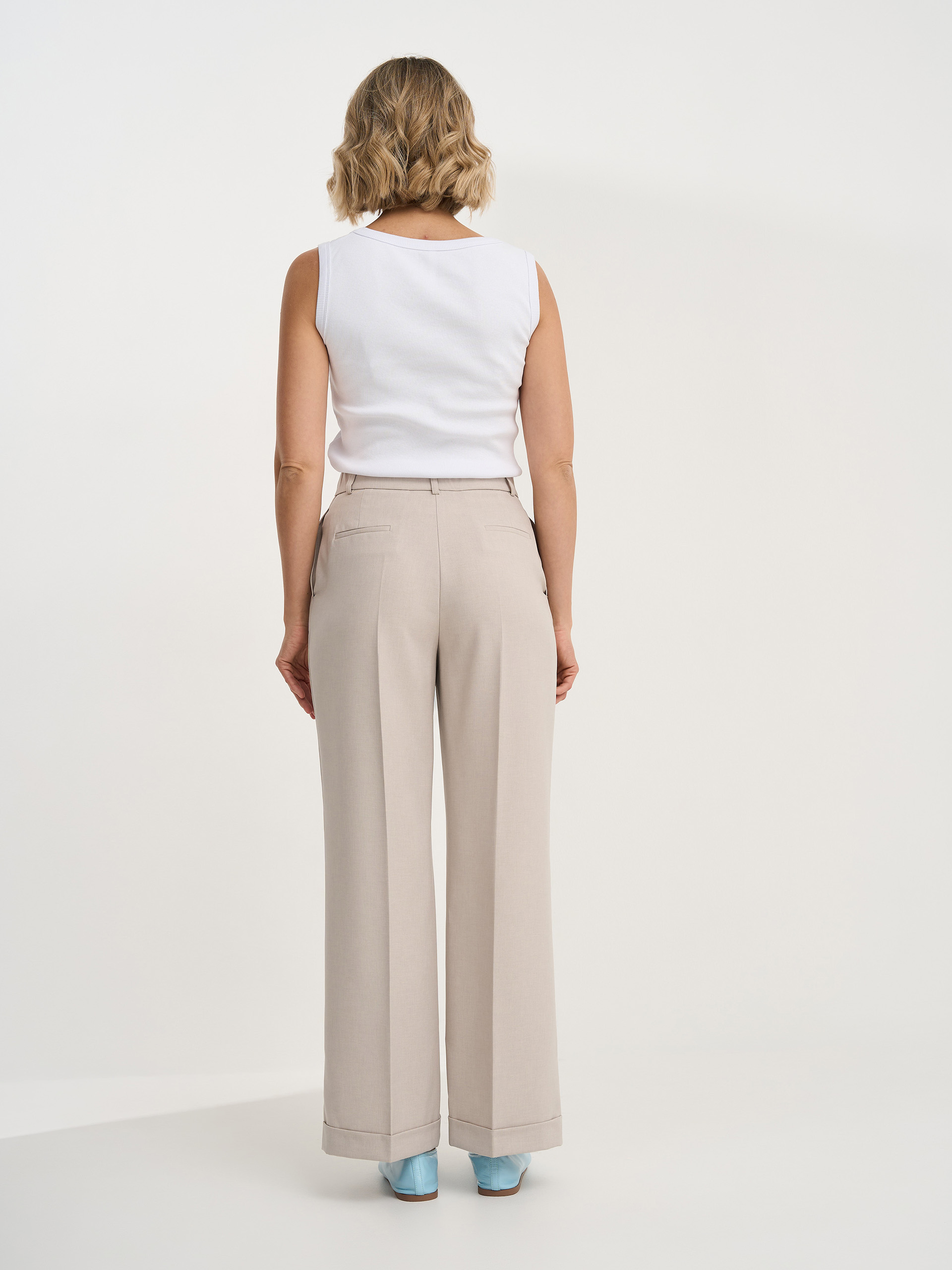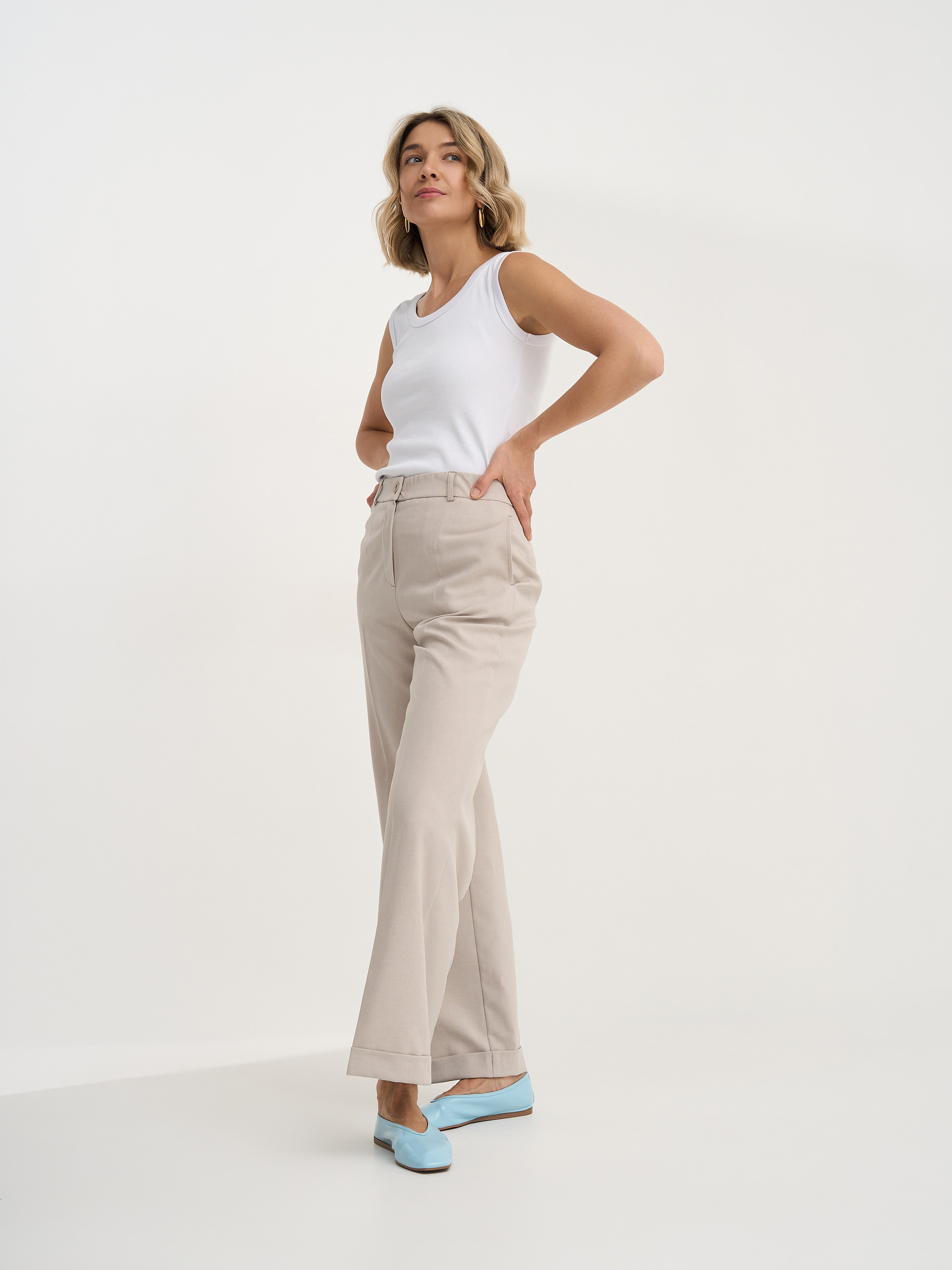 Брюки А-образного силуэта, манжет, слегка укороченные. Из легкой смесовой с хлопком ткани.