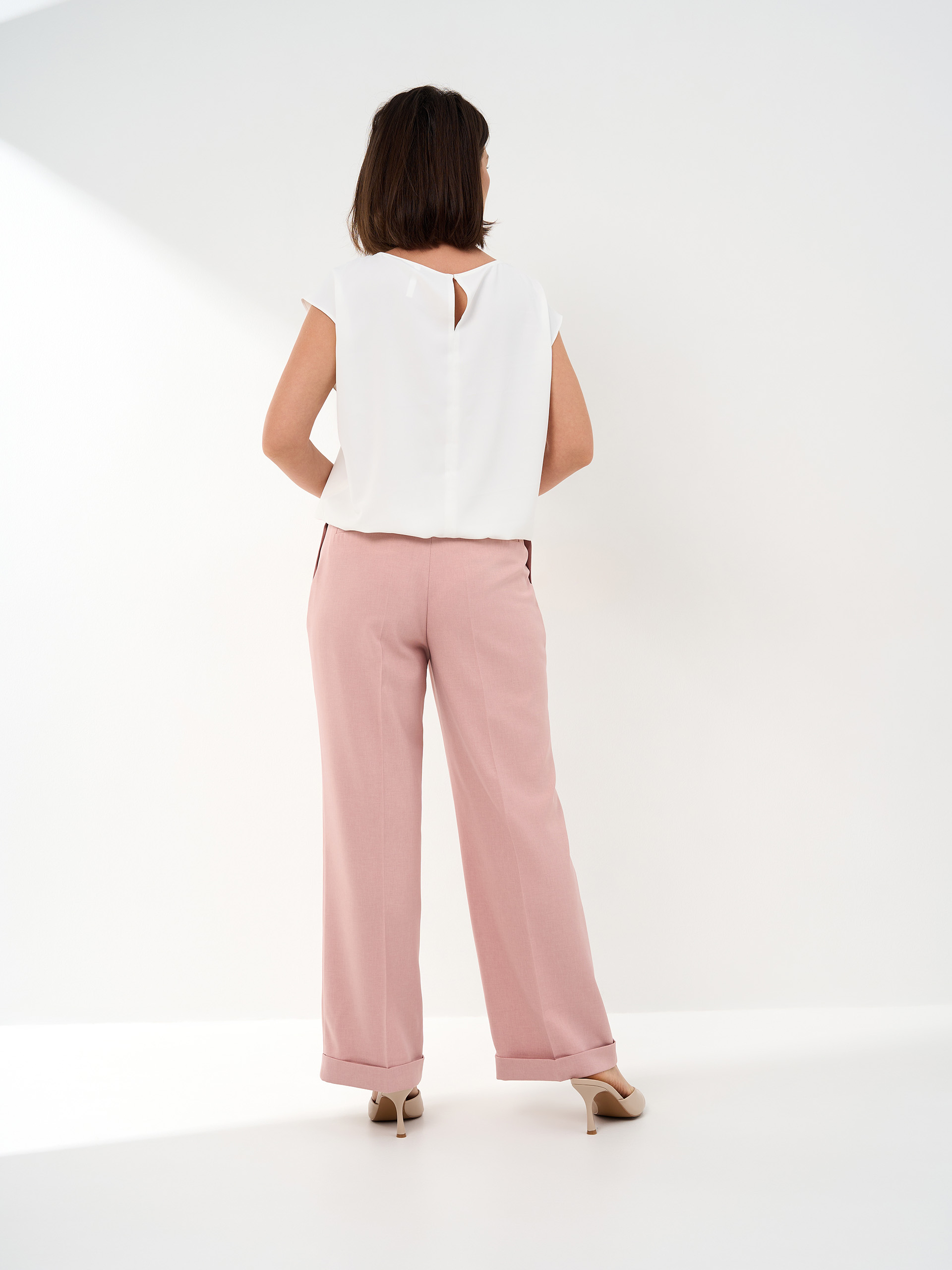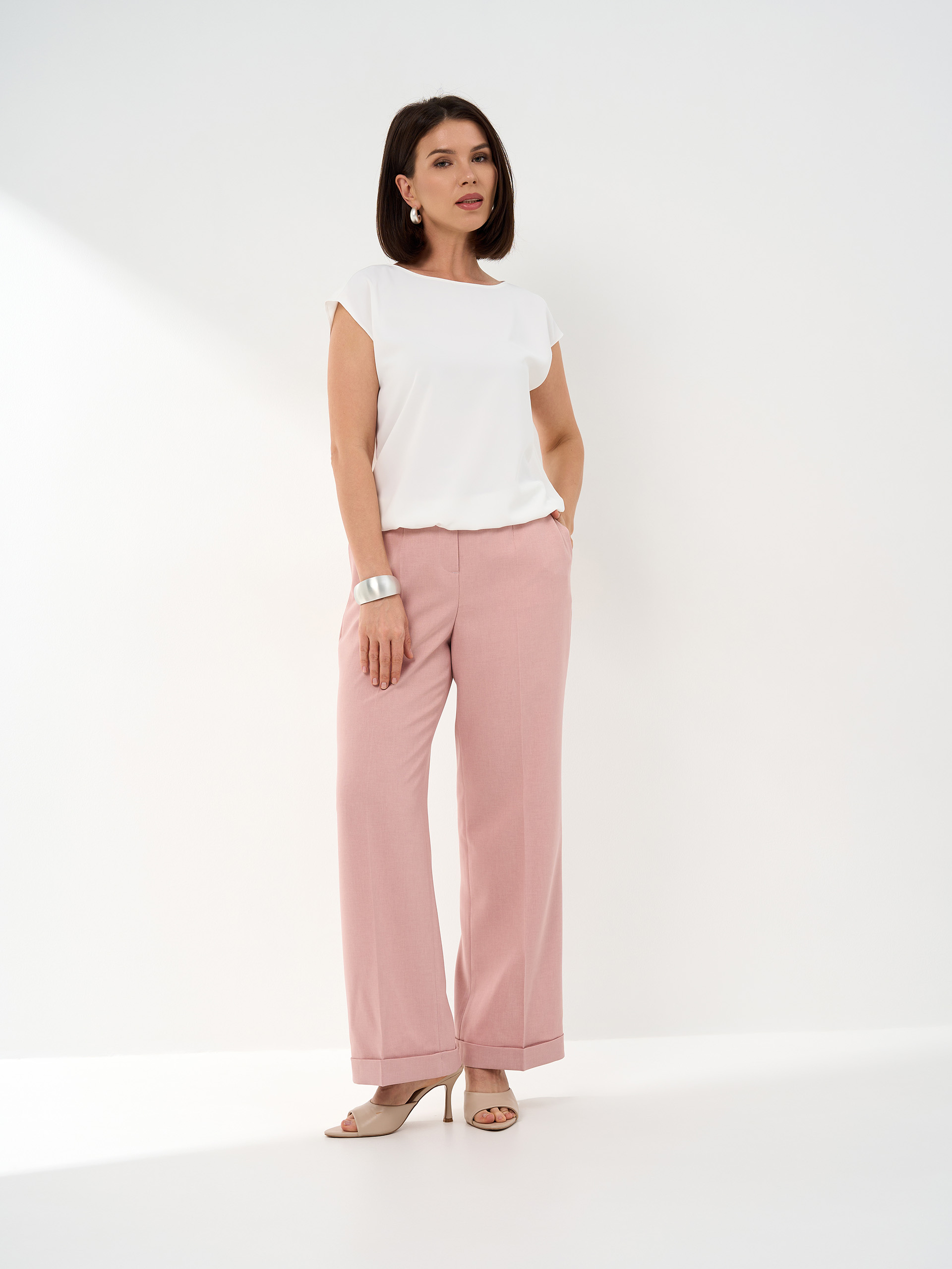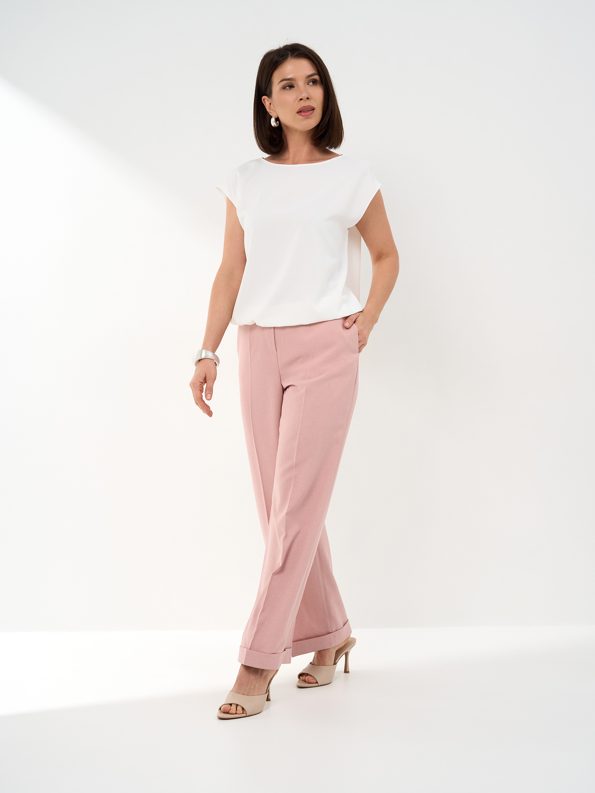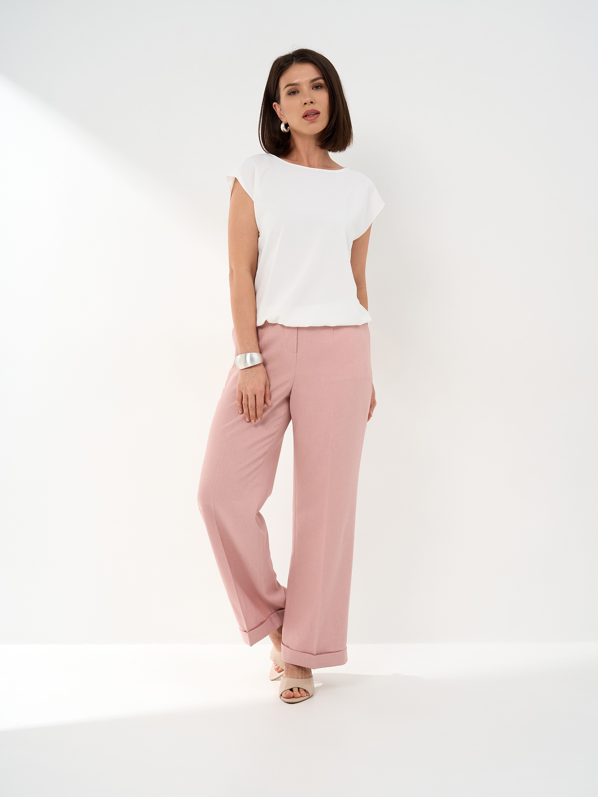 Брюки А-образного силуэта, манжет, слегка укороченные. Из легкой смесовой с хлопком ткани.