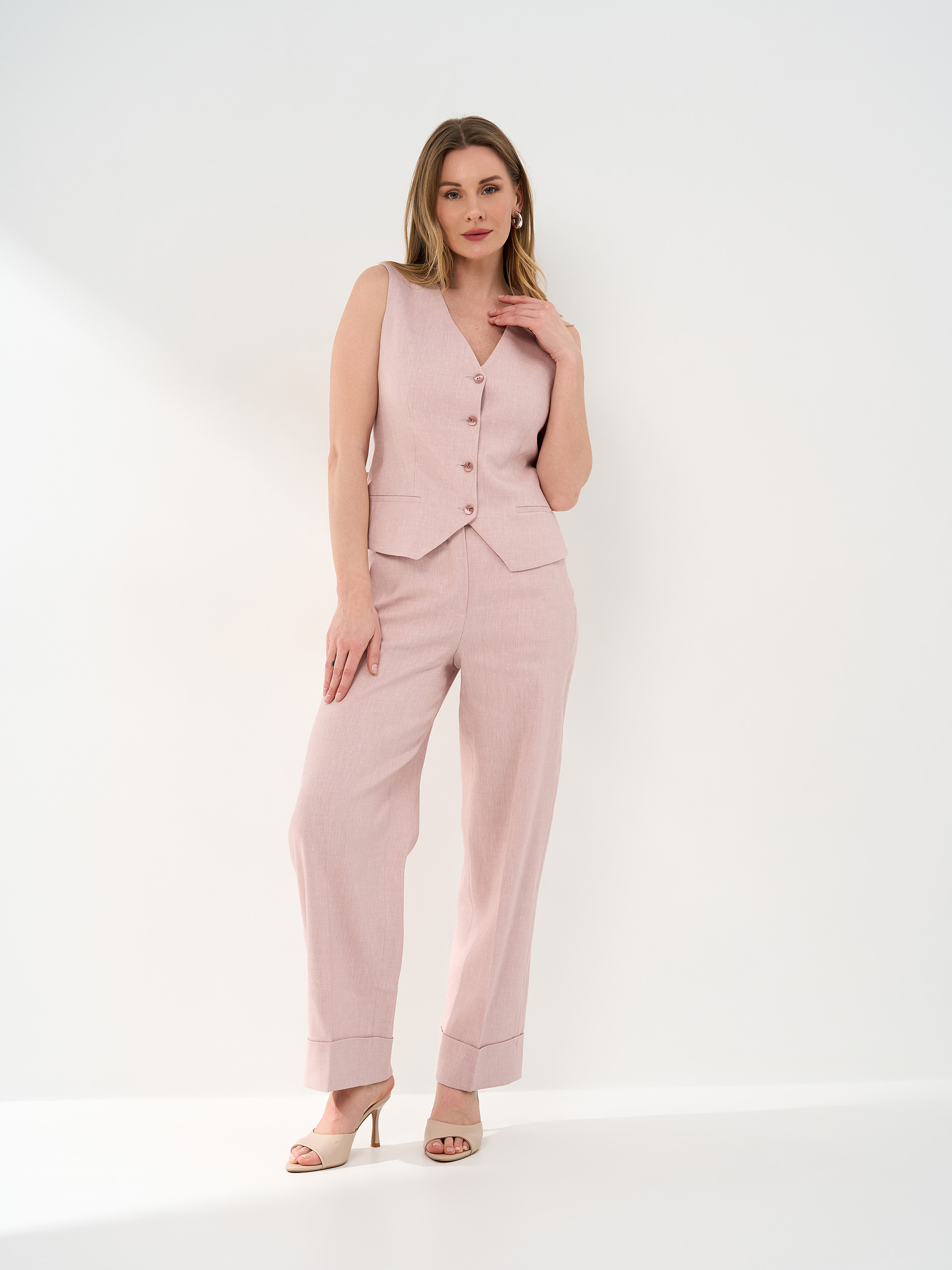 Брюки укороченные прямые, из льняной ткани пудрового цвета.