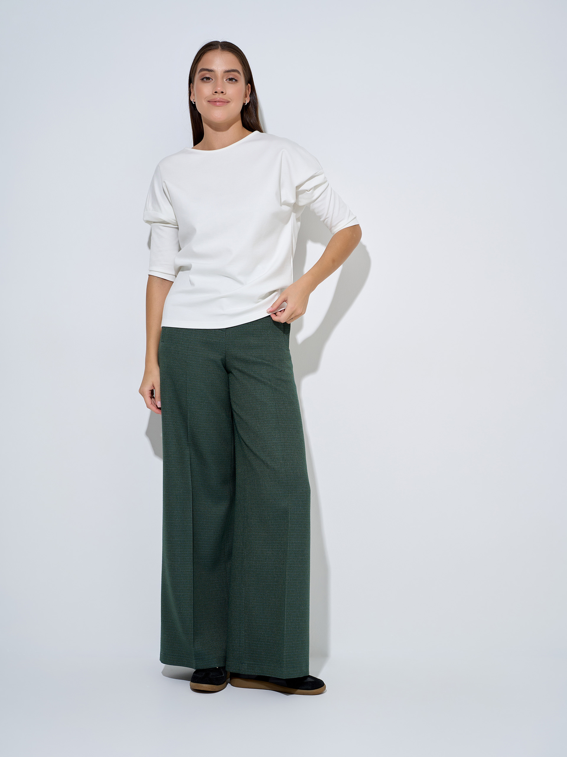 Брюки широкие полной длины, расклешенные, слегка завышенная линия талии. Из плотной смесовой ткани.