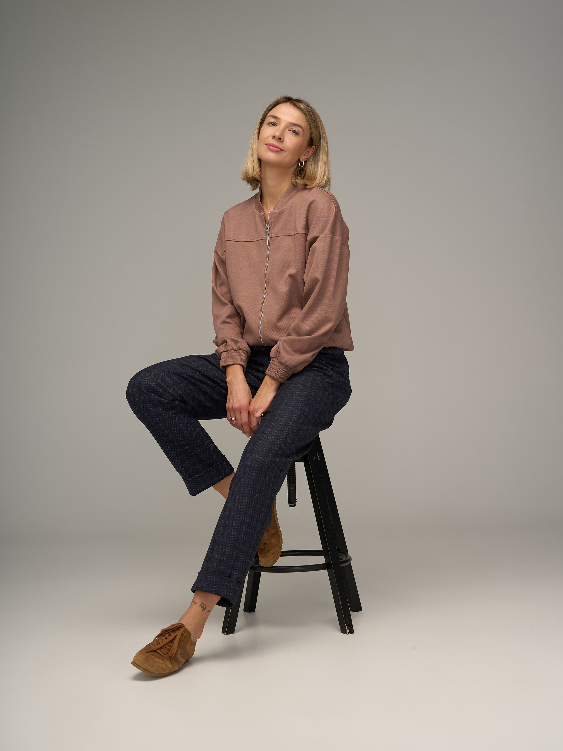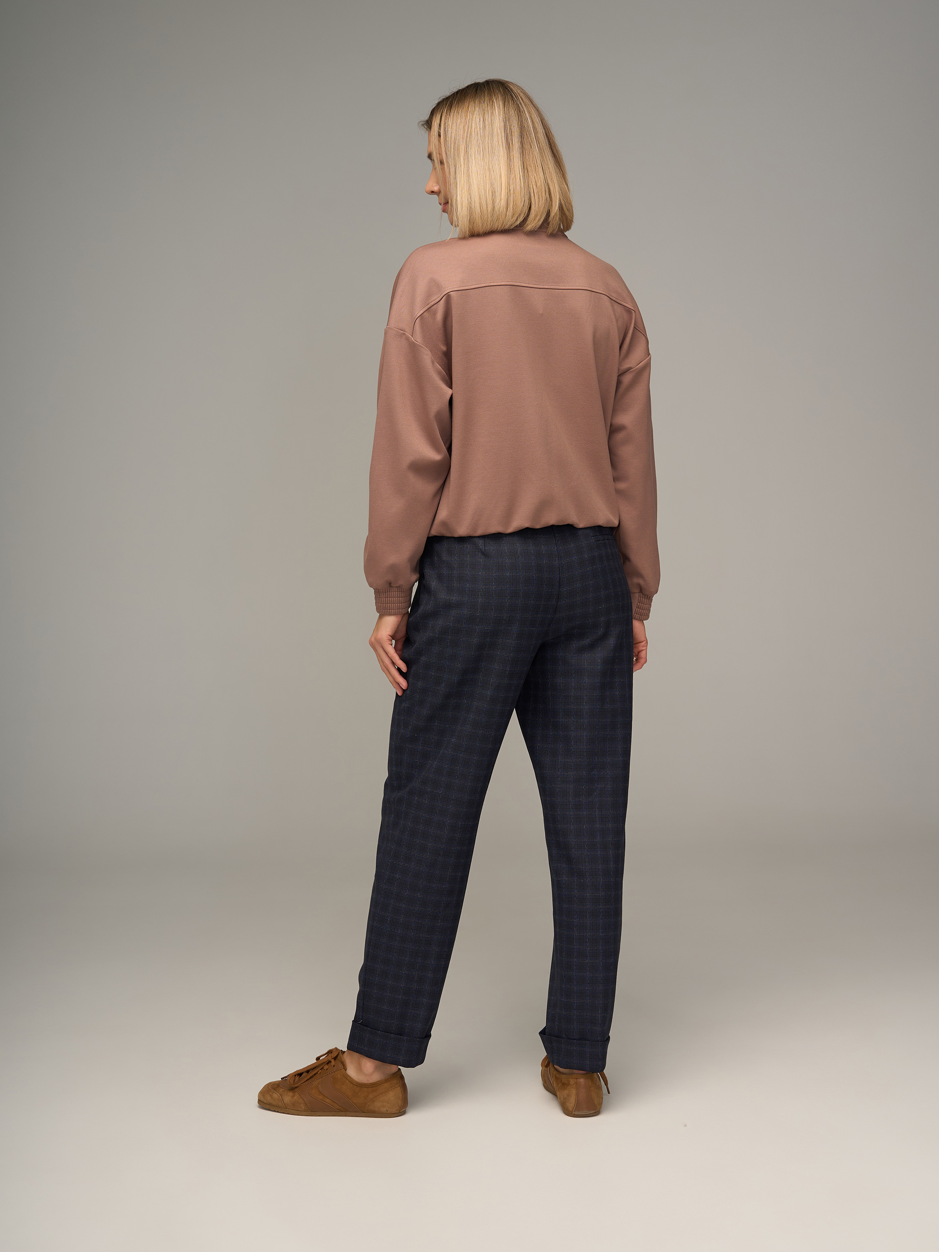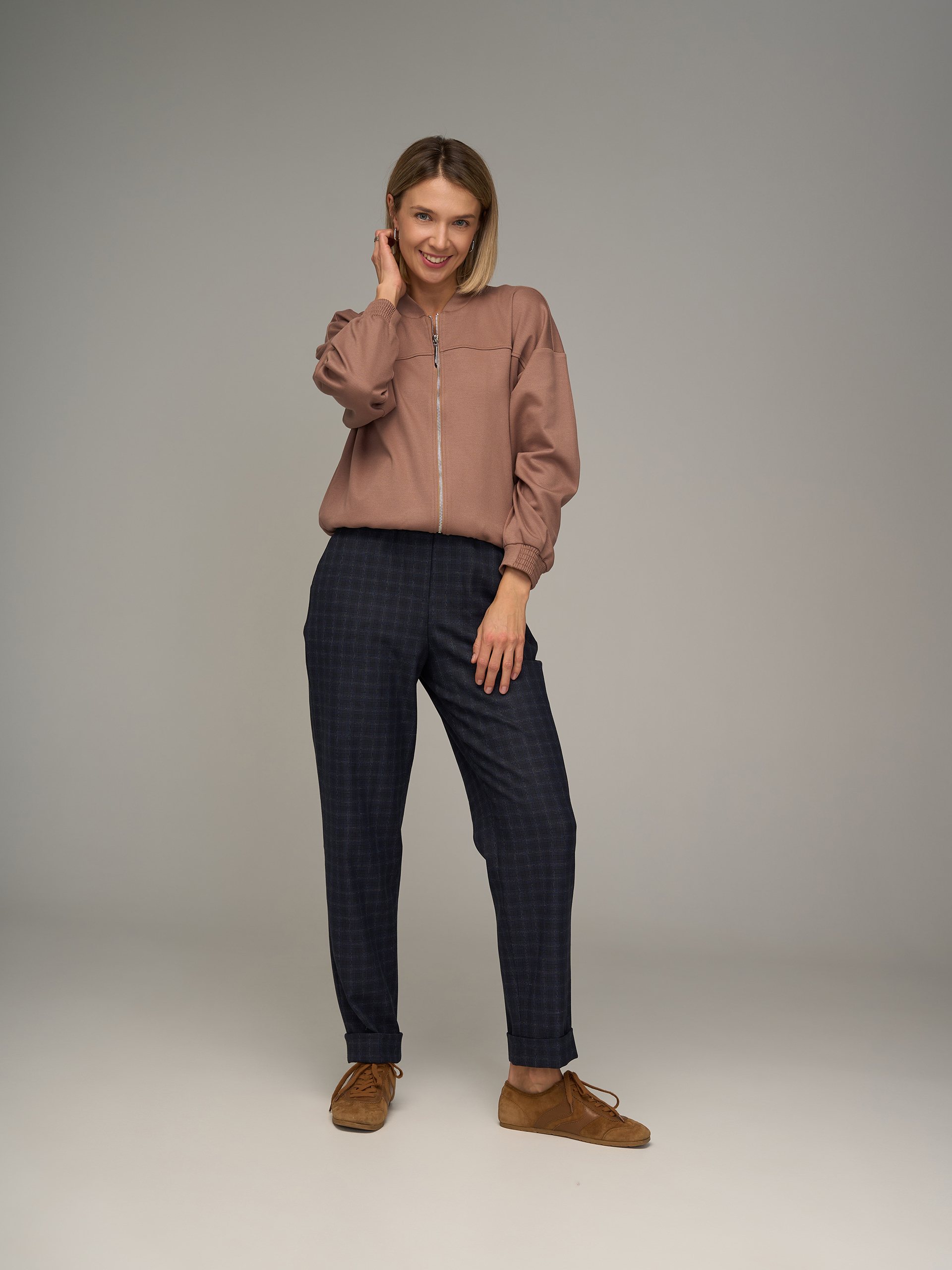 Брюки с манжетами по низу, зауженные книзу, резинка в поясе, из костюмной вискозной ткани в клетку.
