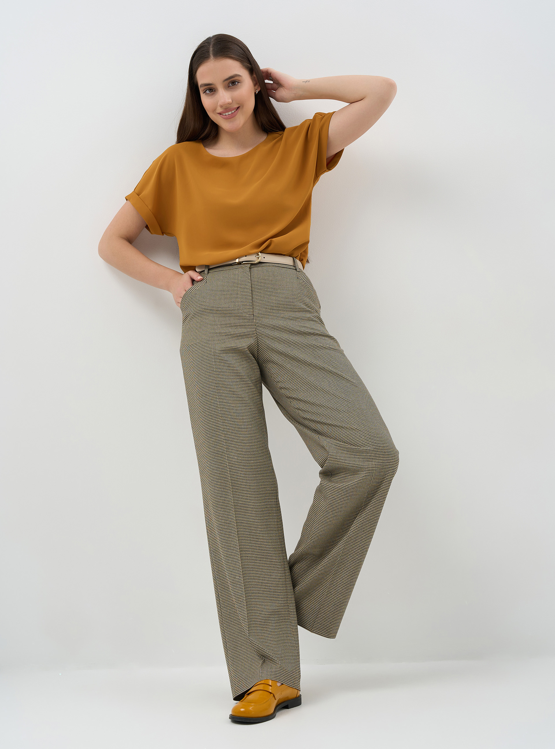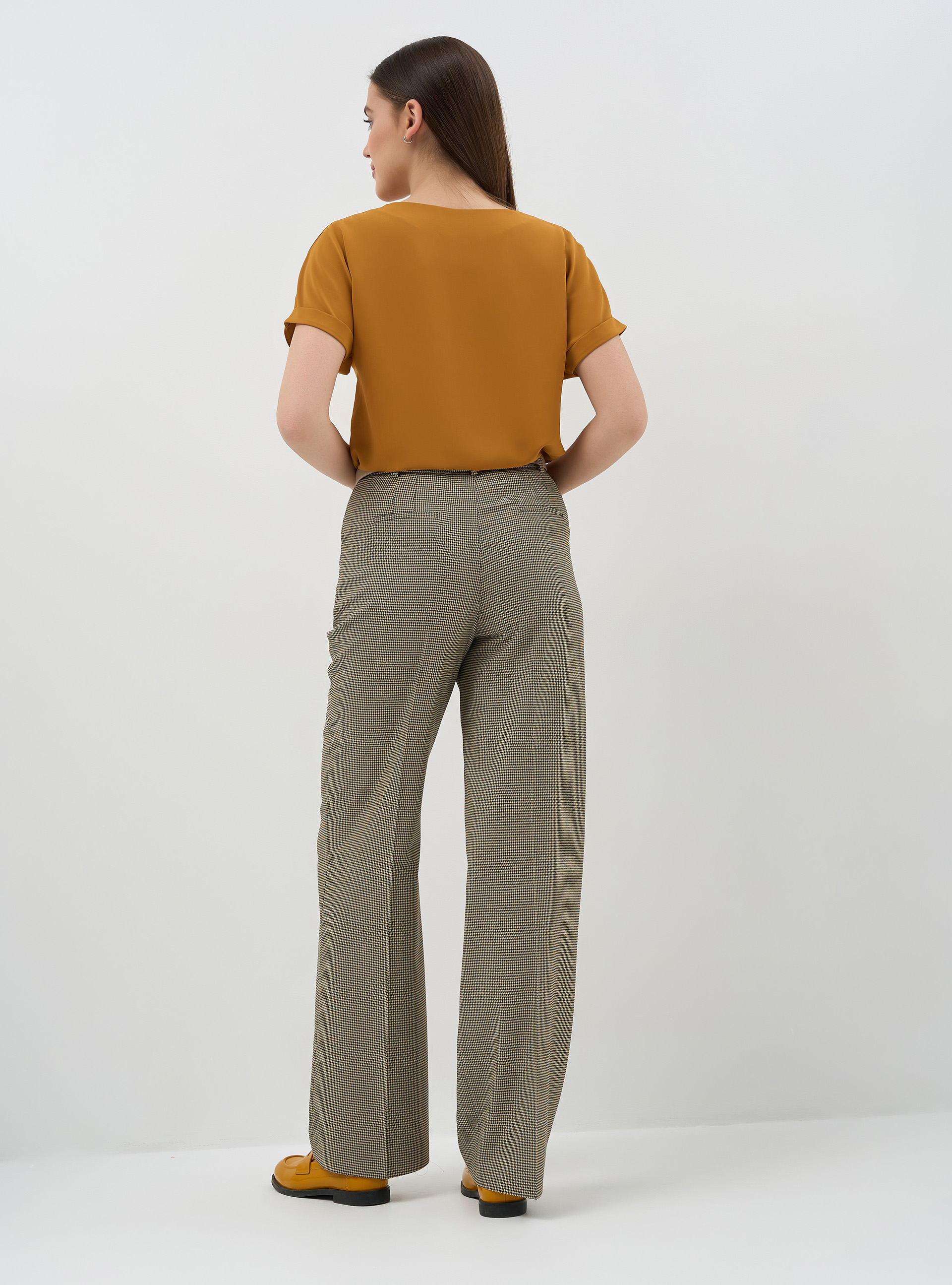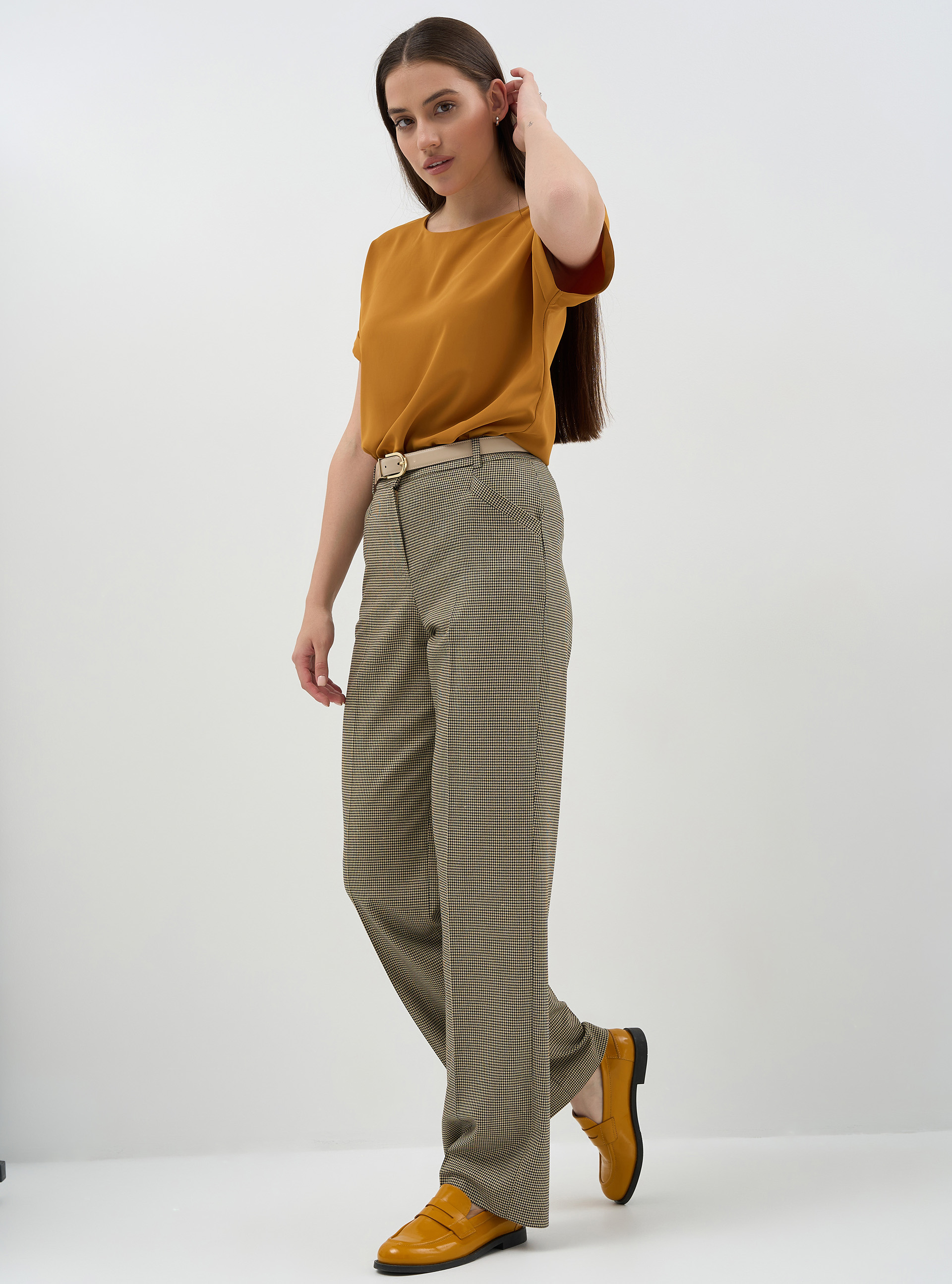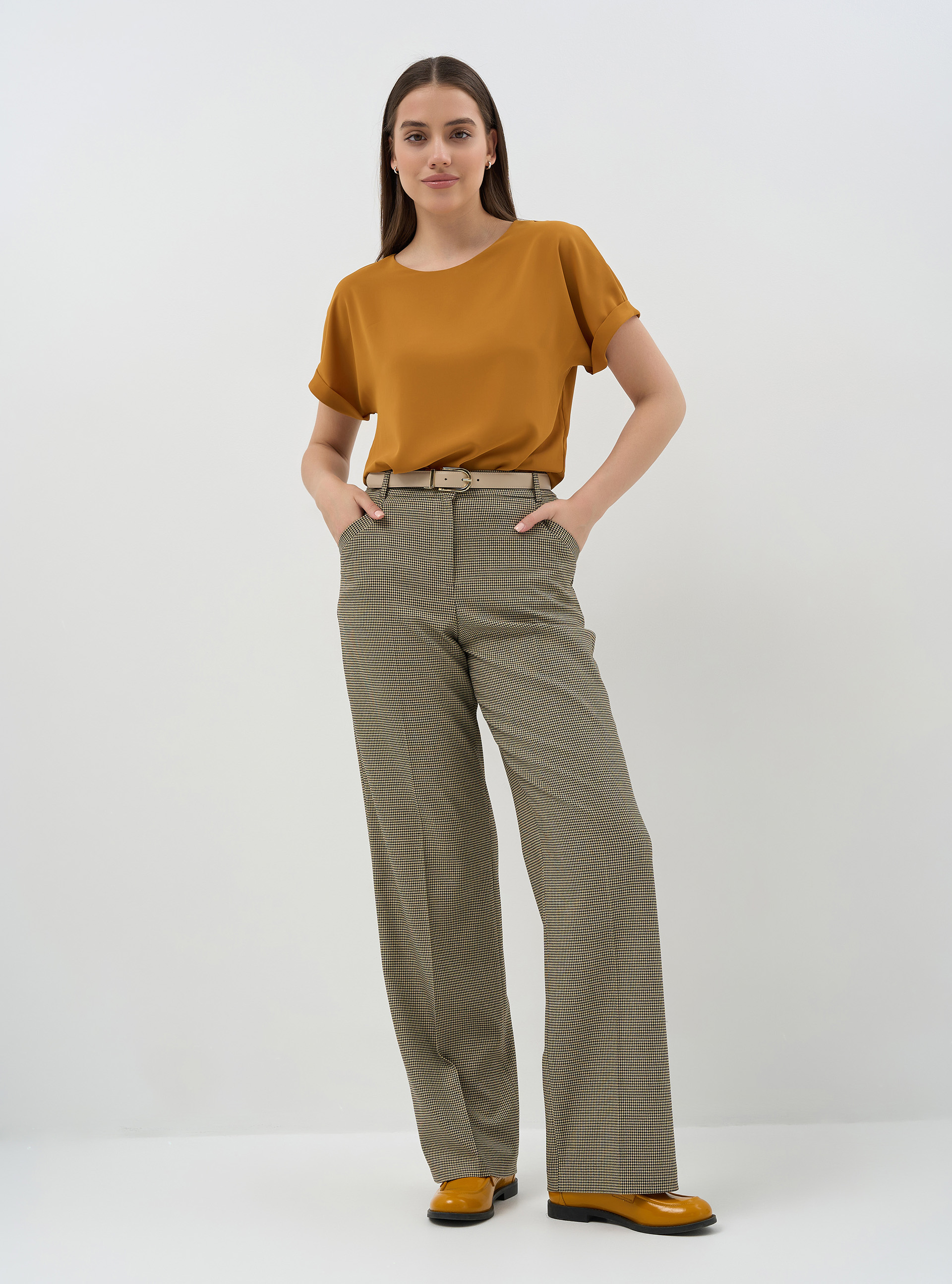 Брюки прямые полной длины, декоративные листочки на боковых карманах, резинка в поясе. Из костюмной ткани средней плотности с дизайном "гусиная лапка".