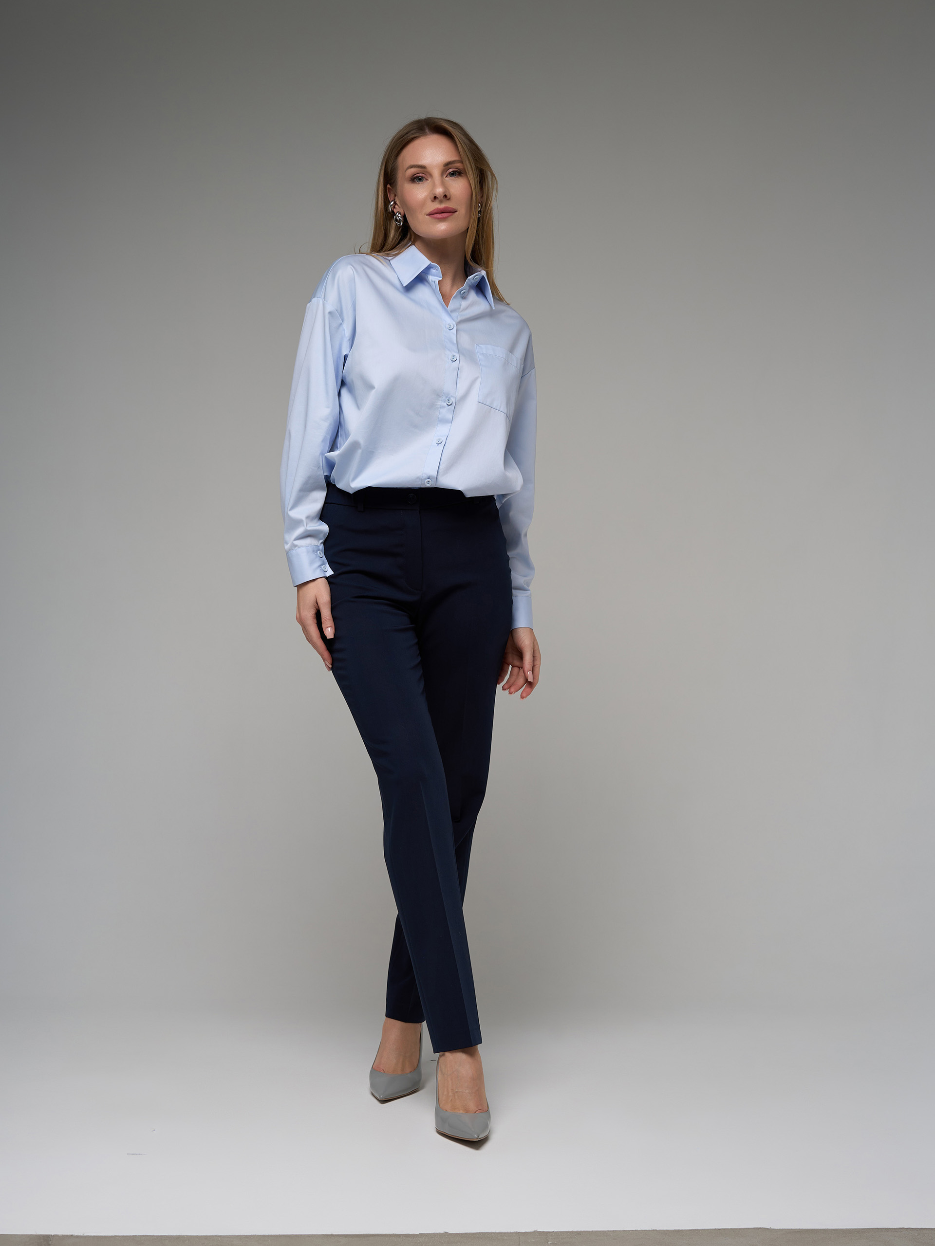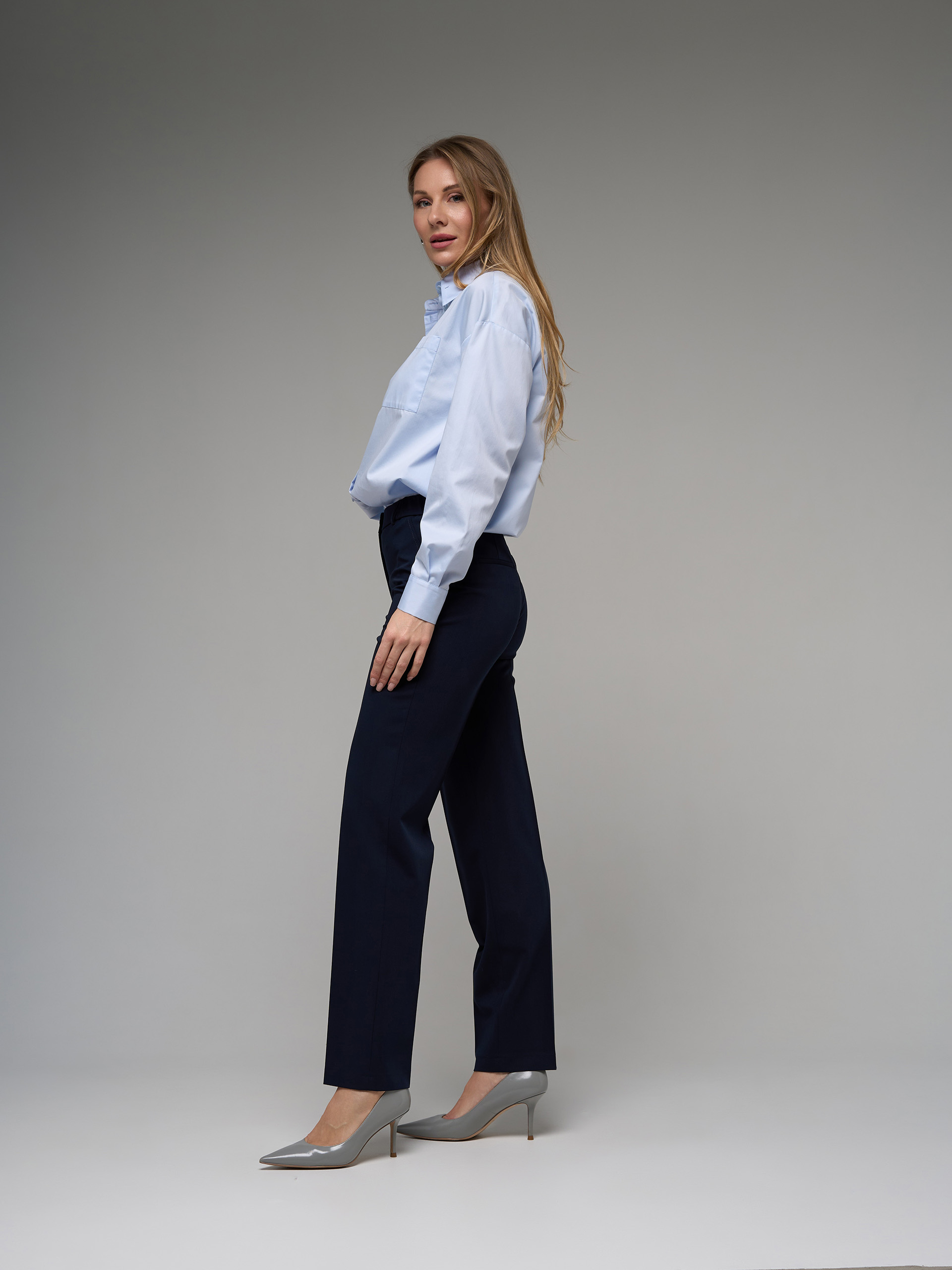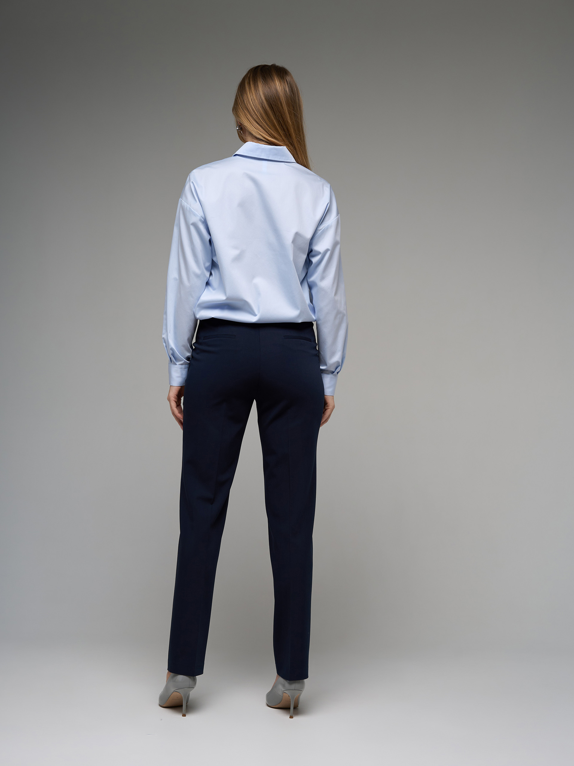 Брюки-дудочки, узкие, зауженные книзу, высокая линия талии, резинка в поясе. Из гладкой костюмной ткани темно-синего цвета.