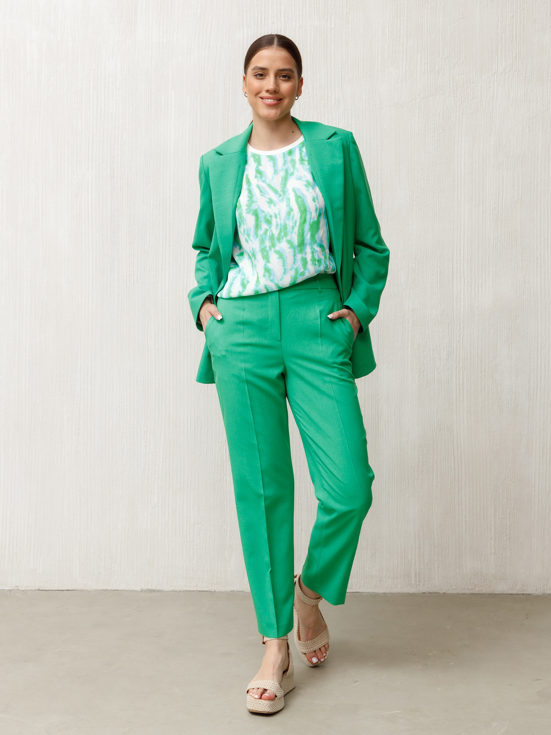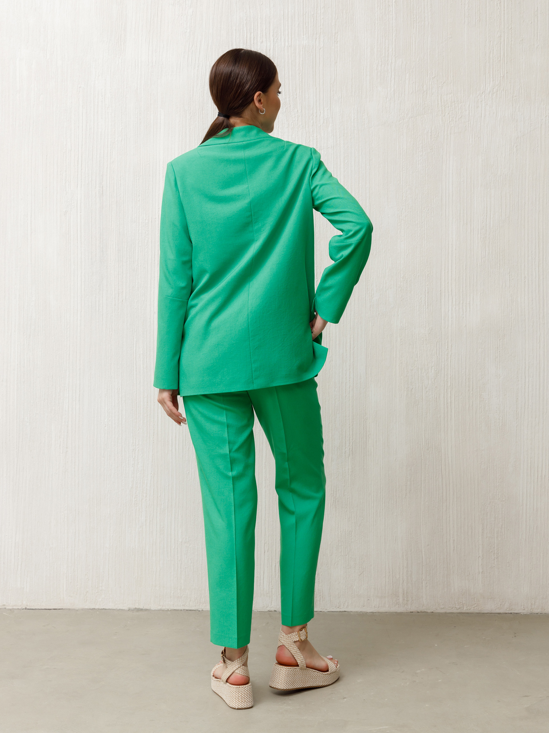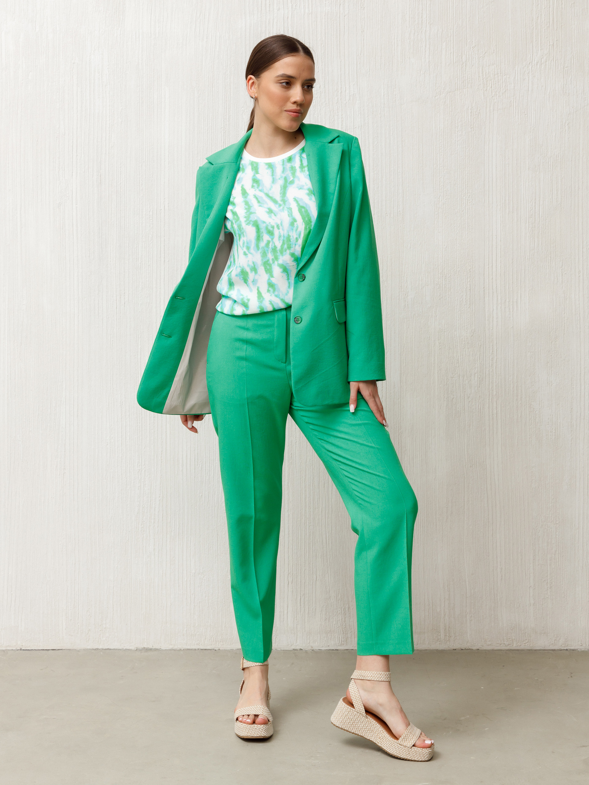 Зауженные книзу, слегка укороченные брюки из смесовой с хлопком немнущейся ткани.