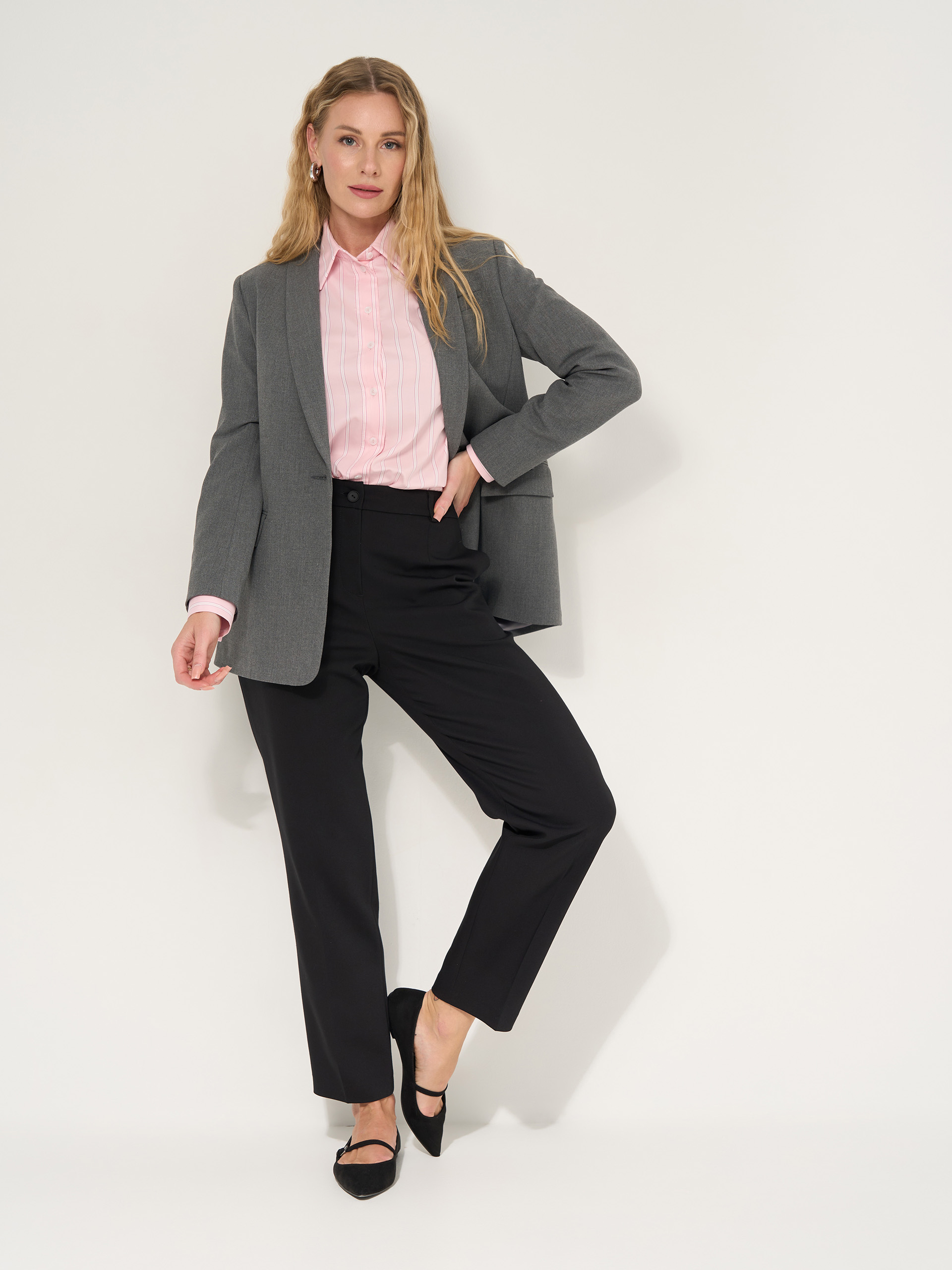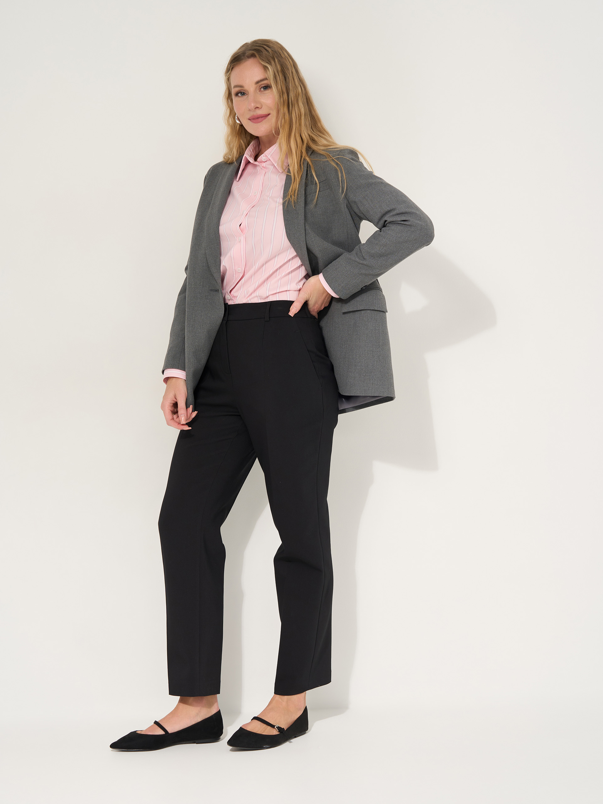 Брюки зауженные книзу, резинка в поясе. Из гладкой хорошо держащей форму костюмной ткани с вискозой.