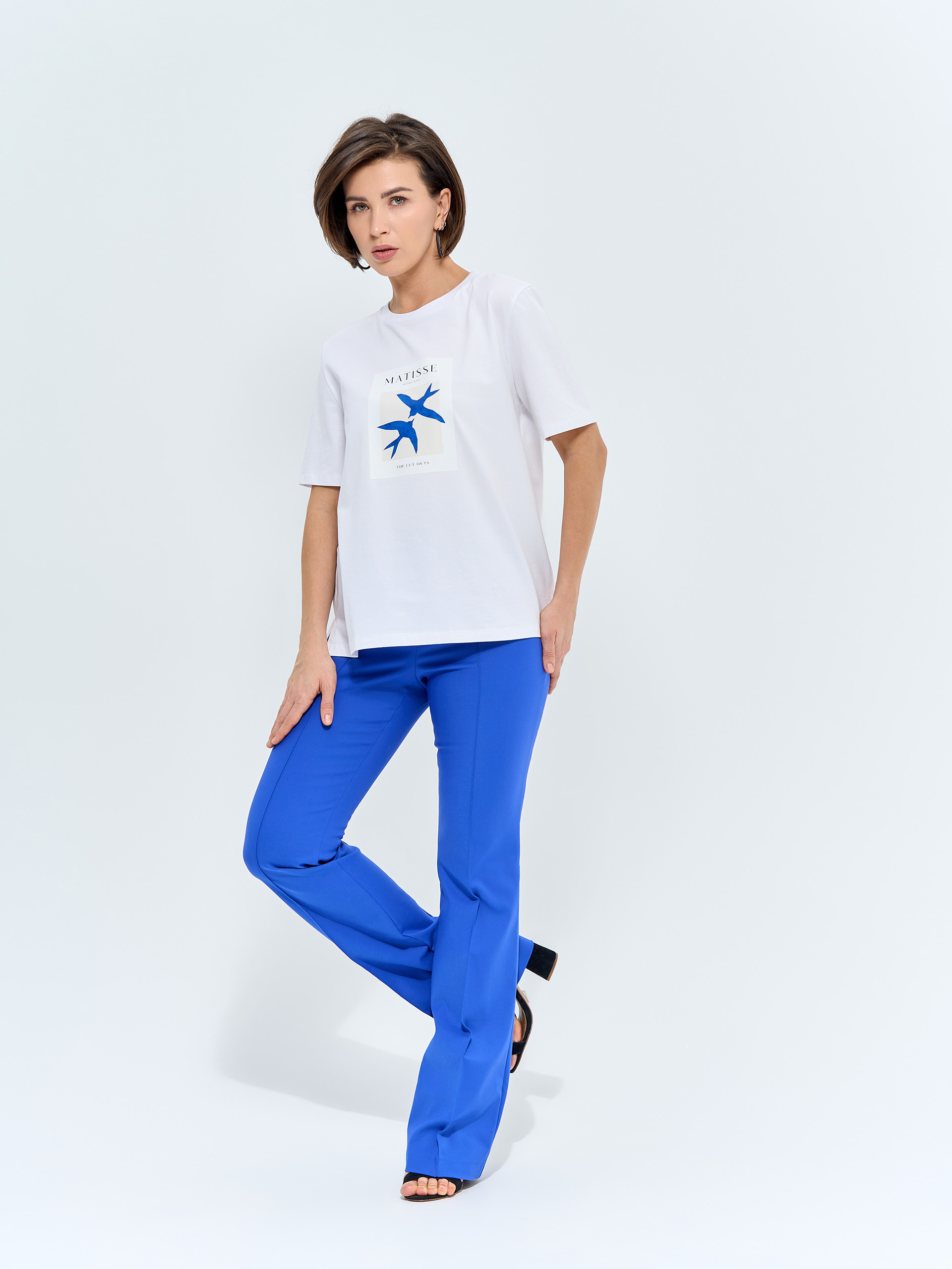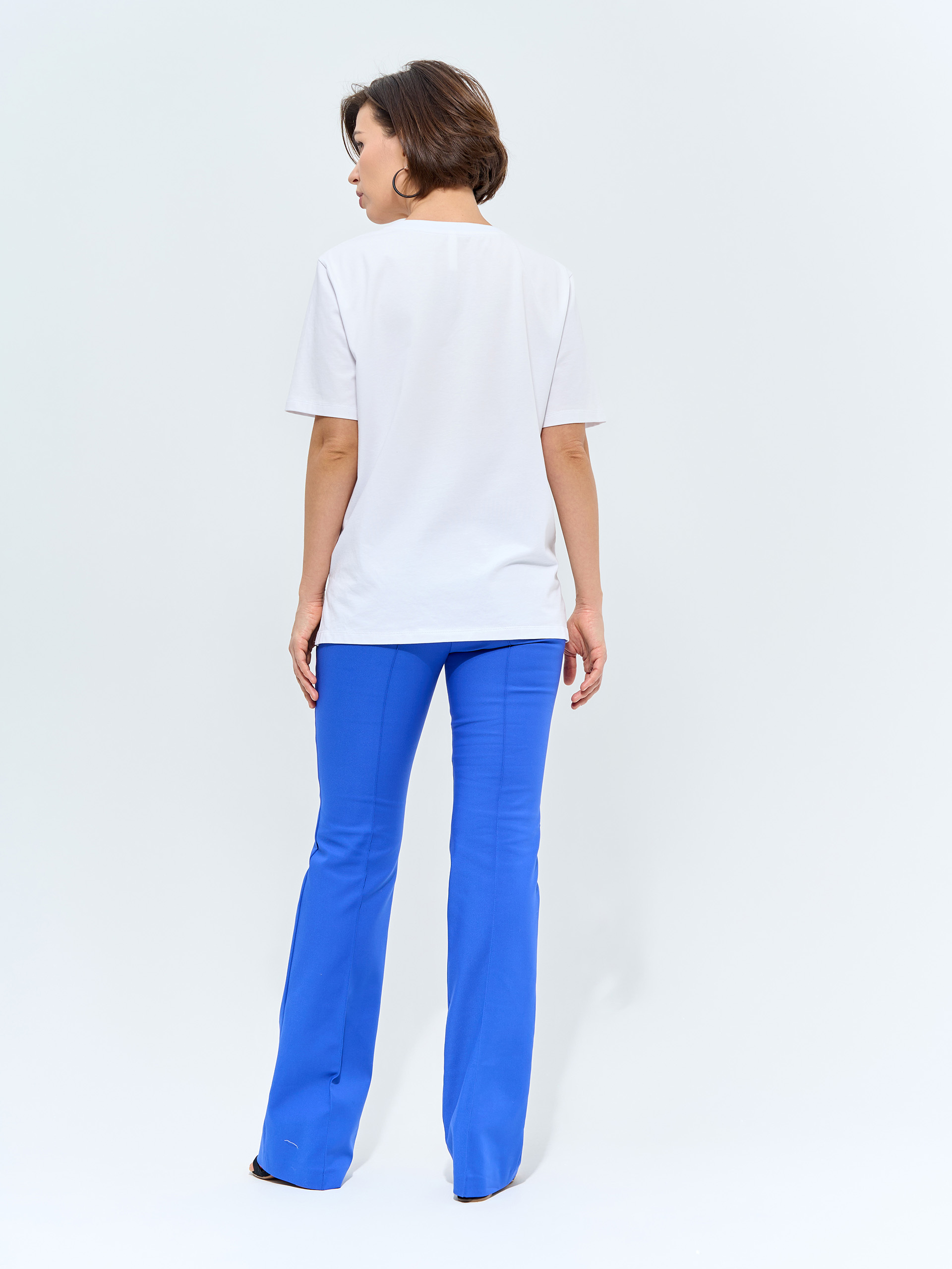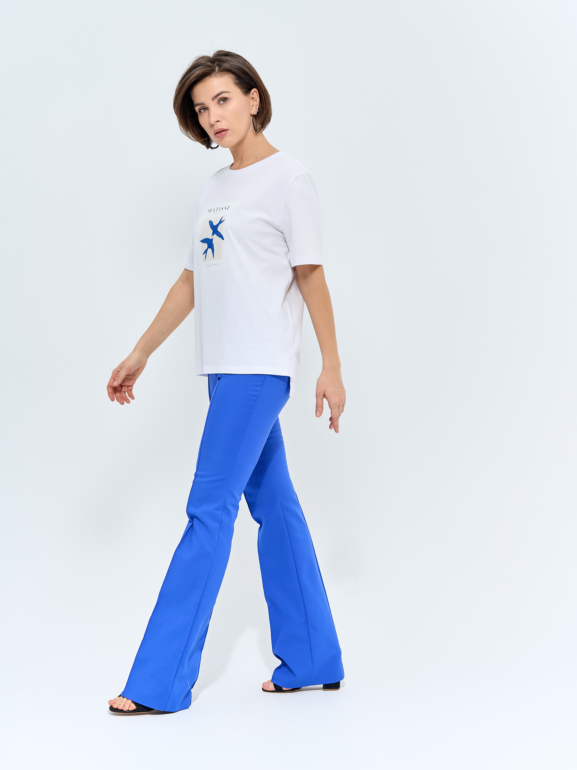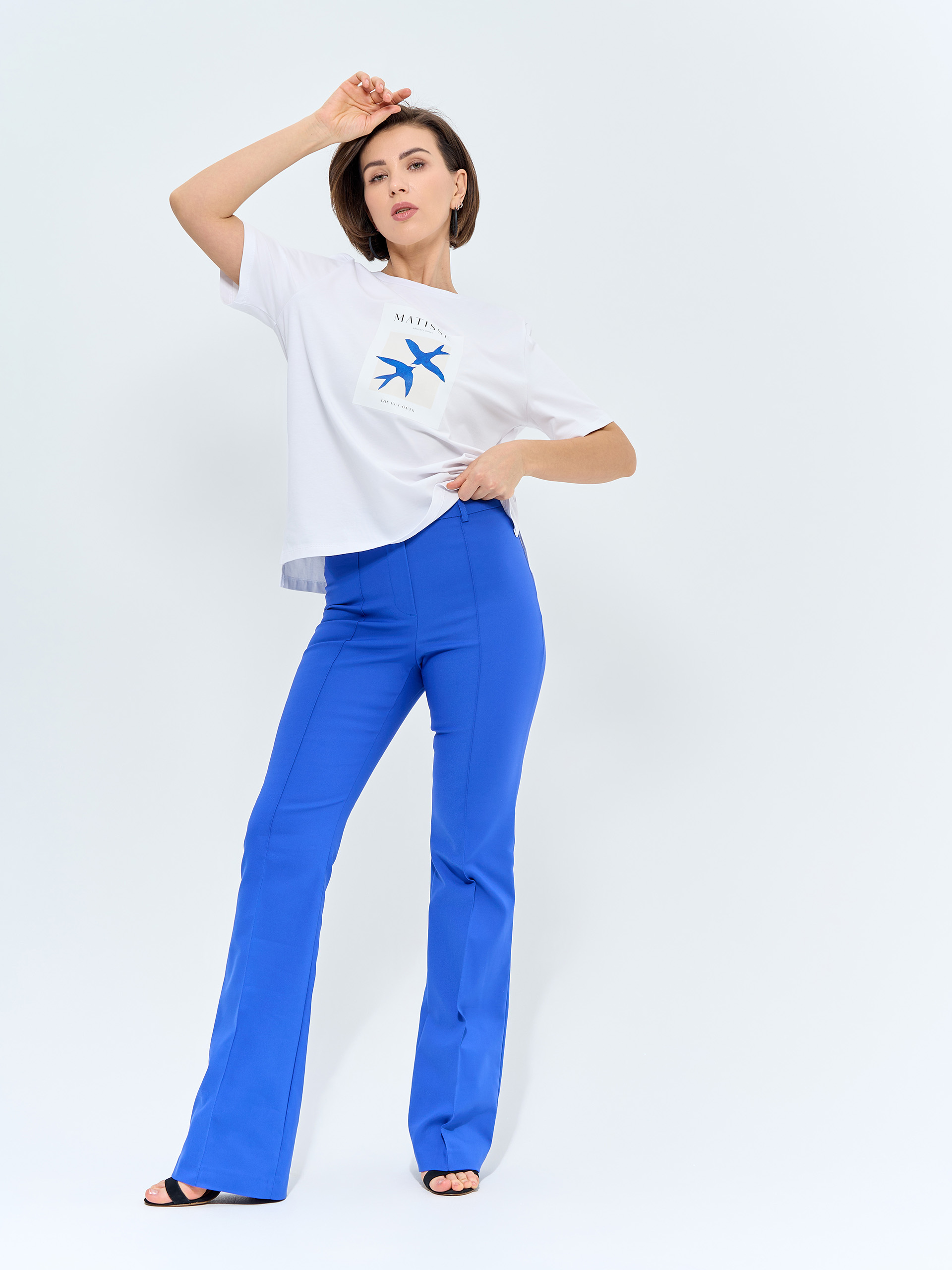 Брюки клеш, высокая талия, из плотной эластичной ткани с вискозой и хлопком.