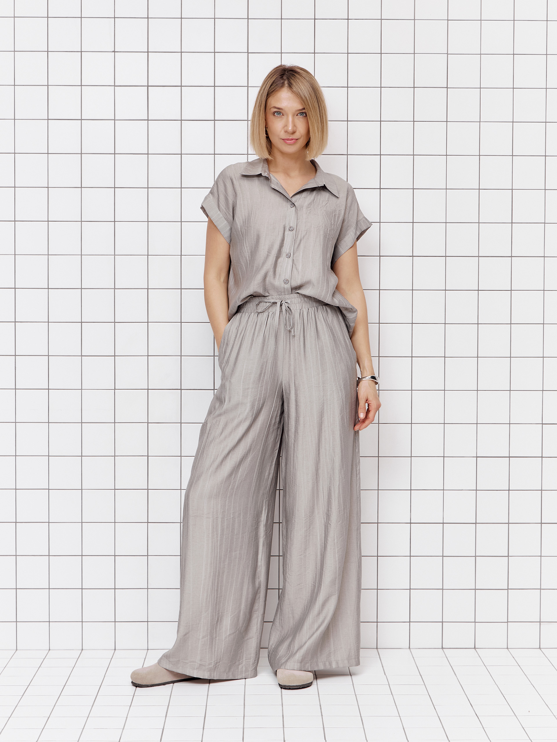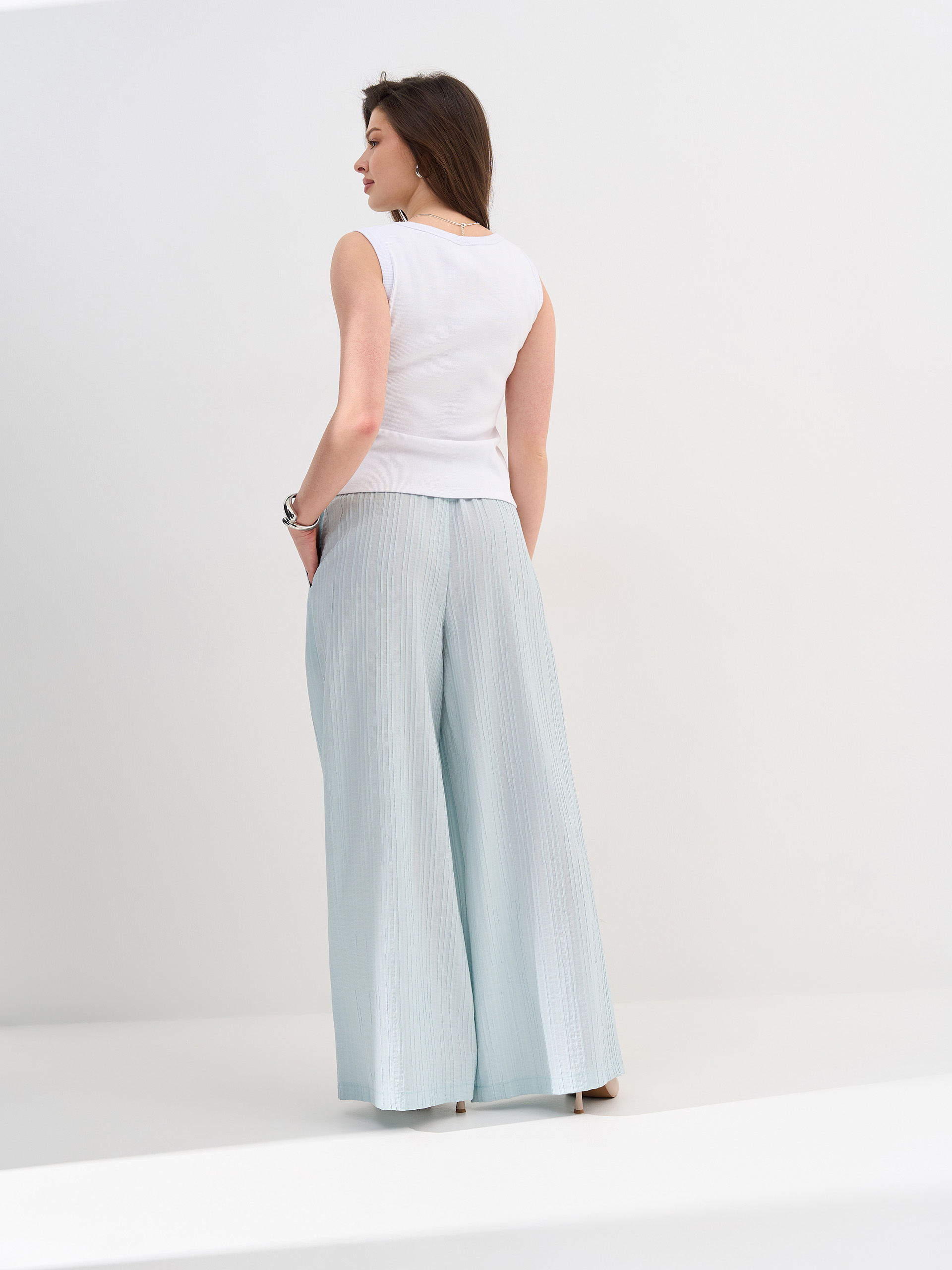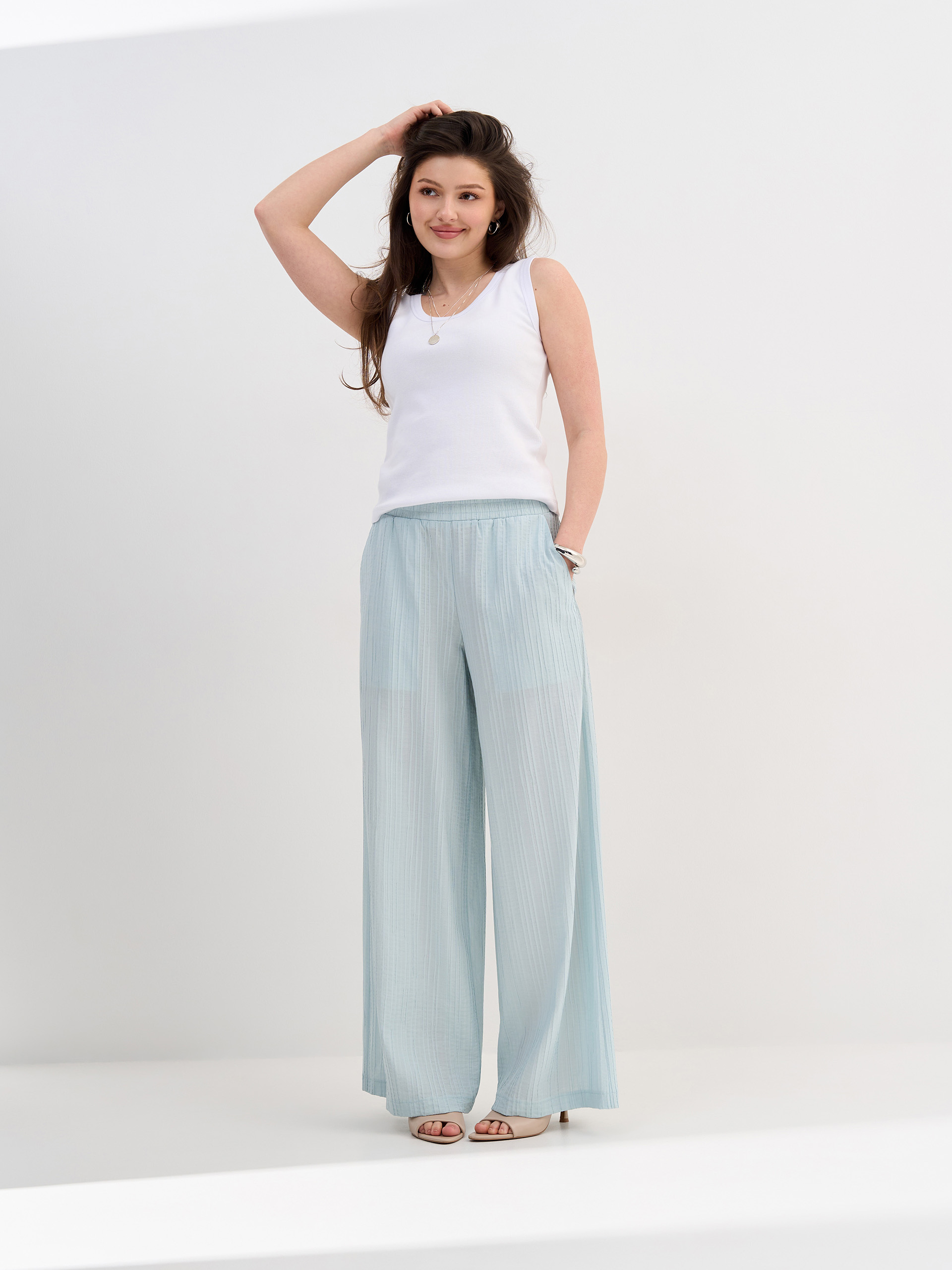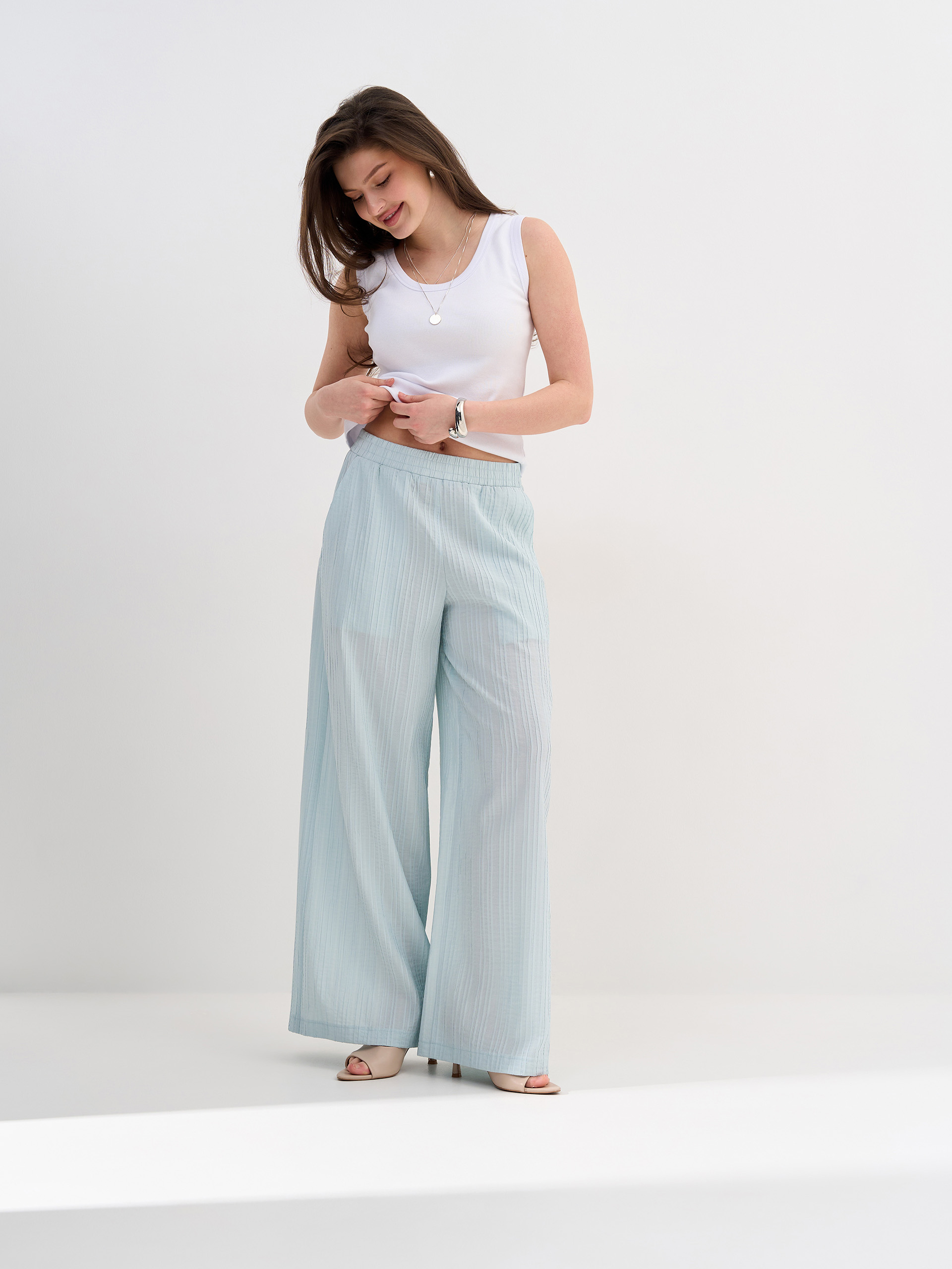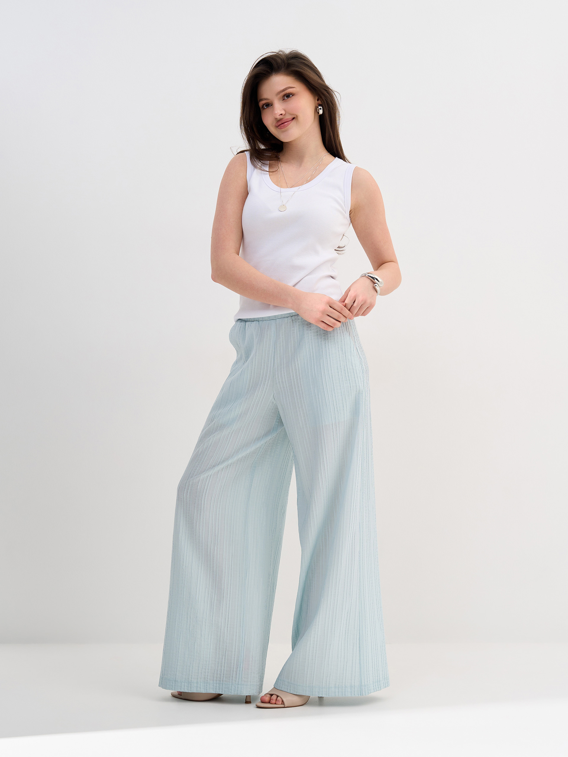 Брюки-палаццо, резинка в поясе, из фактурной вискозной ткани.