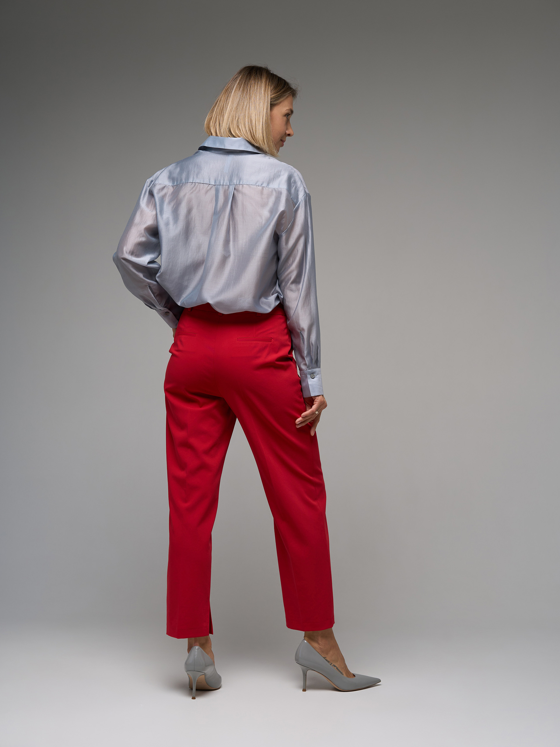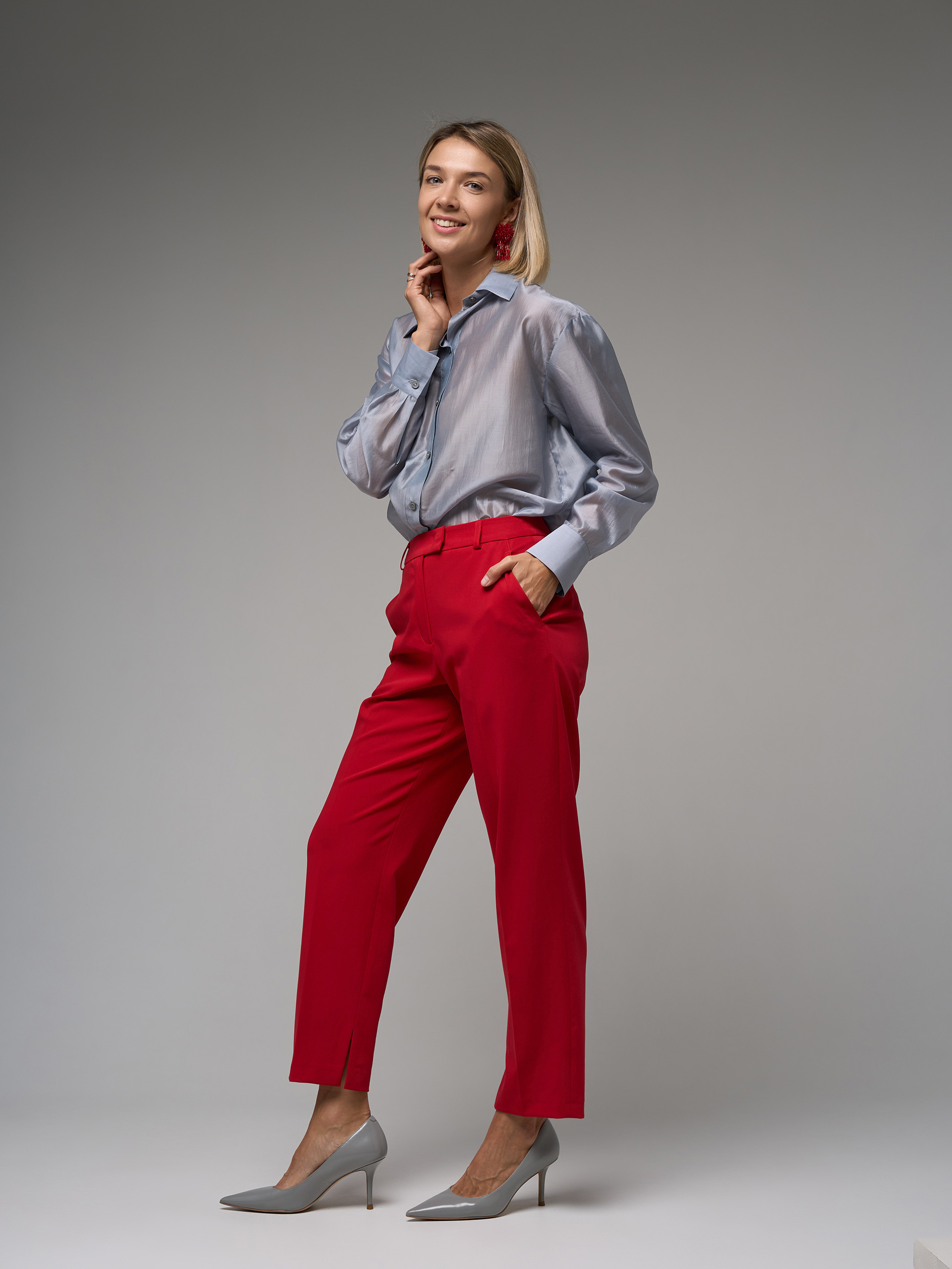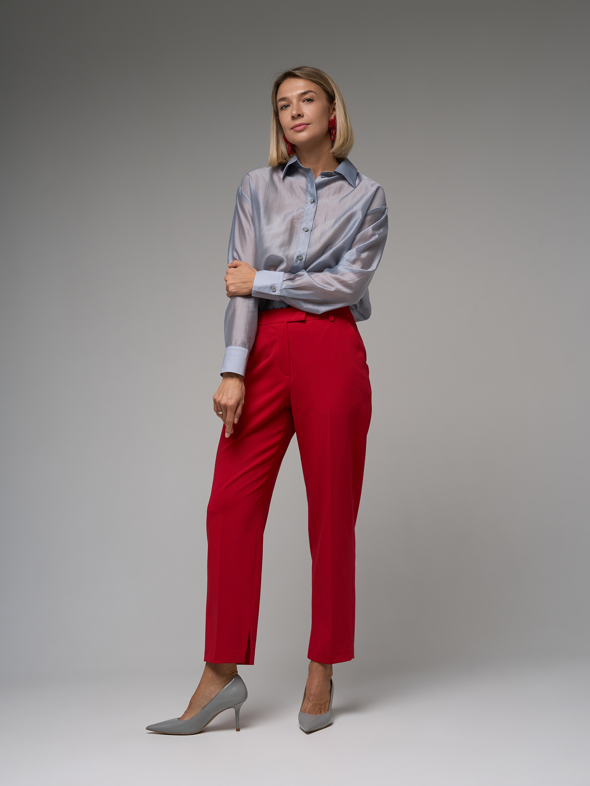 Брюки зауженные, из гладкой костюмной ткани красного цвета, с разрезами в шаговом шве, стрелки.