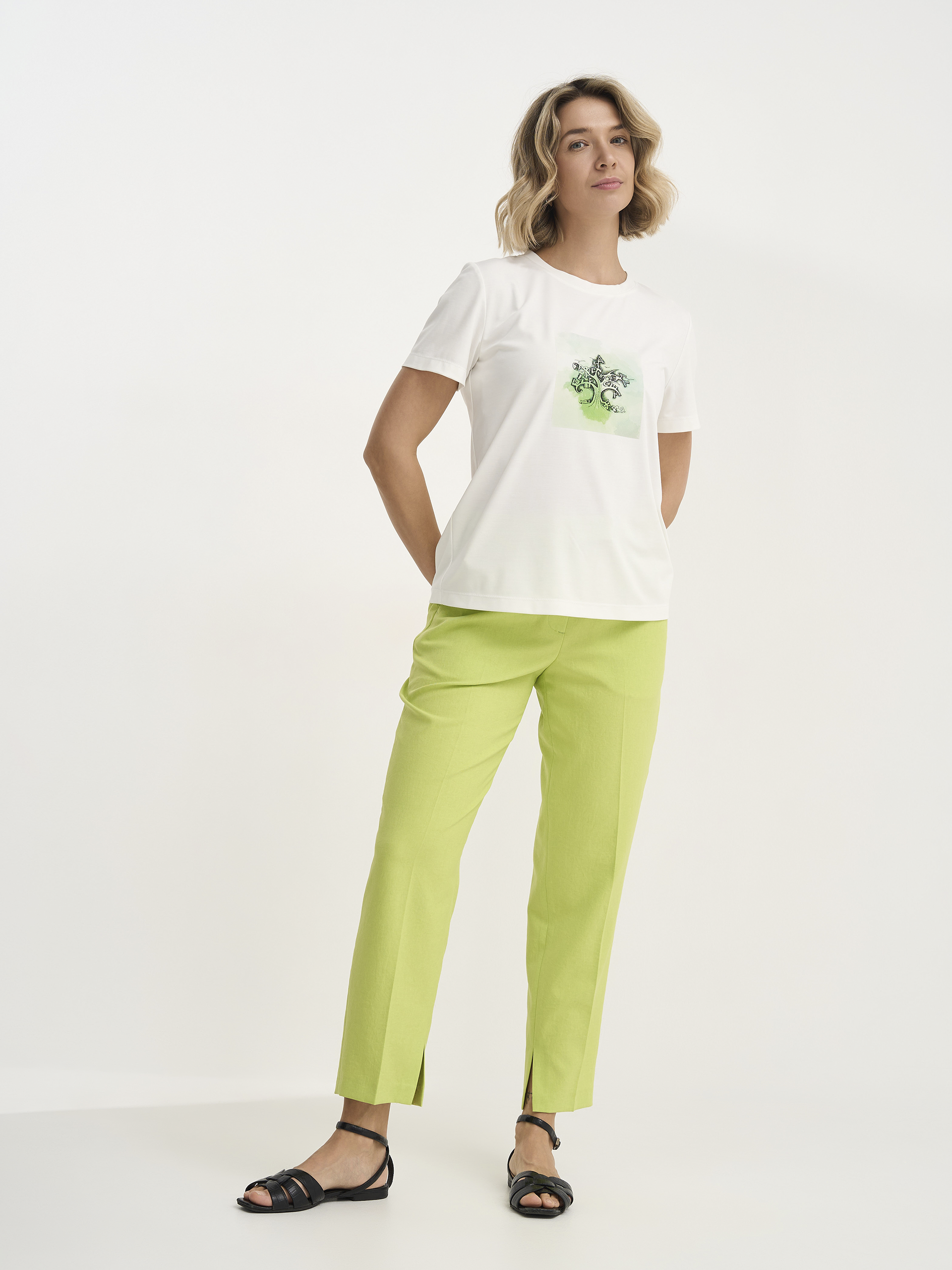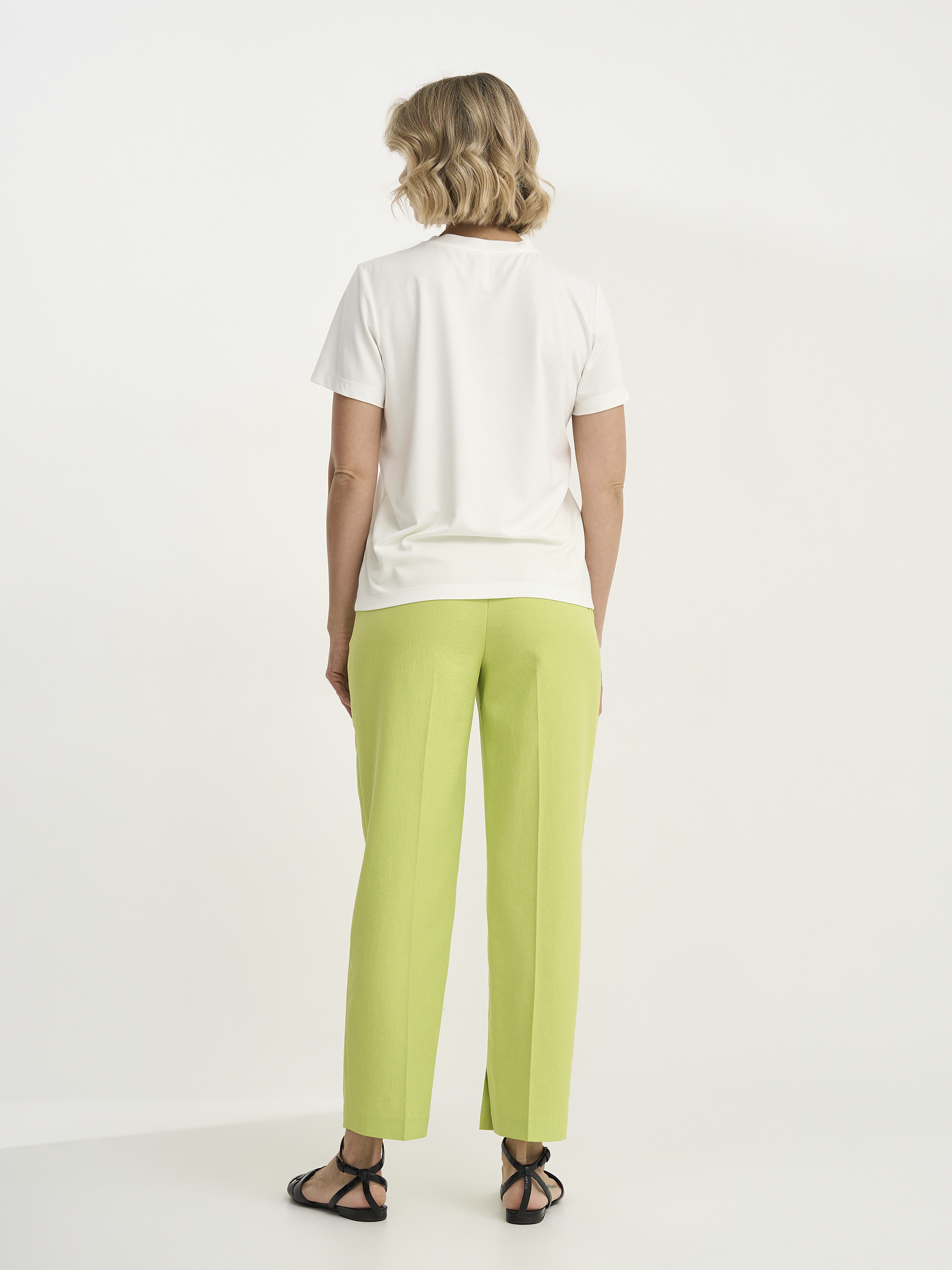 Брюки прямые, укороченные, зауженные, с разрезом по внутреннему шву. Из фактурной смесовой с хлопком сжатой ткани.