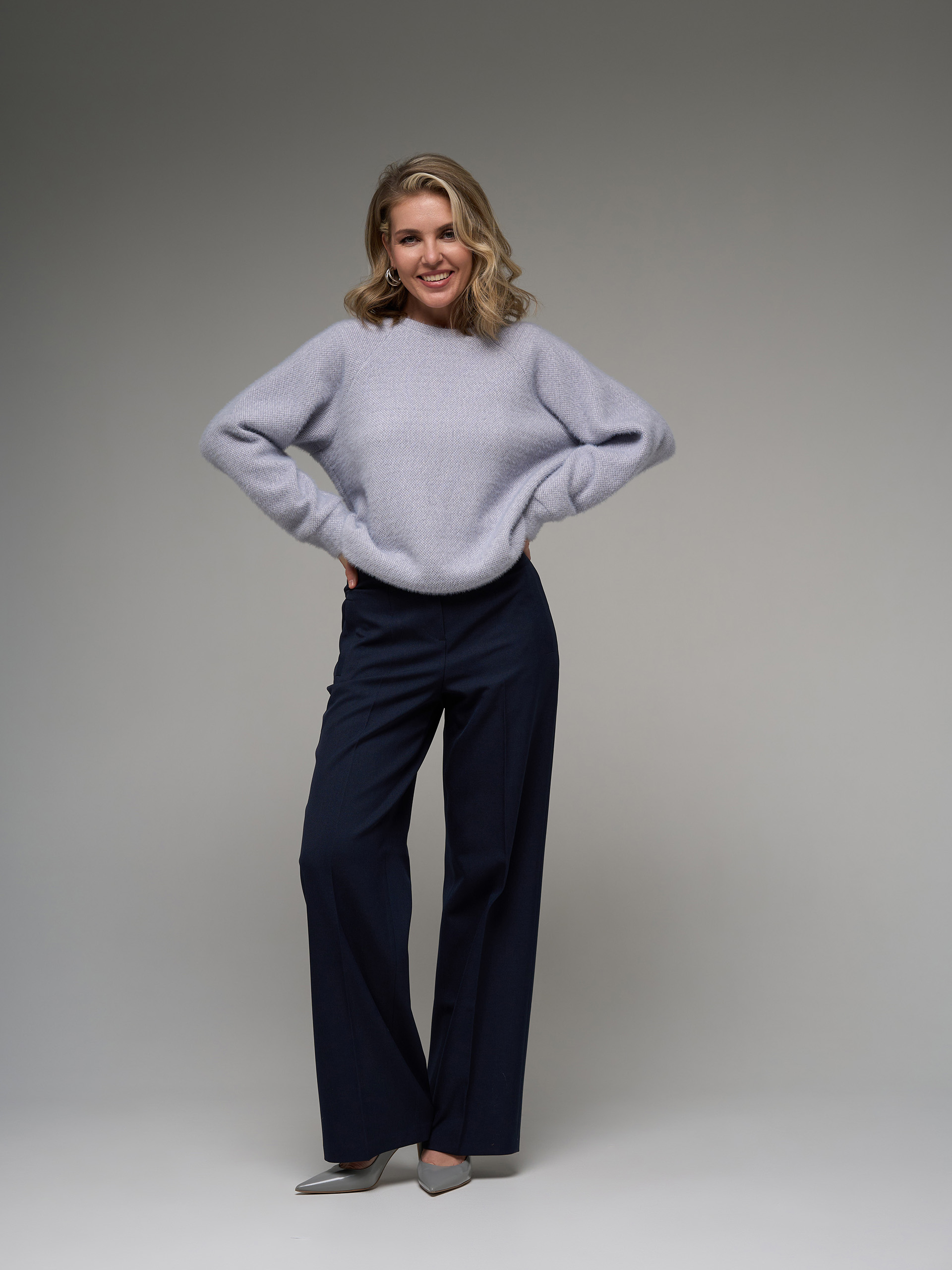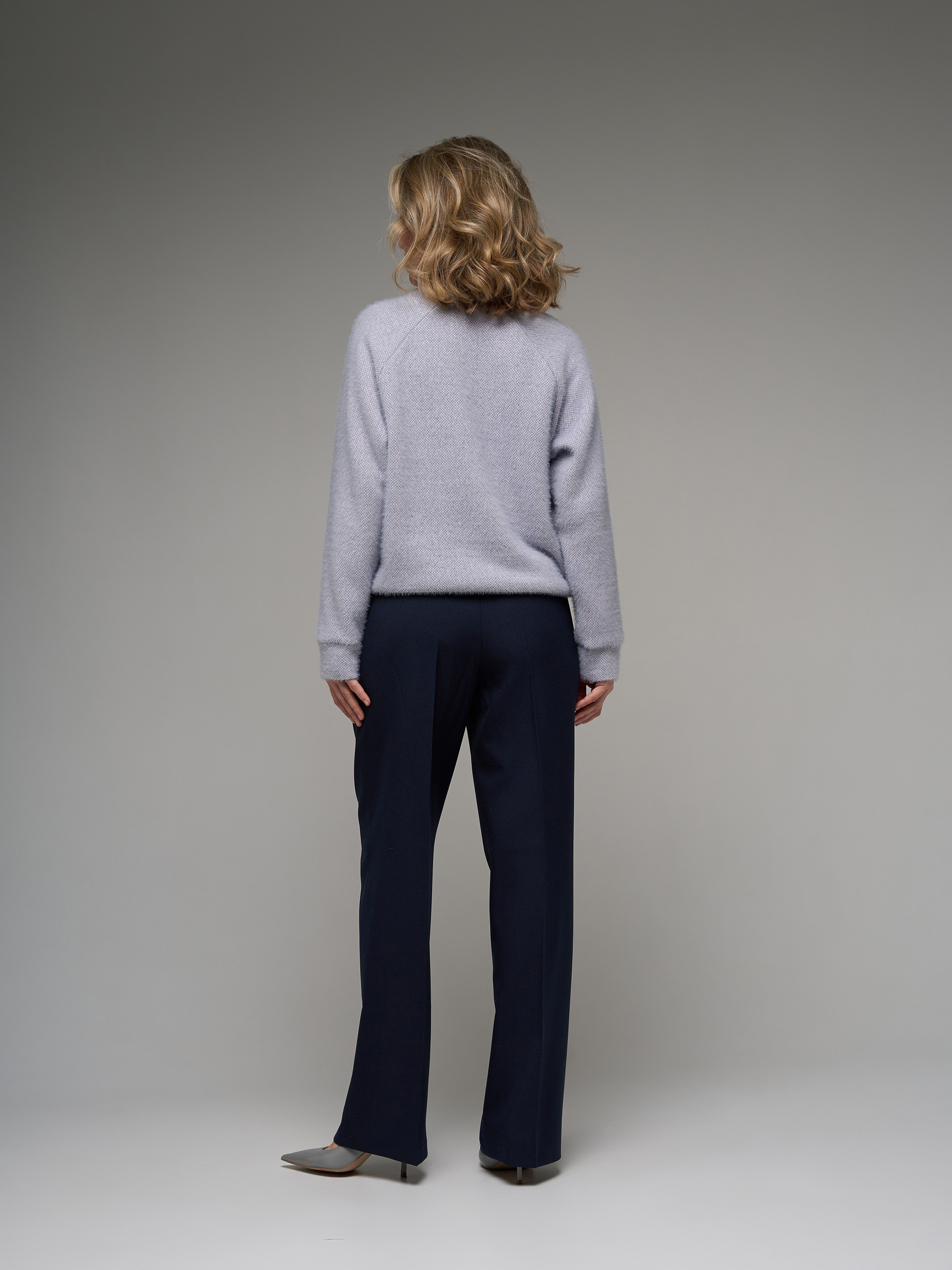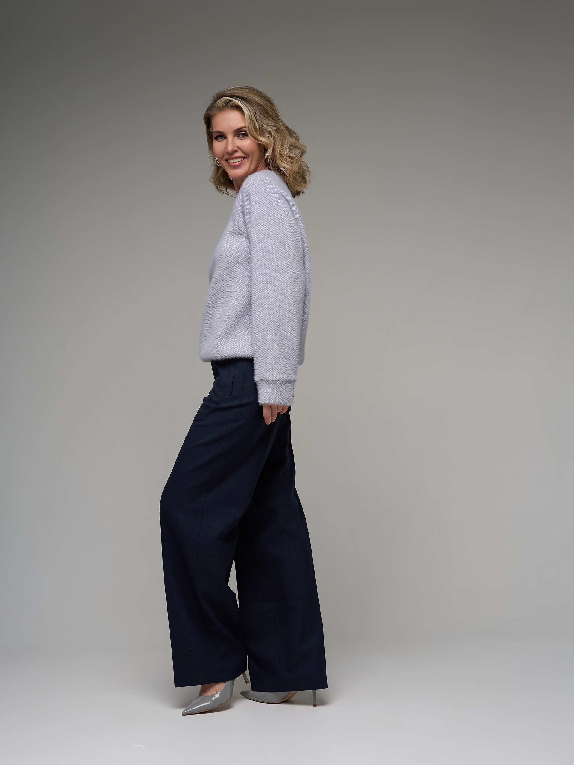 Брюки свободные, с высокой линией талии, прямые, в поясе частичная вставка из резинки. Из плотной костюмной ткани.