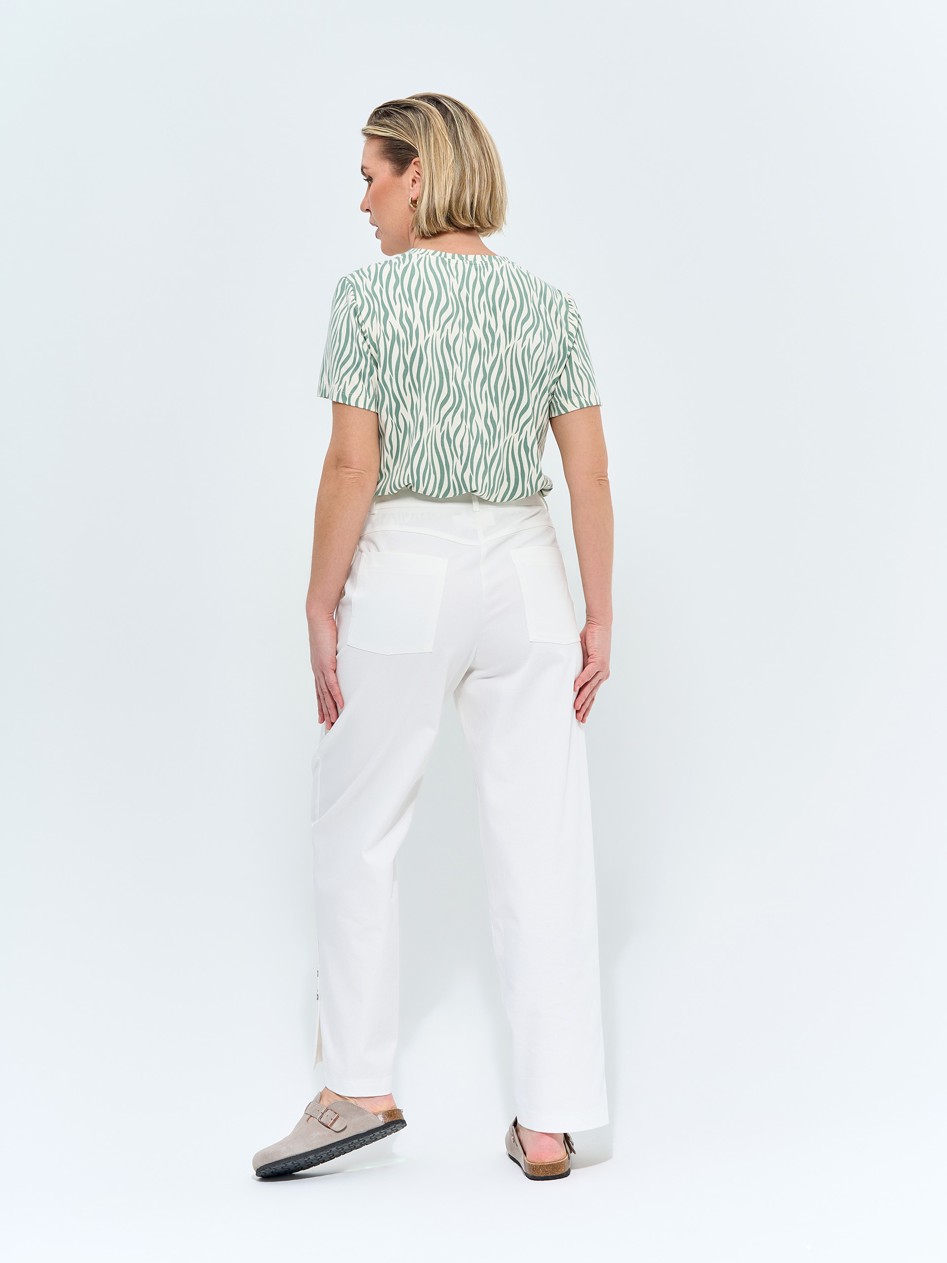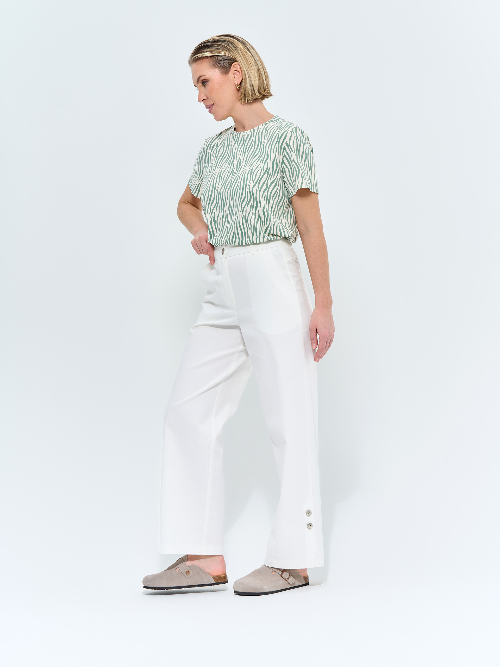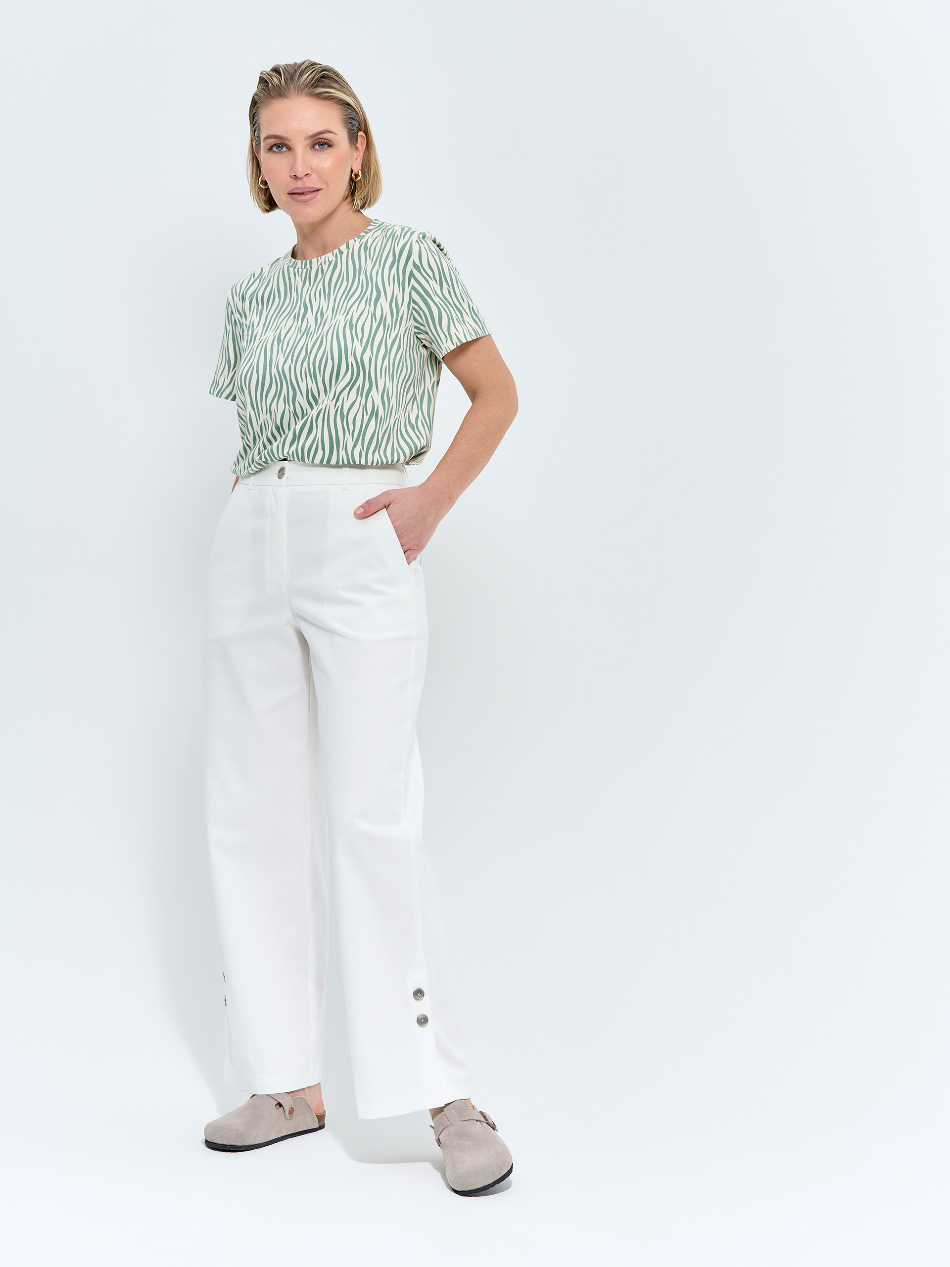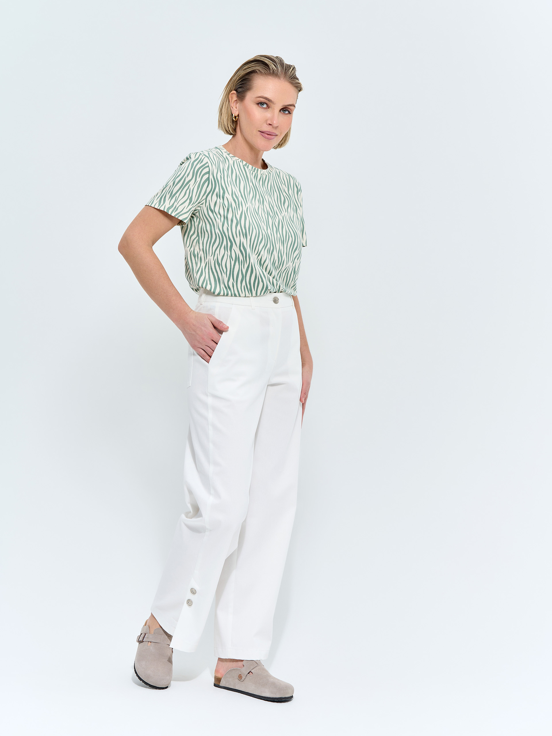 Брюки прямые свободные. Хлопковые, сбоку шлица с декоративными пуговицами, накладные карманы в джинсовом стиле.