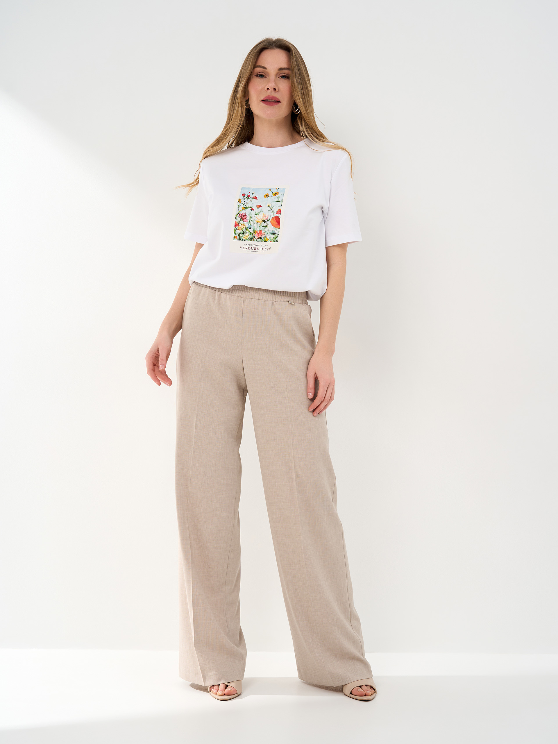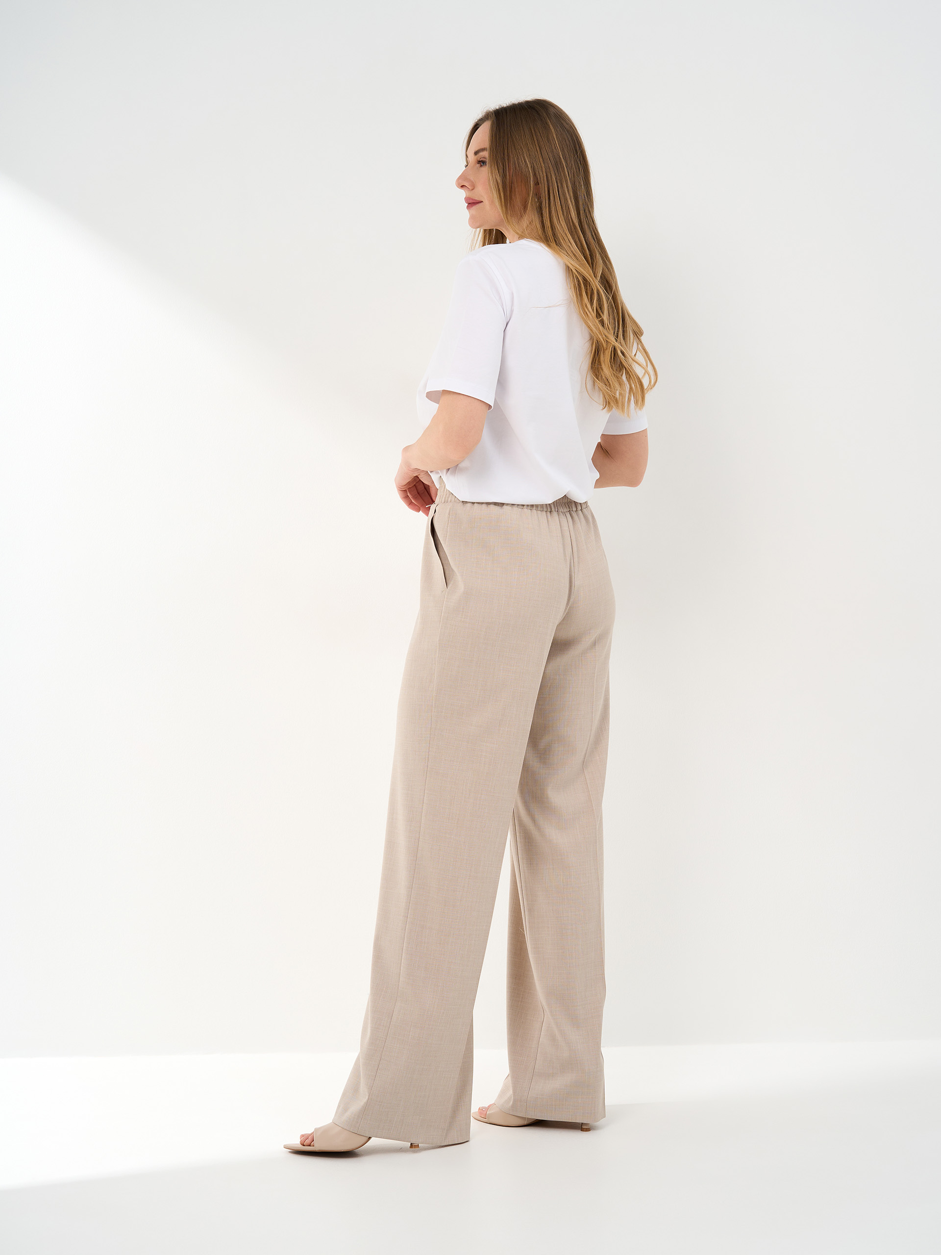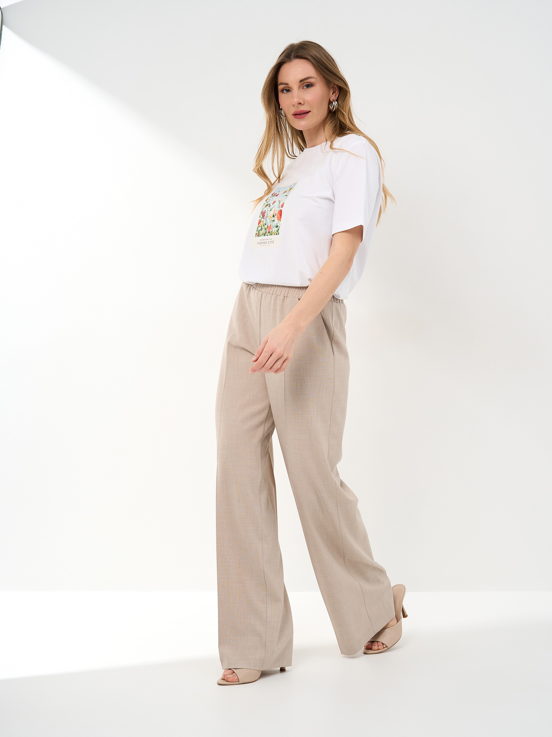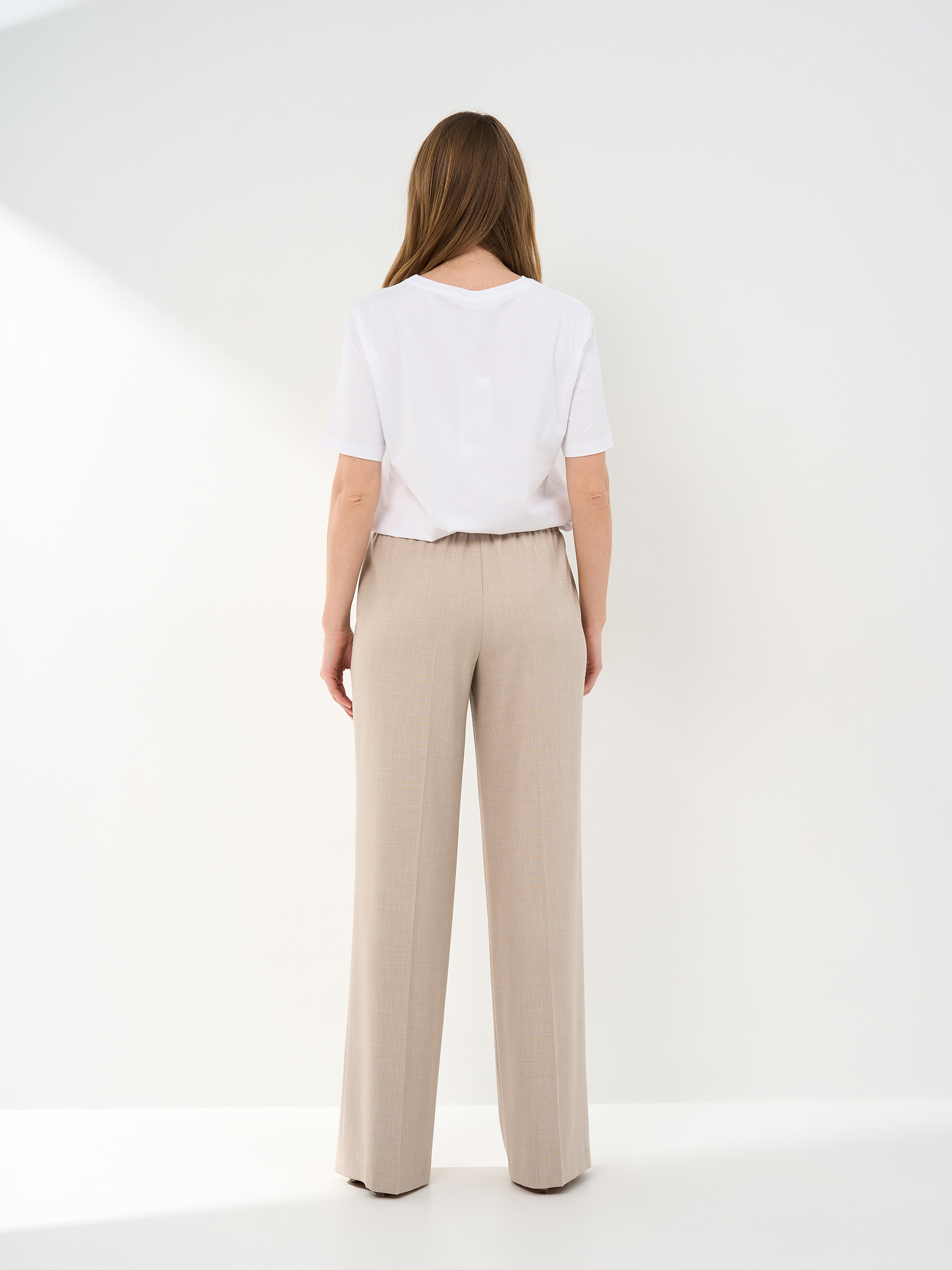 Брюки прямые,свободного силуэта, из легкой меланжевой вискозной ткани, в поясе резинка по кругу.