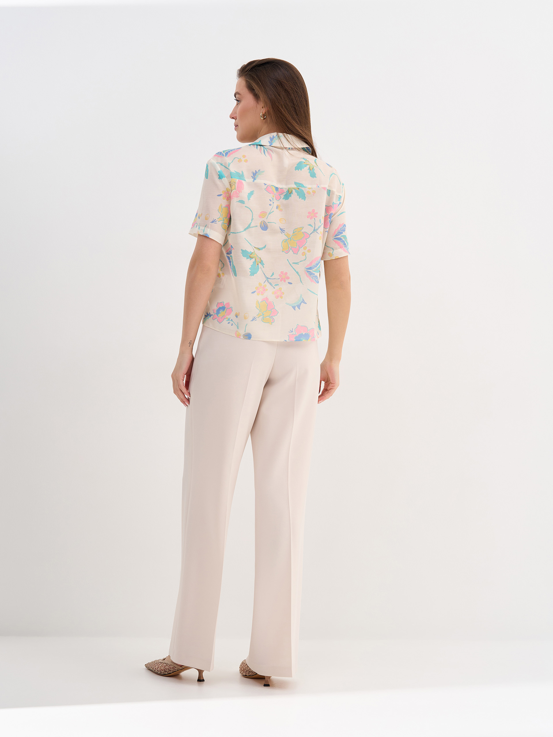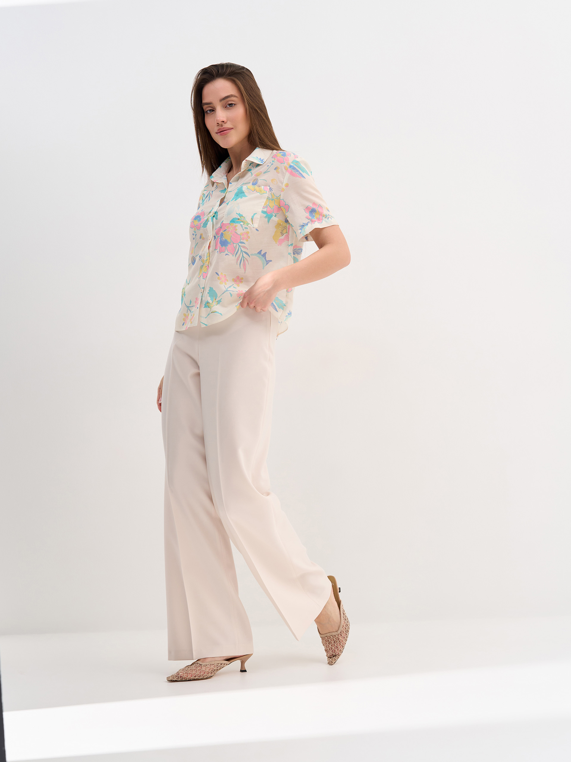 Брюки прямые со стрелками, завышенная линия талии, застежка на потайную молнию. Костюмная струящаяся ткань с вискозой в составе цвета топленого молока.