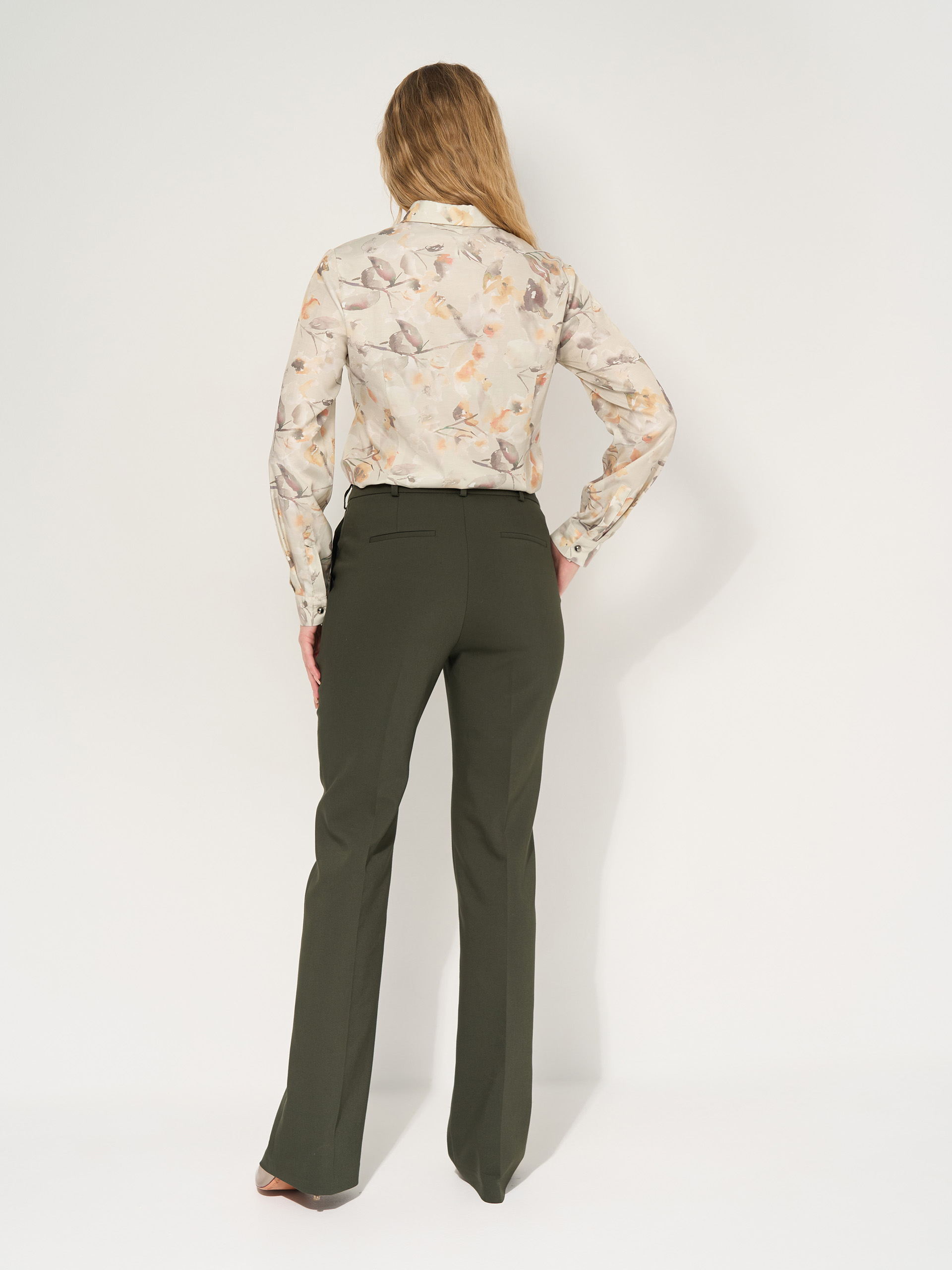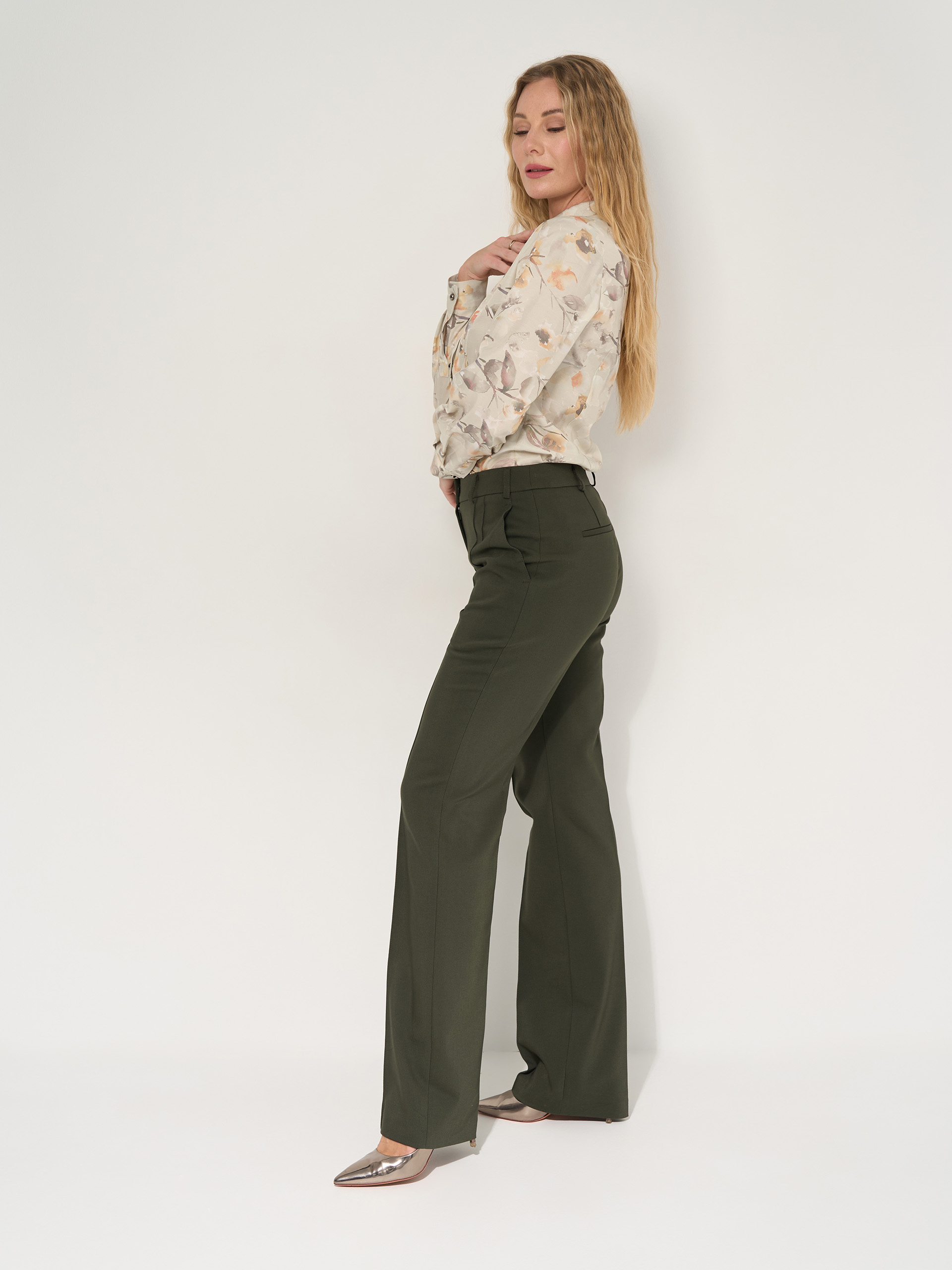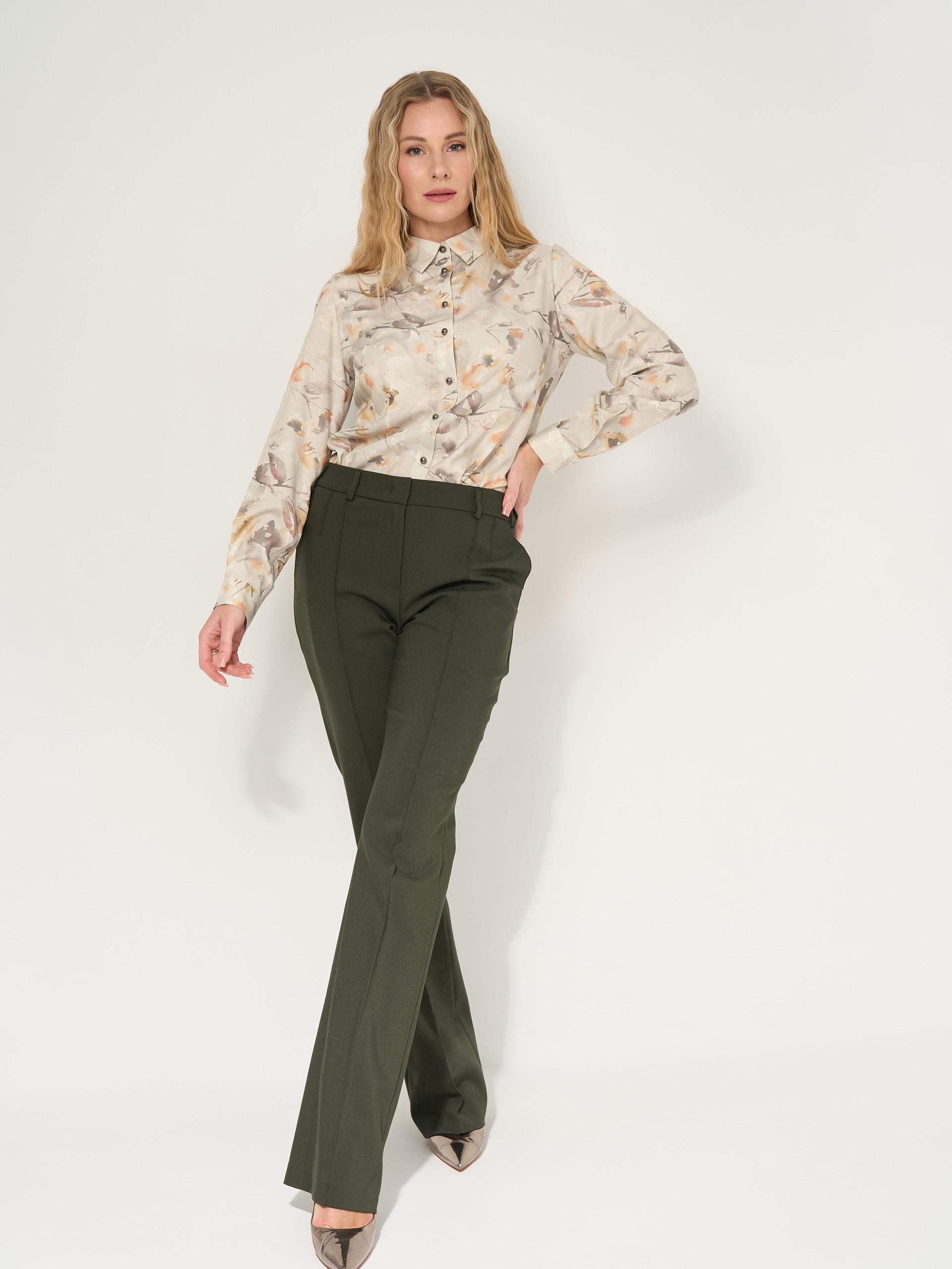 Брюки узкие прямые, с высокой силуэтной талией. Из смесовой костюмной ткани.