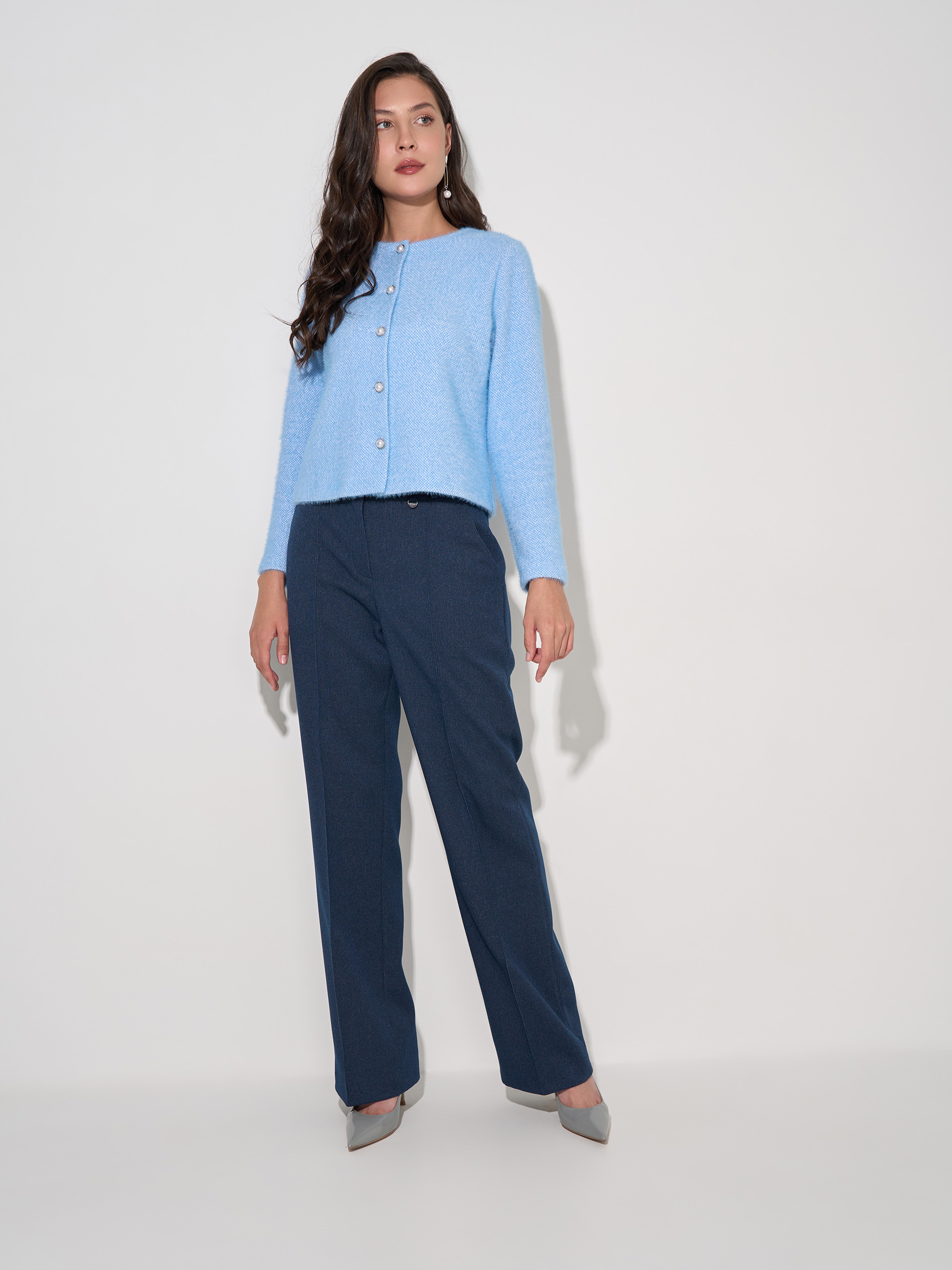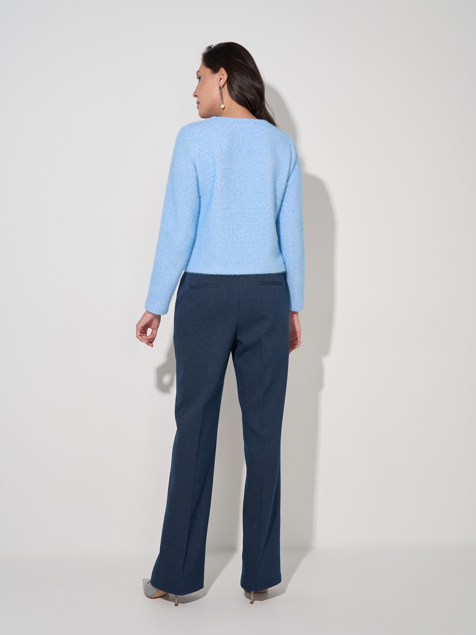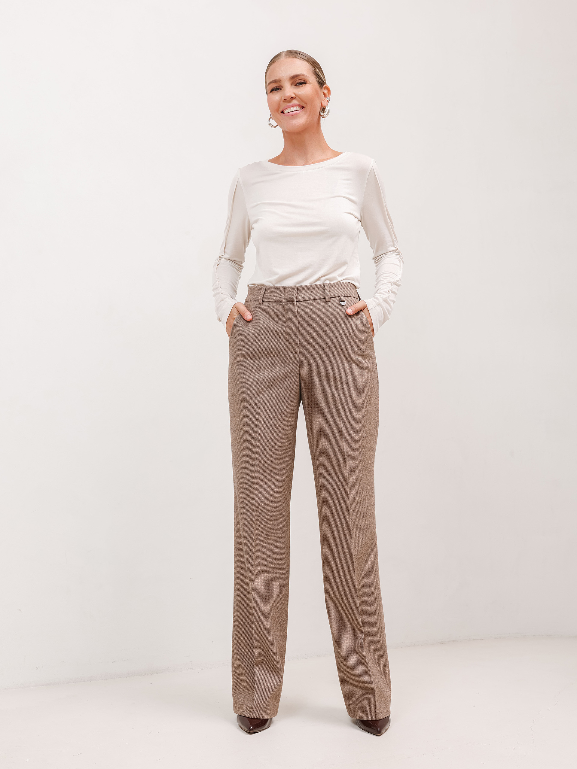Брюки прямого силуэта, среднего по объему, застроченные стрелки, вставка из резинки в поясе, из мягкой теплой вискозной костюмной ткани в синюю мелкую клетку.
