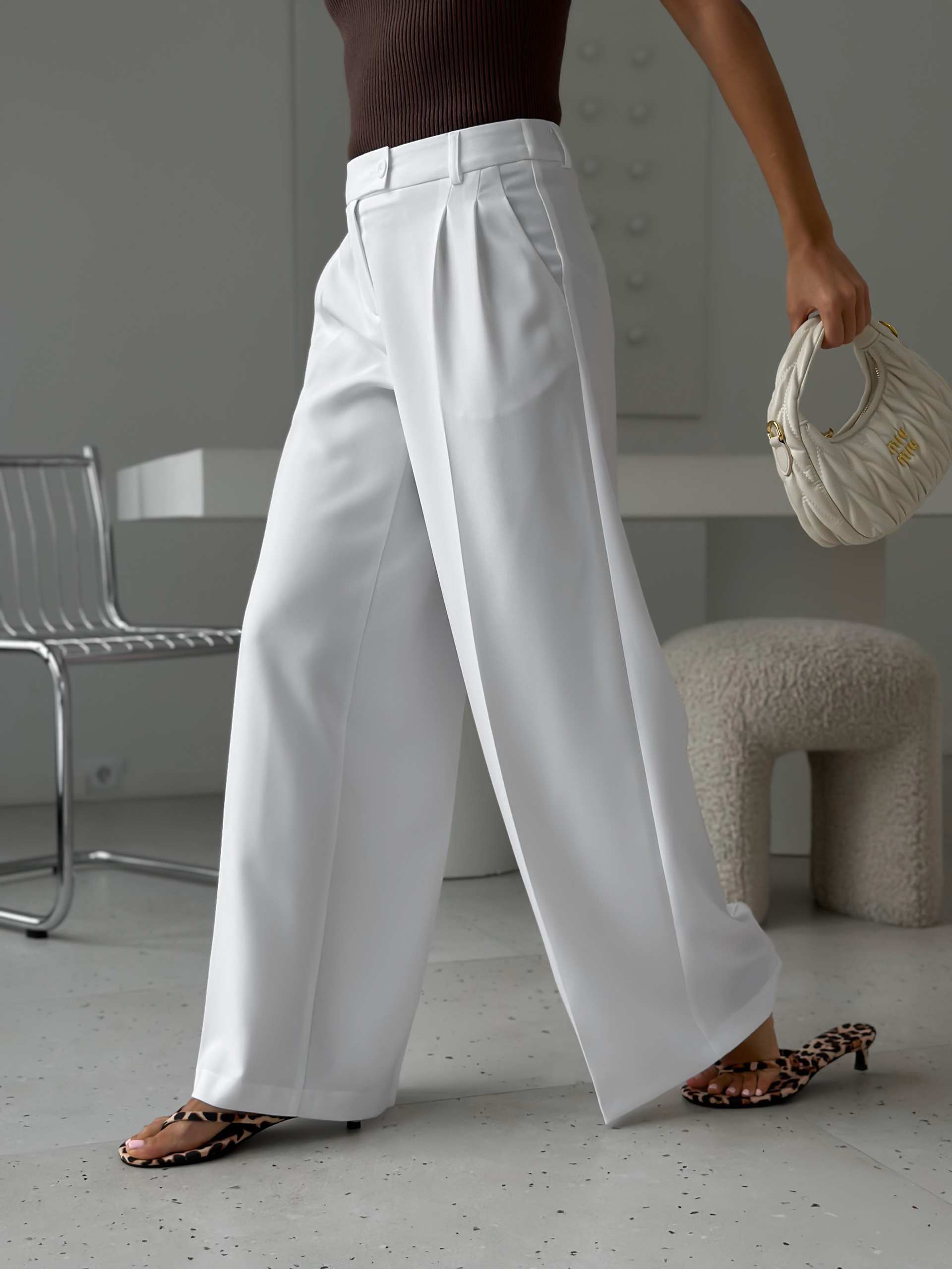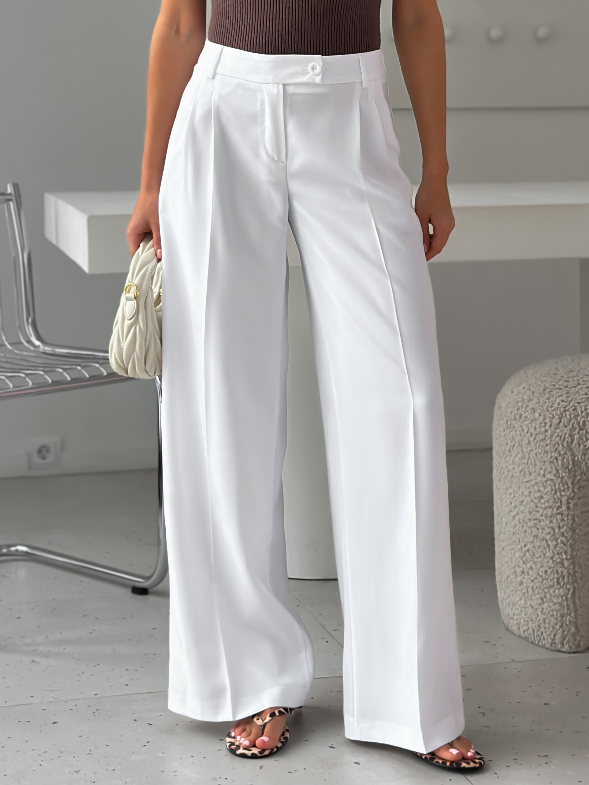 Брюки свободного прямого силуэта, с застроченныеми защипами, из смесовой с хлопком легкой немнущейся ткани.