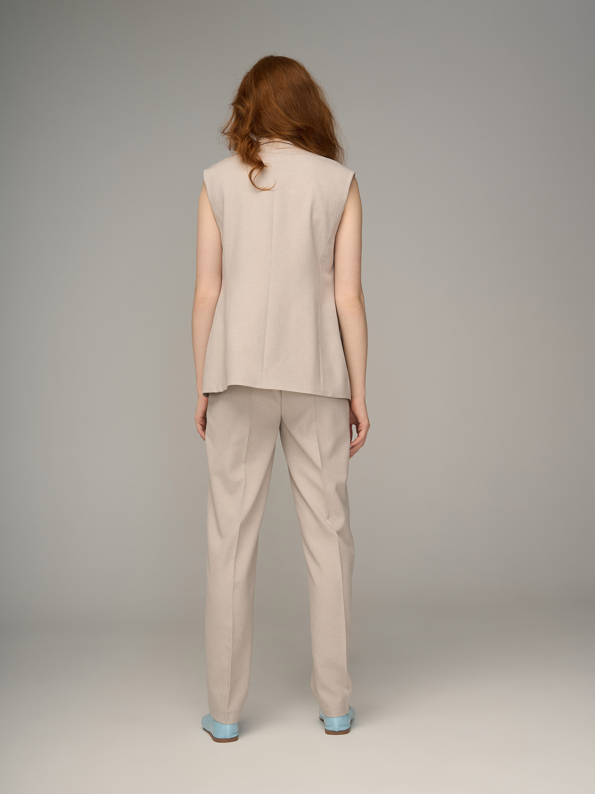 Брюки укороченные, зауженные книзу, в задней части пояса резинка. Из фактурной смесовой с хлопком сжатой ткани.