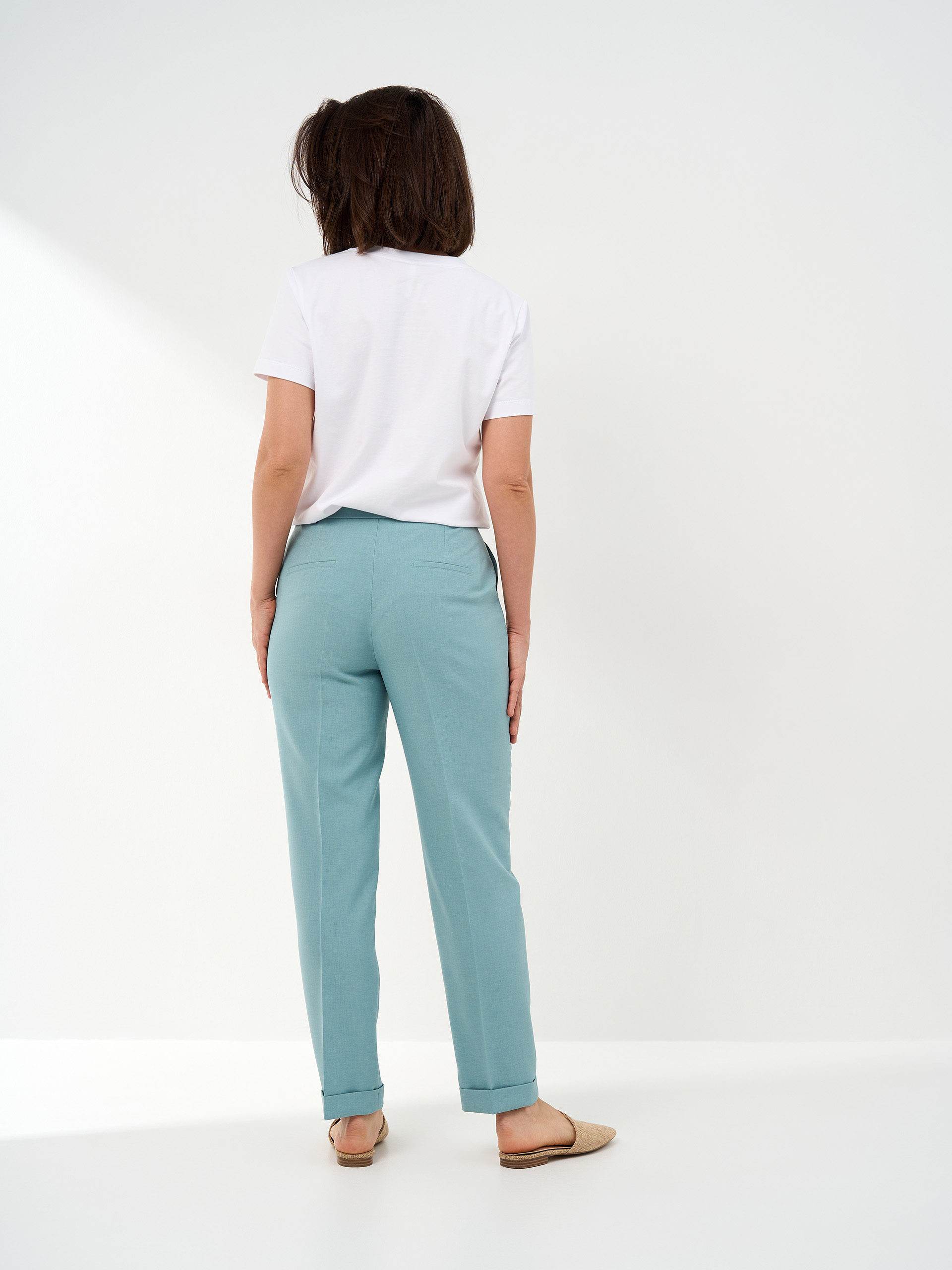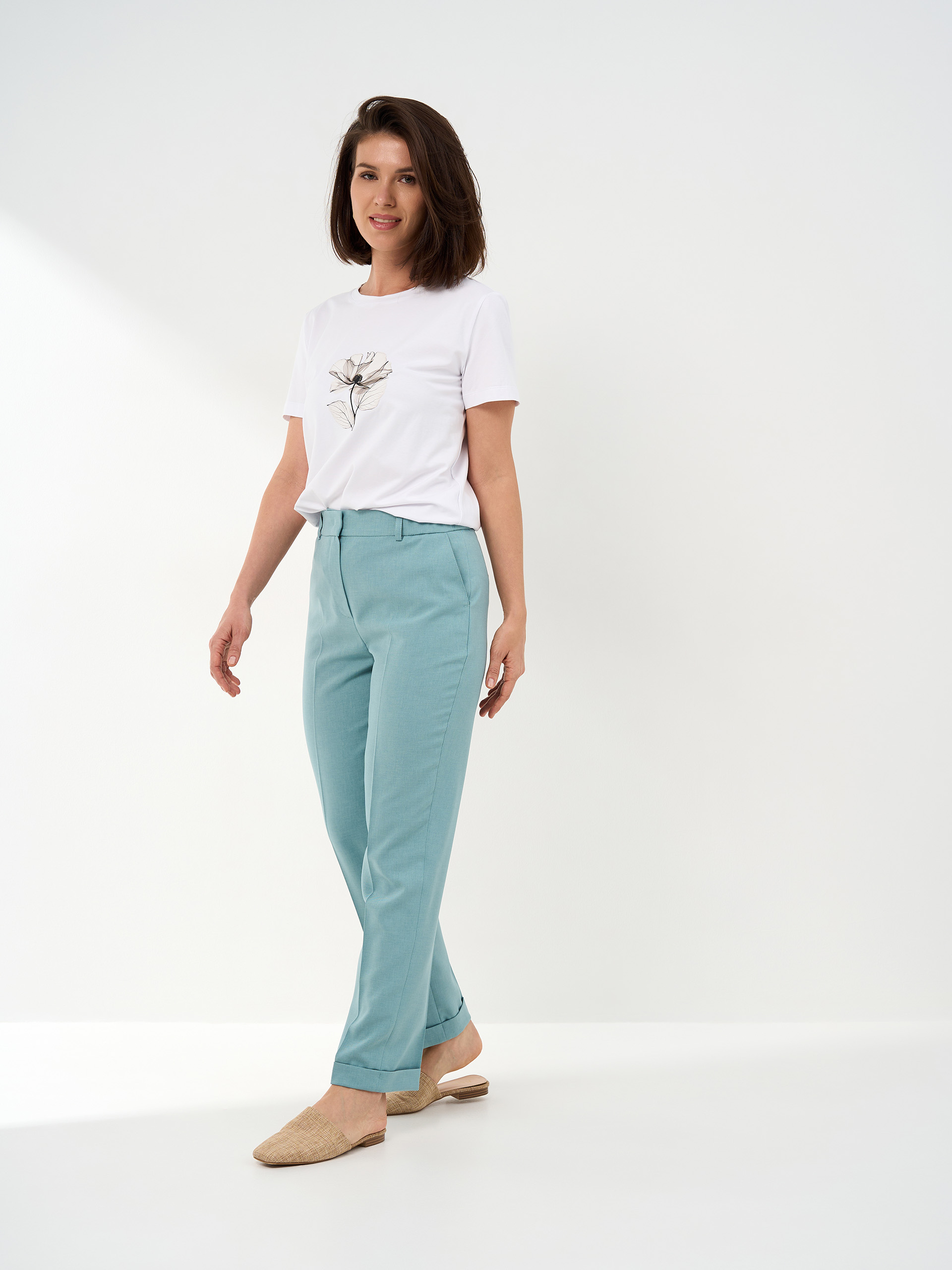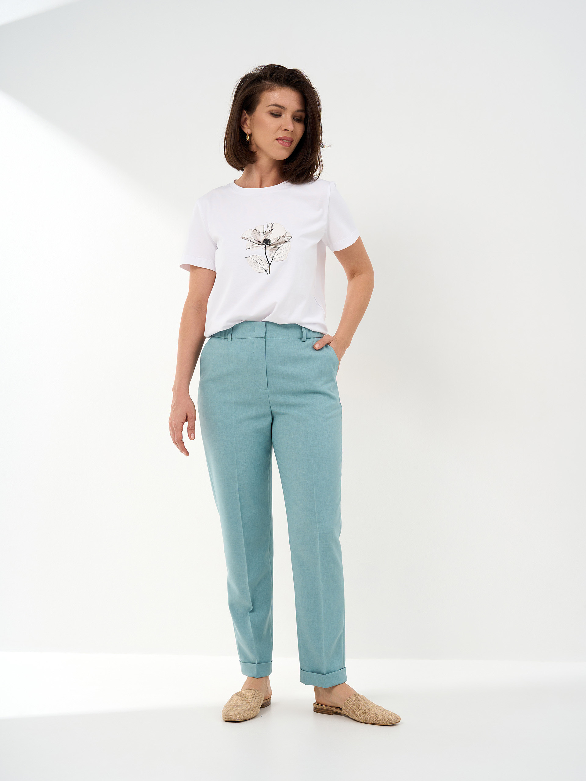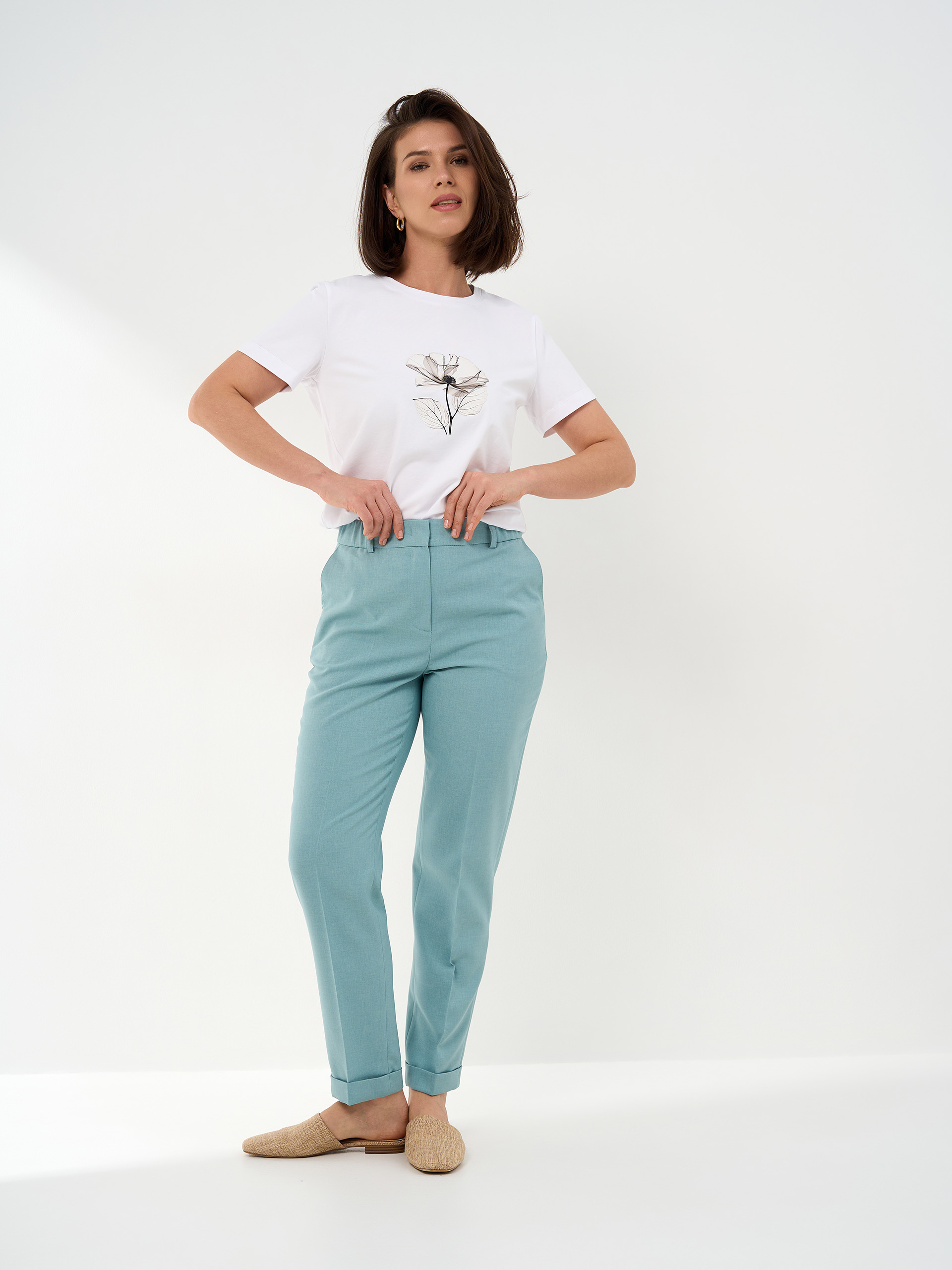 Брюки зауженные книзу, манжеты по низу, в поясе в боковых частях резинка. Смесовая с хлопком легкая немнущаяся ткань.