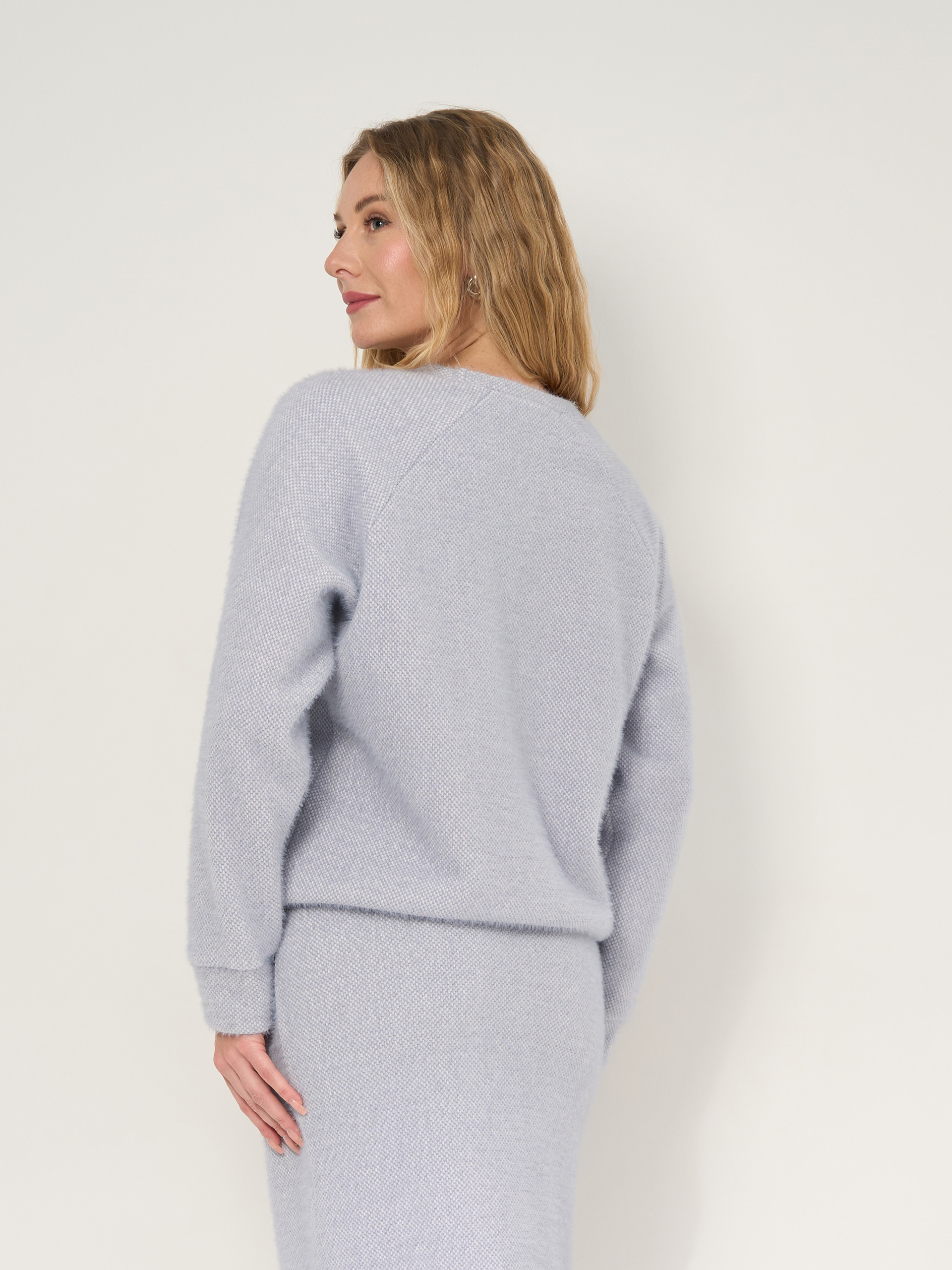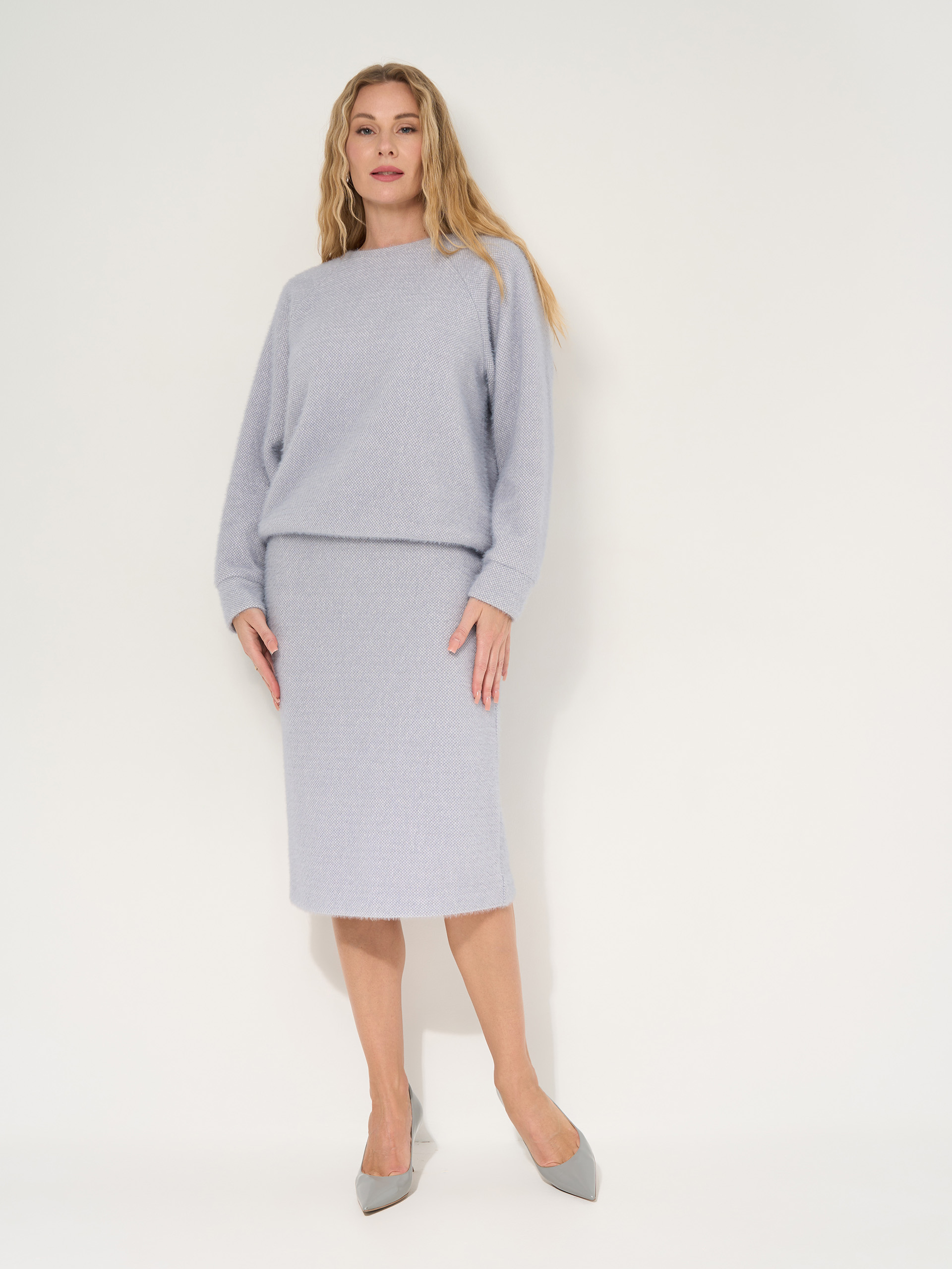 Джемпер с рукавом реглан, резинка по кругу, вискозный нежный трикотаж, с подпушком. Цвет-серо-белый меланж