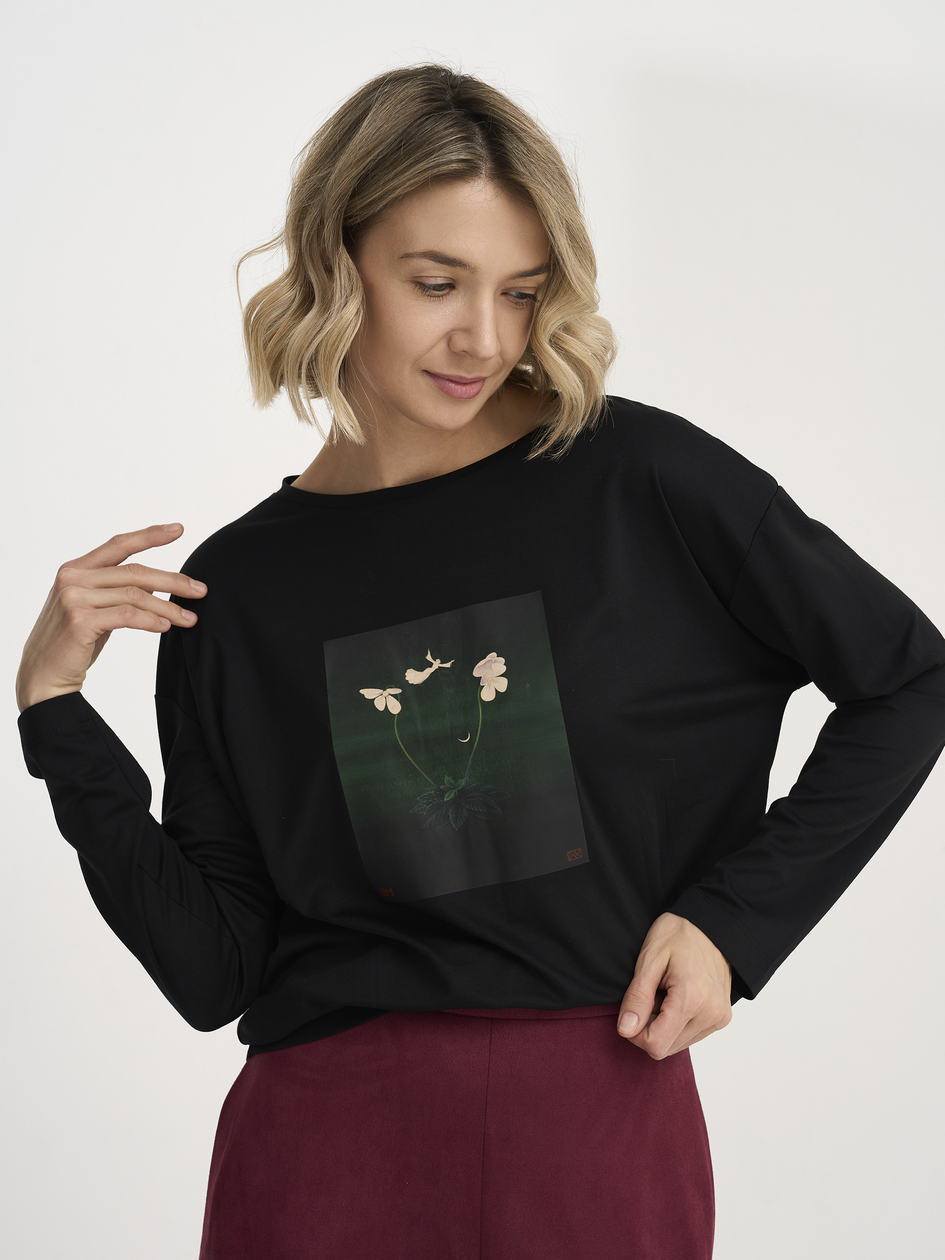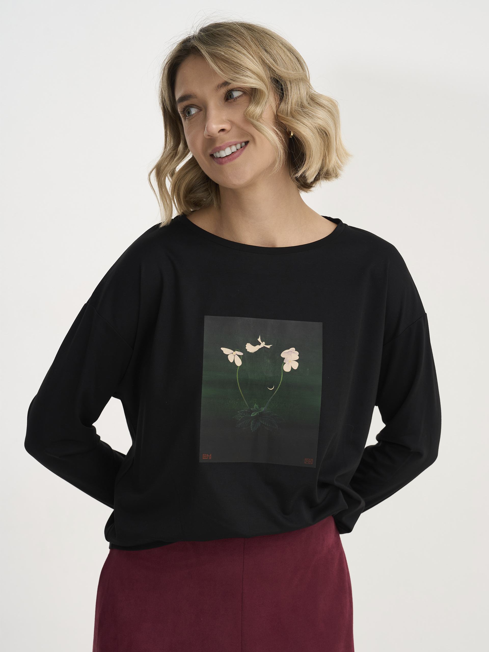 Джемпер из лимитированной коллекции, посвященной работам художника С.Н. Юхтара,  из шелковистого вискозного трикотажа, горловина лодочка, силуэт перевернутый треугольник с изображением картины "Ночной Полет"