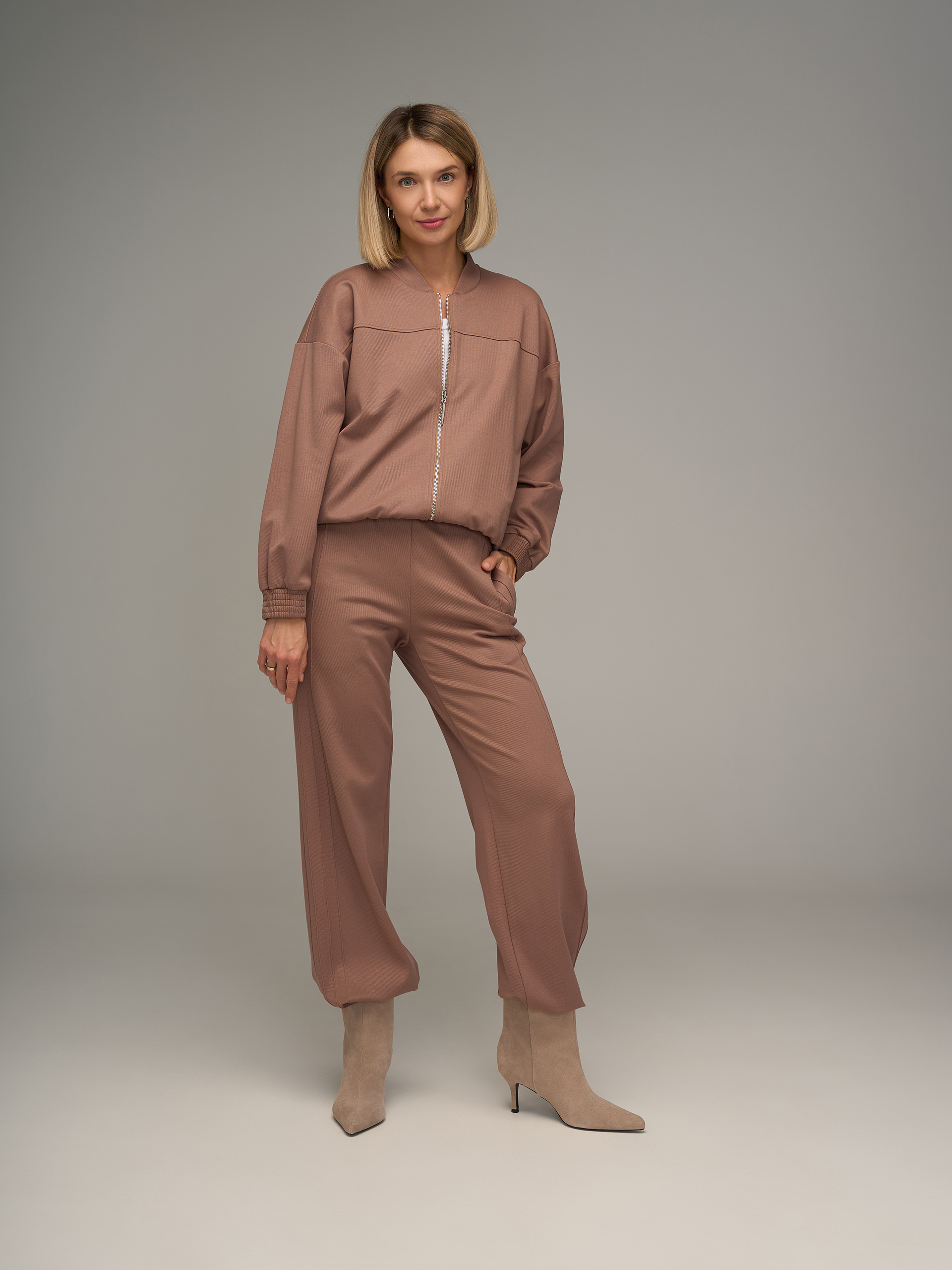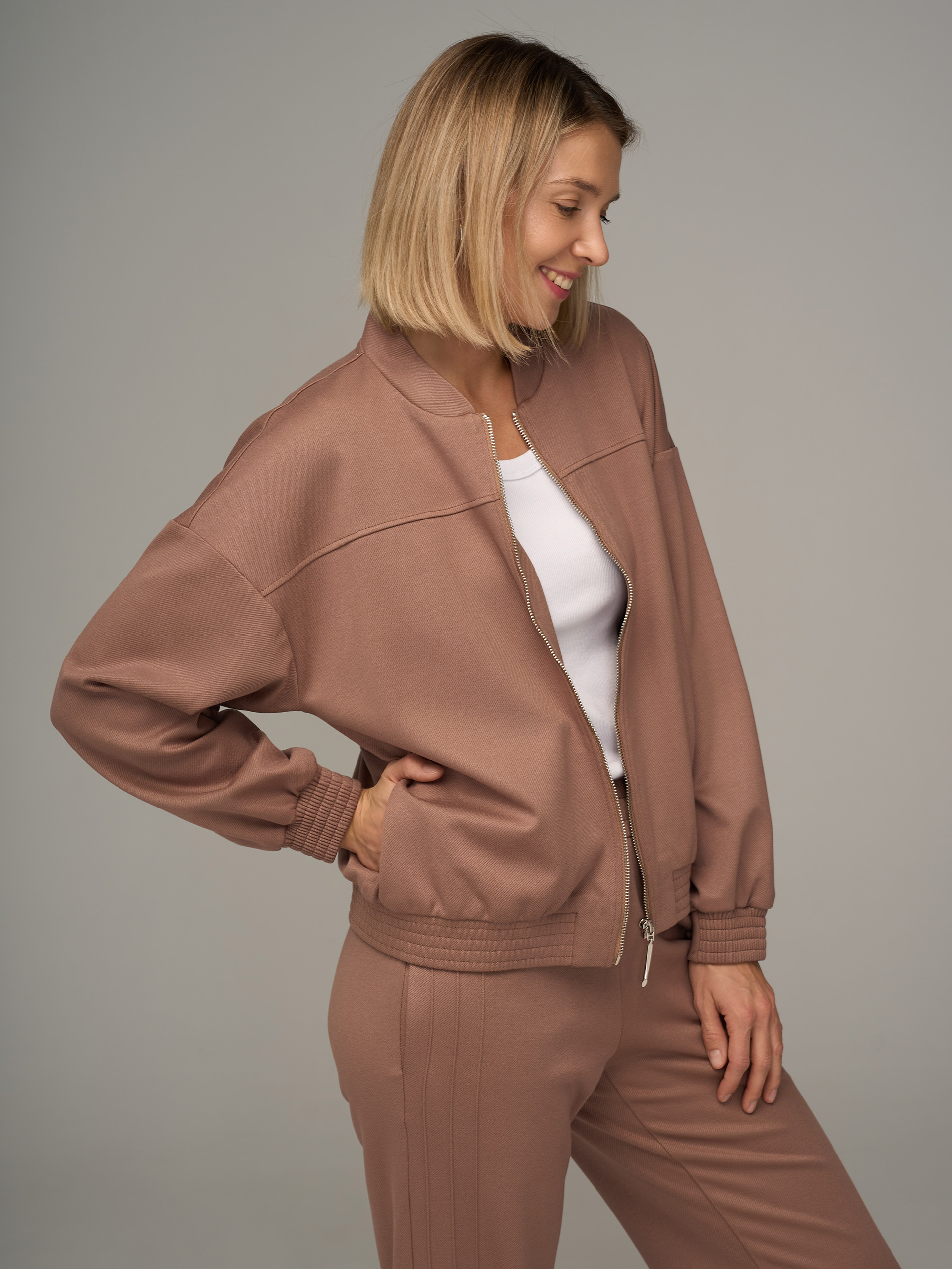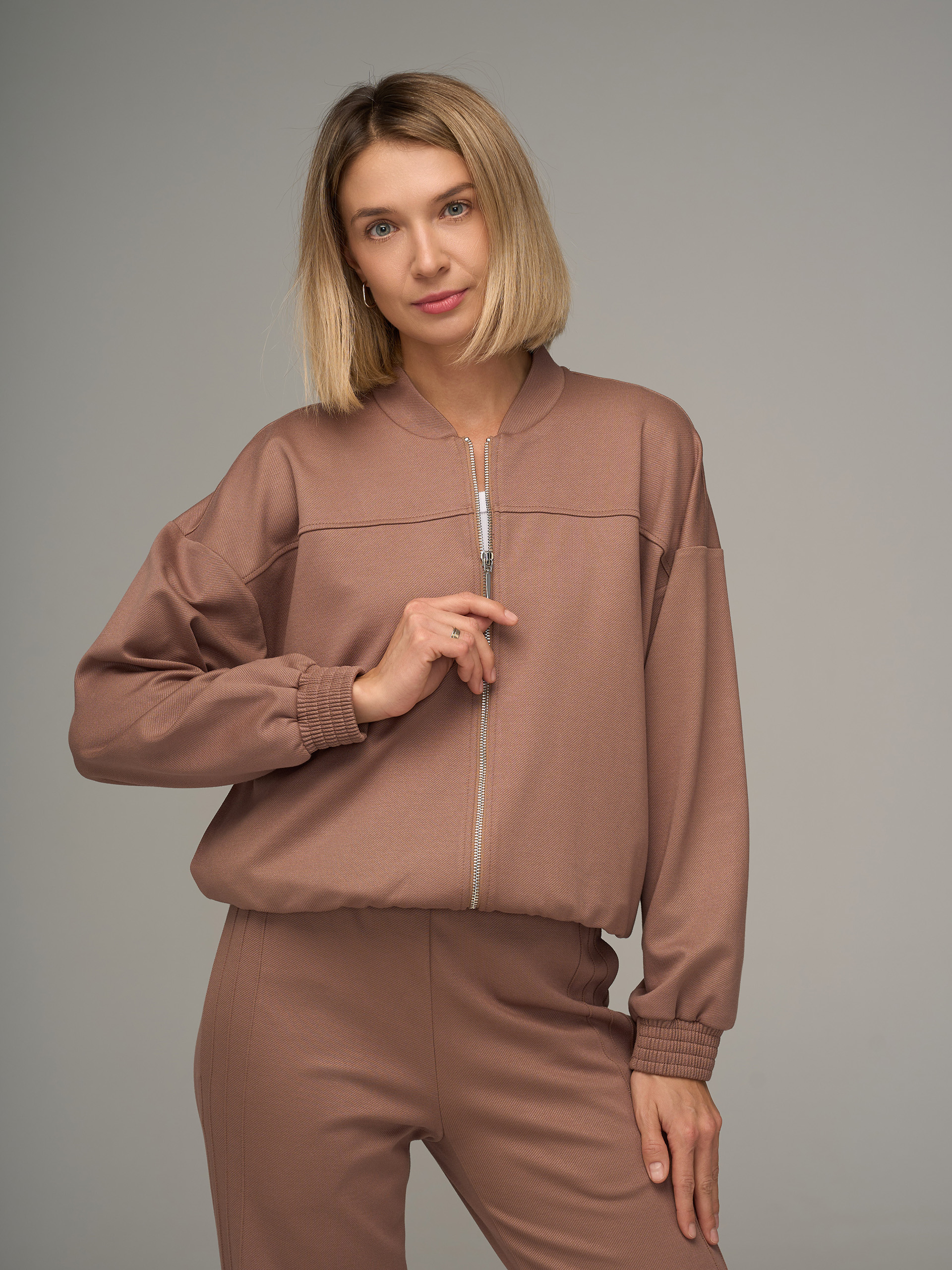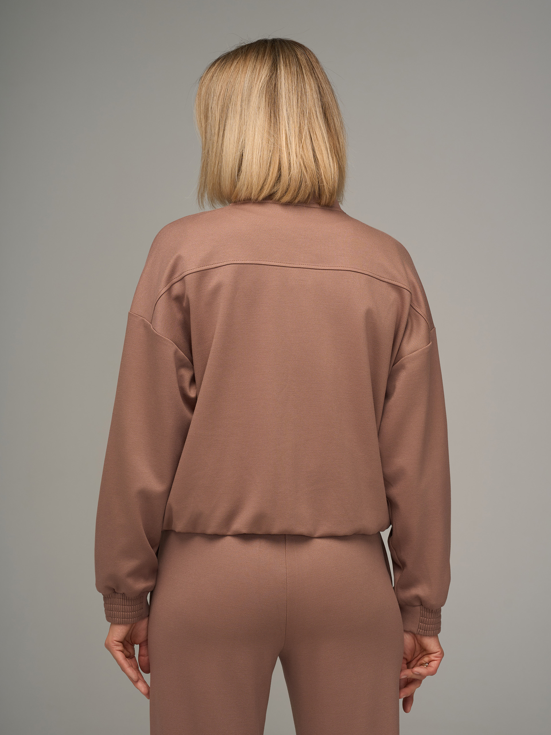 Джемпер на молнии, из трикотажной ткани кофейного цвета, спущенная линия плеча, кокетка спереди и сзади, воротник стойка.